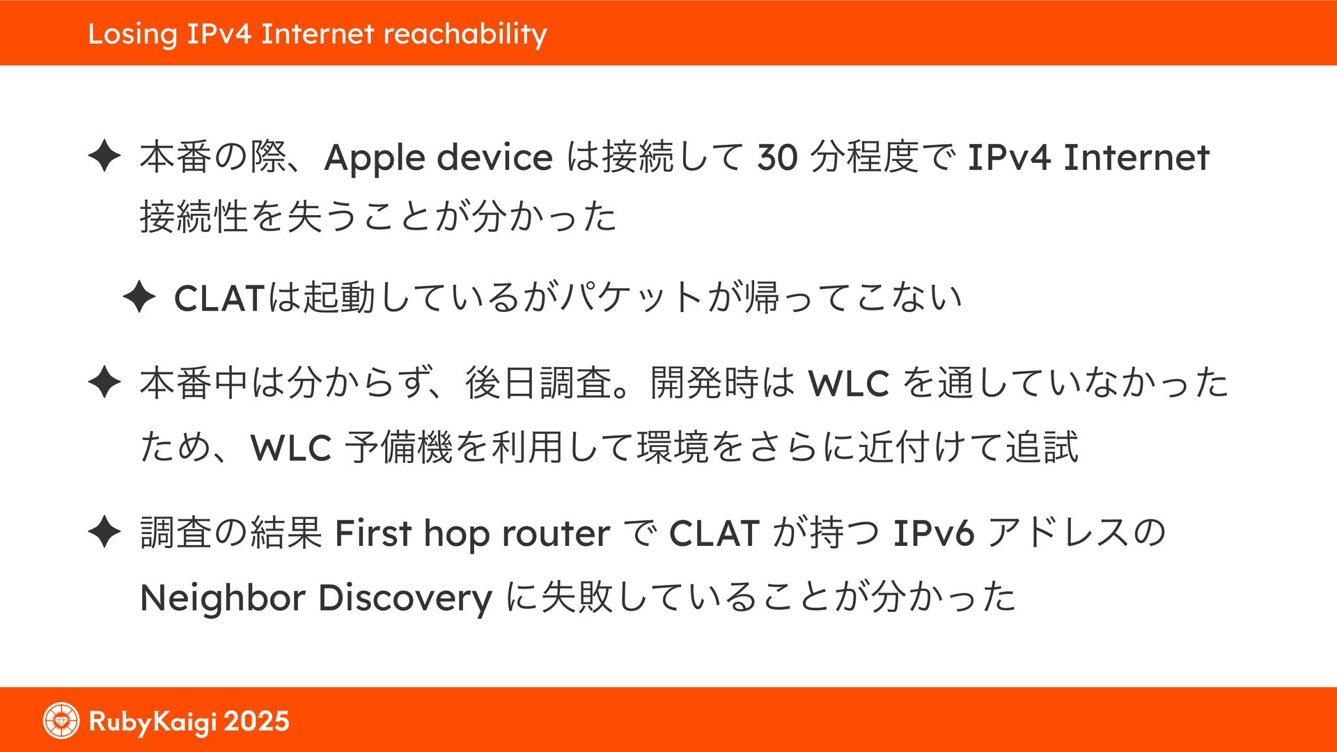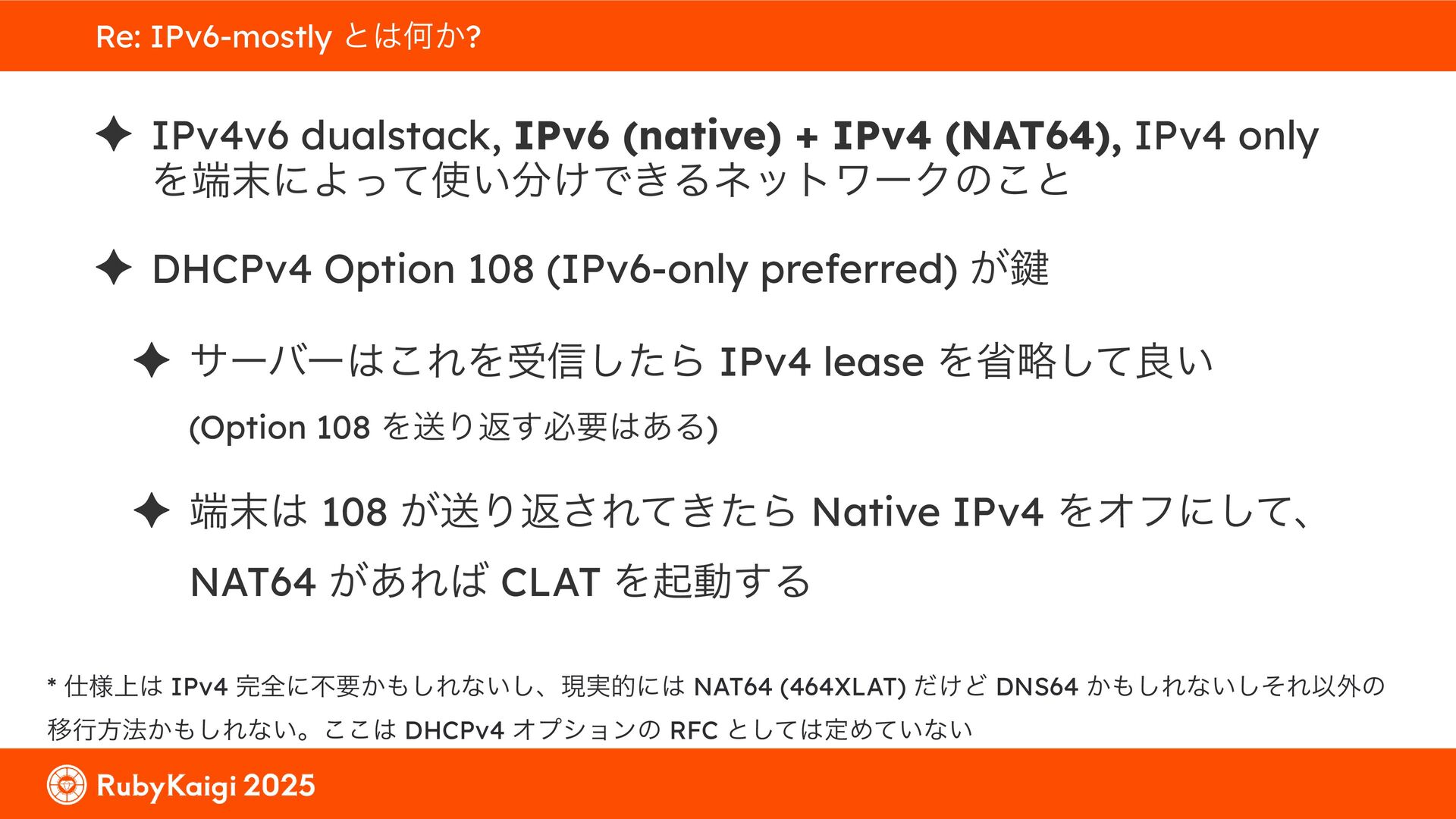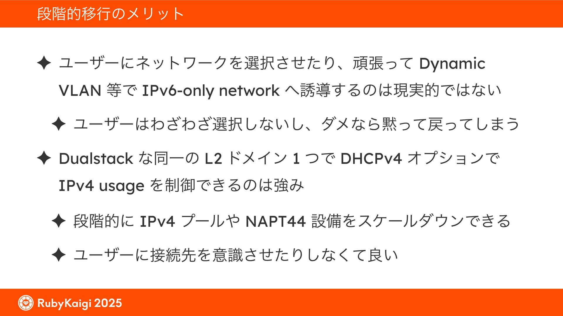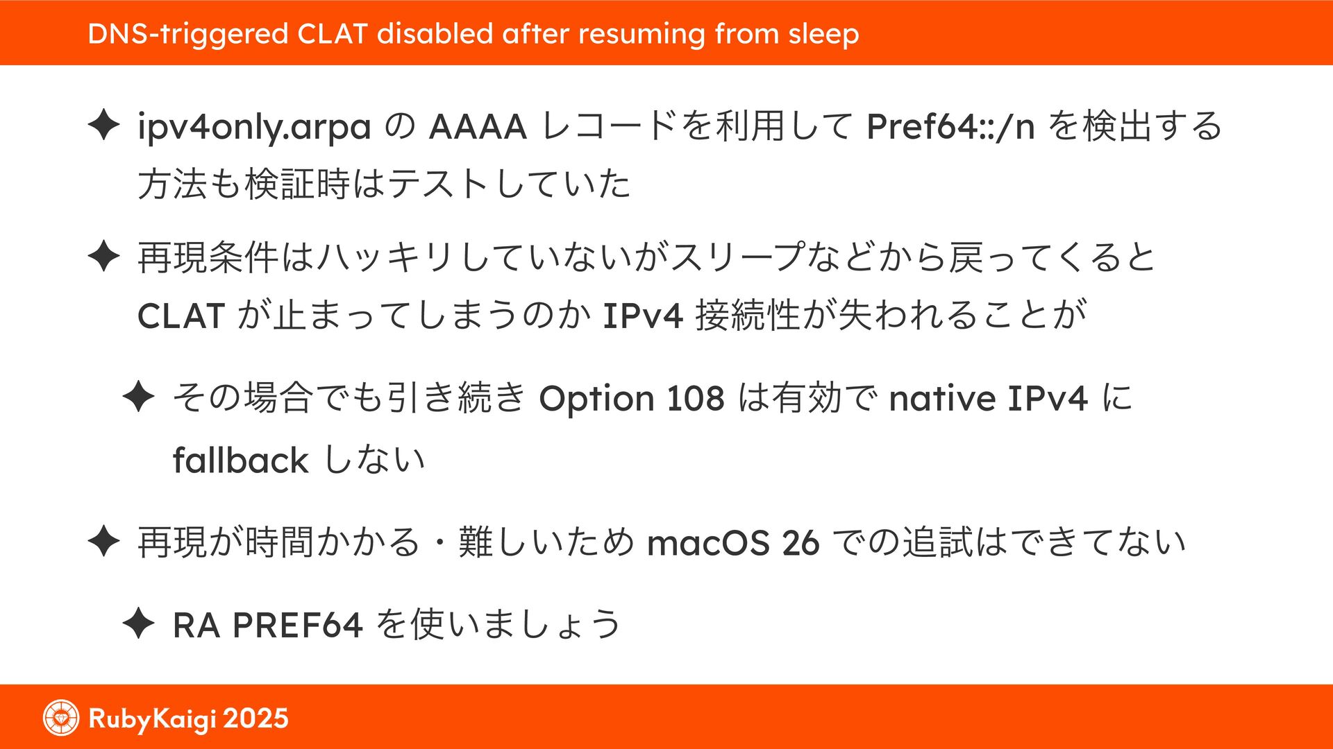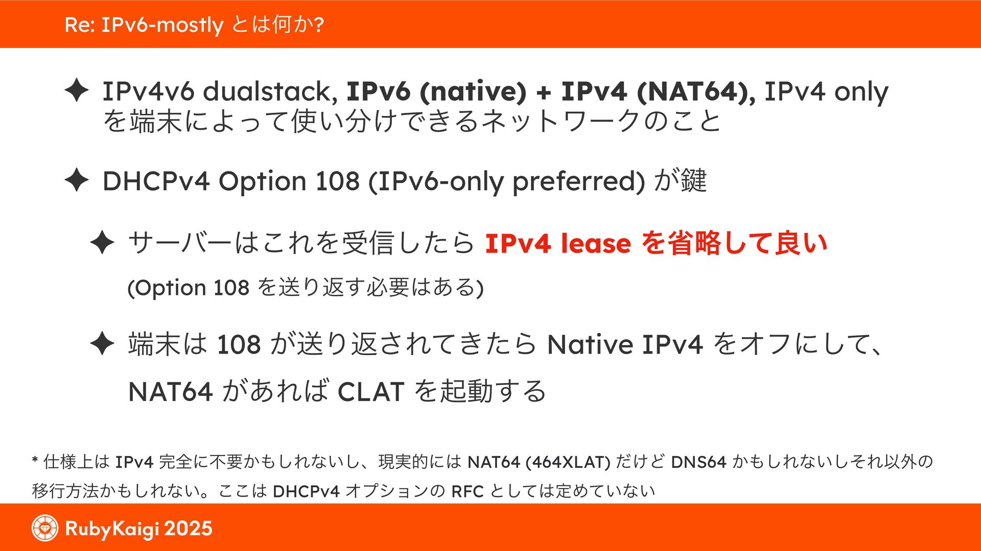 ͕͚ͭΔ Option 82 Ͱ switchport SSID ΛऔΕΔ ✦ ͨͩɺSubnet Ͱఆٛͨ͠ option-data Λ client class Ͱ্ॻ͖ ग़དྷͳ͍ɻͦͷͨΊઃఆΦϓτΠϯํࣜͰߦ͏ Kea Ͱ Option 108 ͷ Scoping https://github.com/ruby-no-kai/rubykaigi-net/blob/master/k8s/dhcp/config/class_main_ssid.libsonnet { name: 'main_ssid', test: "(split(relay4[2].hex, ':', 2) == 'RubyKaigi 2025')" + // SSID " or (relay4[1].hex == 'cs-01-venue:ge-0/0/0.0:usr')", // switchport 'only-if-required': true, 'option-data': [{ name: 'v6-only-preferred', data: '1800' }], }