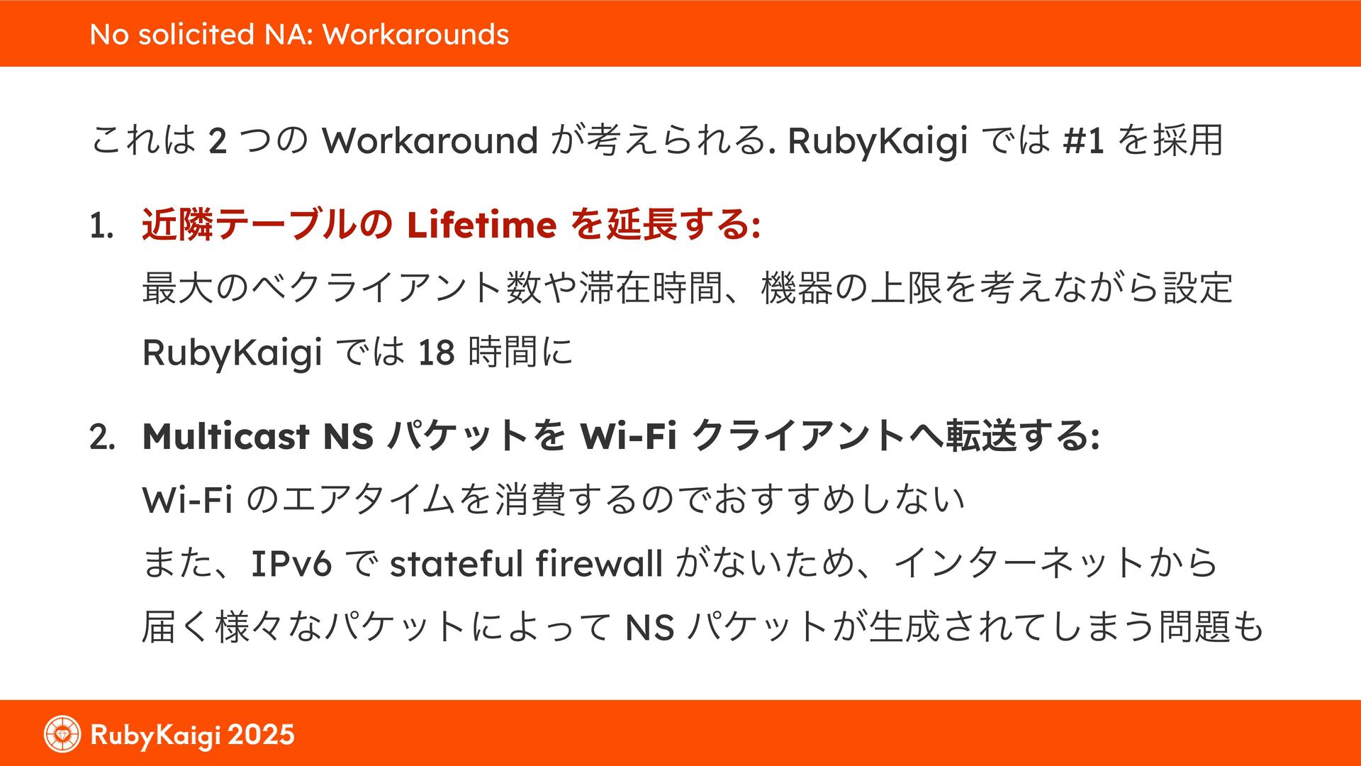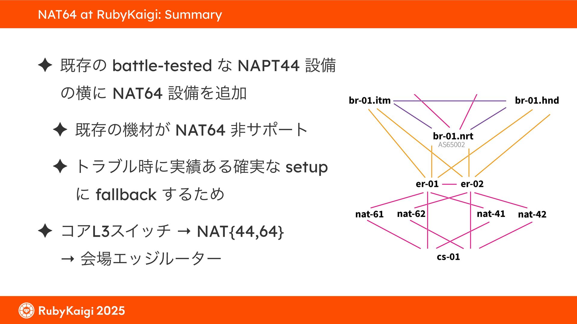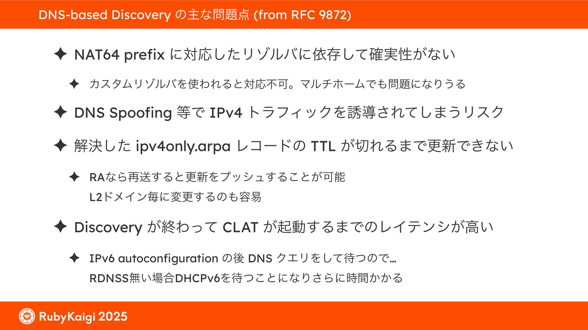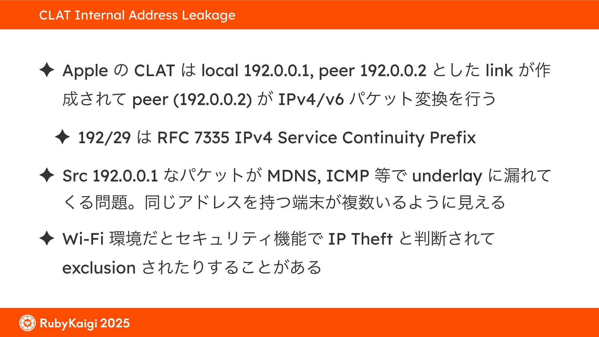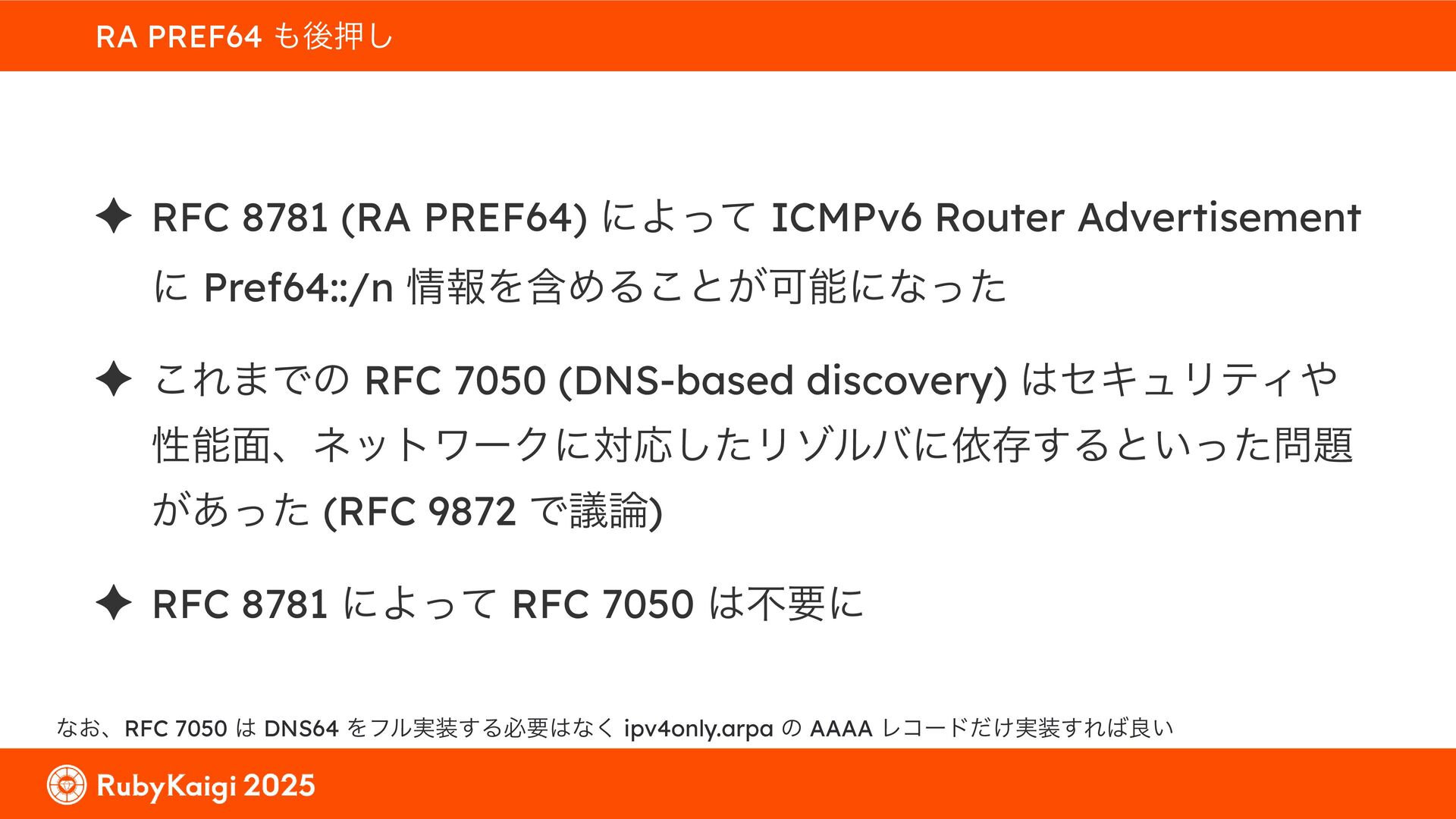 ͕͚ͭΔ Option 82 Ͱ switchport SSID ΛऔΕΔ ✦ ͨͩɺSubnet Ͱఆٛͨ͠ option-data Λ client class Ͱ্ॻ͖ ग़དྷͳ͍ɻͦͷͨΊઃఆΦϓτΠϯํࣜͰߦ͏ Kea Ͱ Option 108 ͷ Scoping https://github.com/ruby-no-kai/rubykaigi-net/blob/master/k8s/dhcp/config/class_main_ssid.libsonnet { name: 'main_ssid', test: "(split(relay4[2].hex, ':', 2) == 'RubyKaigi 2025')" + // SSID " or (relay4[1].hex == 'cs-01-venue:ge-0/0/0.0:usr')", // switchport 'only-if-required': true, 'option-data': [{ name: 'v6-only-preferred', data: '1800' }], }