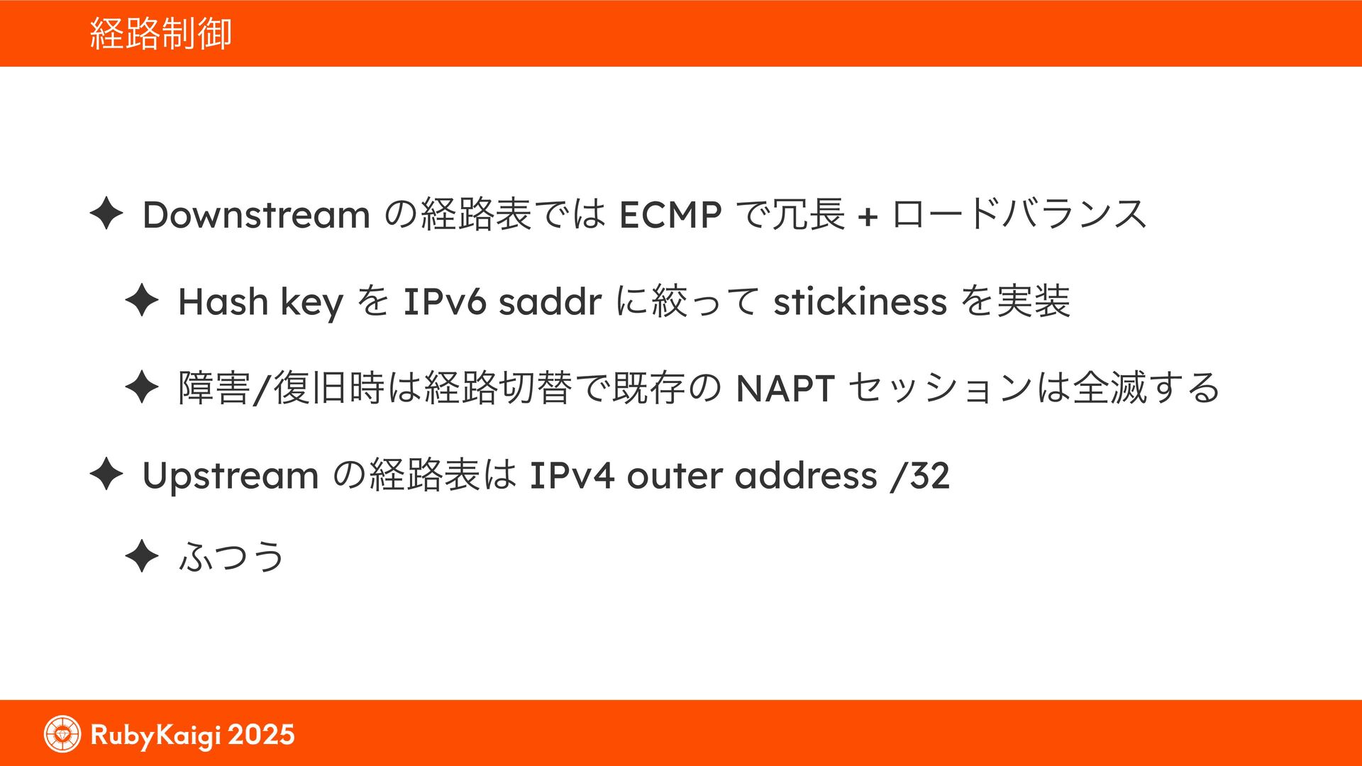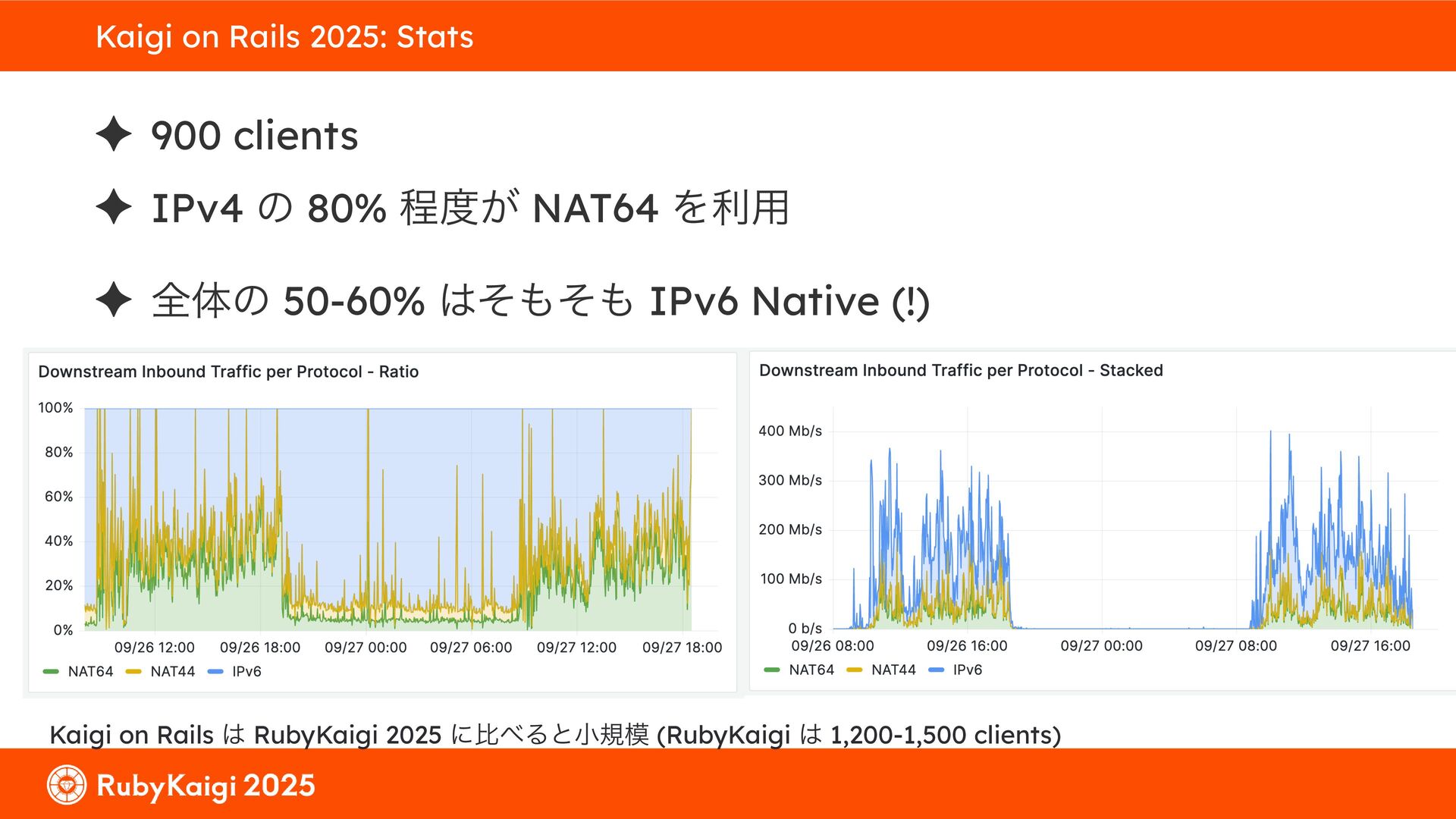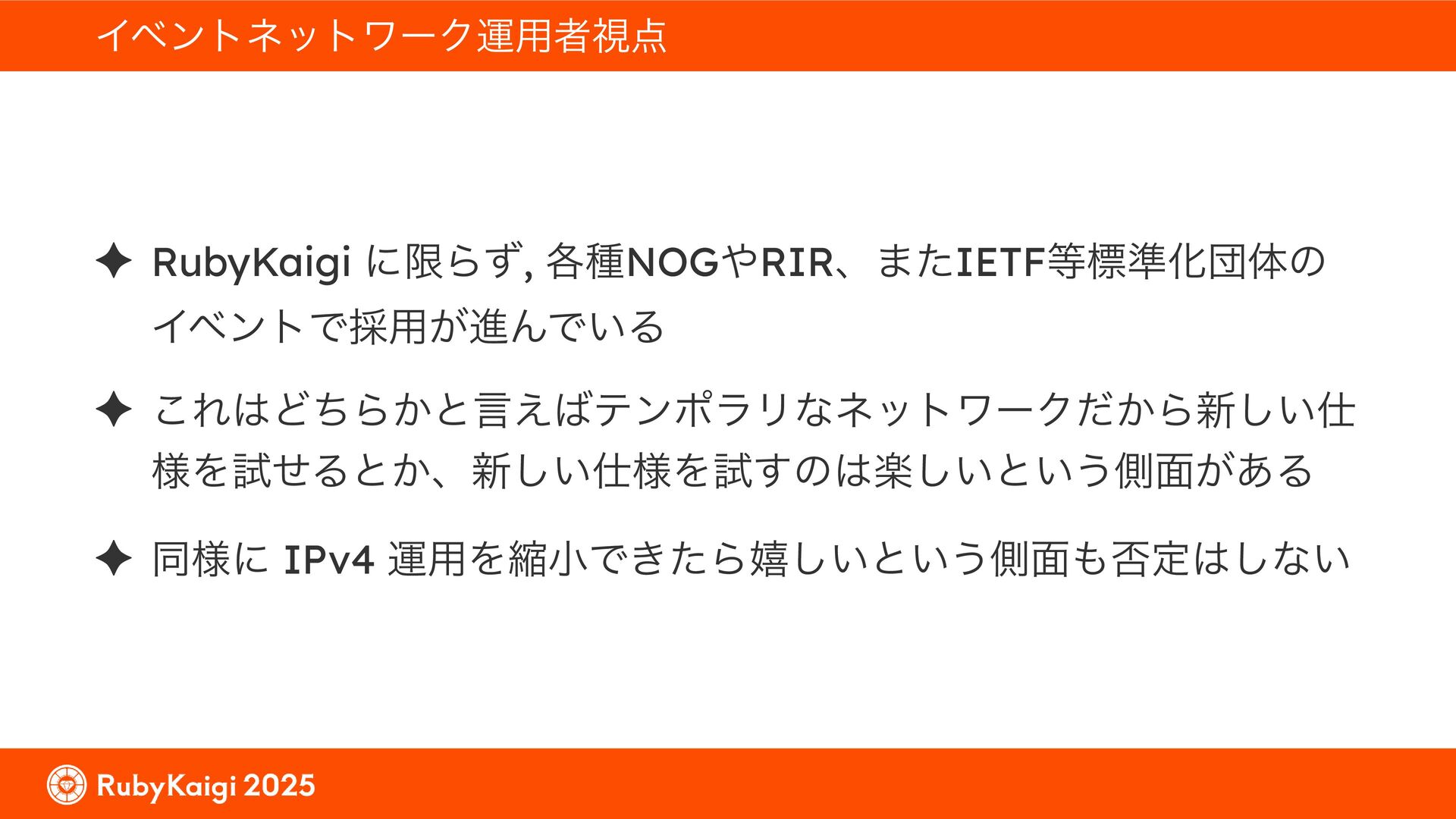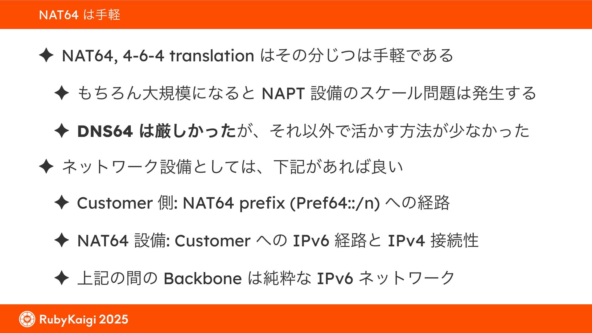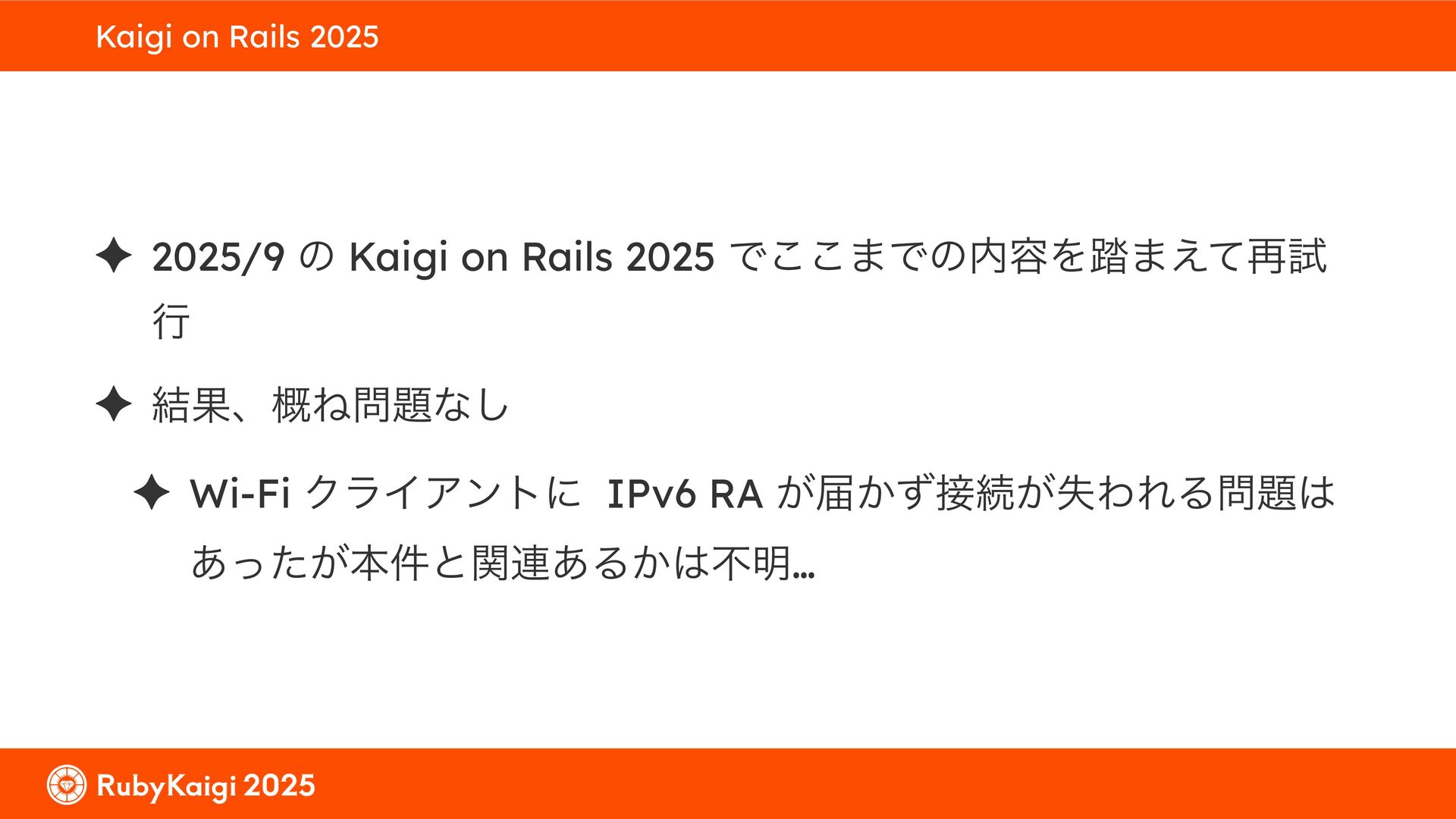 ͕͚ͭΔ Option 82 Ͱ switchport SSID ΛऔΕΔ ✦ ͨͩɺSubnet Ͱఆٛͨ͠ option-data Λ client class Ͱ্ॻ͖ ग़དྷͳ͍ɻͦͷͨΊઃఆΦϓτΠϯํࣜͰߦ͏ Kea Ͱ Option 108 ͷ Scoping https://github.com/ruby-no-kai/rubykaigi-net/blob/master/k8s/dhcp/config/class_main_ssid.libsonnet { name: 'main_ssid', test: "(split(relay4[2].hex, ':', 2) == 'RubyKaigi 2025')" + // SSID " or (relay4[1].hex == 'cs-01-venue:ge-0/0/0.0:usr')", // switchport 'only-if-required': true, 'option-data': [{ name: 'v6-only-preferred', data: '1800' }], }