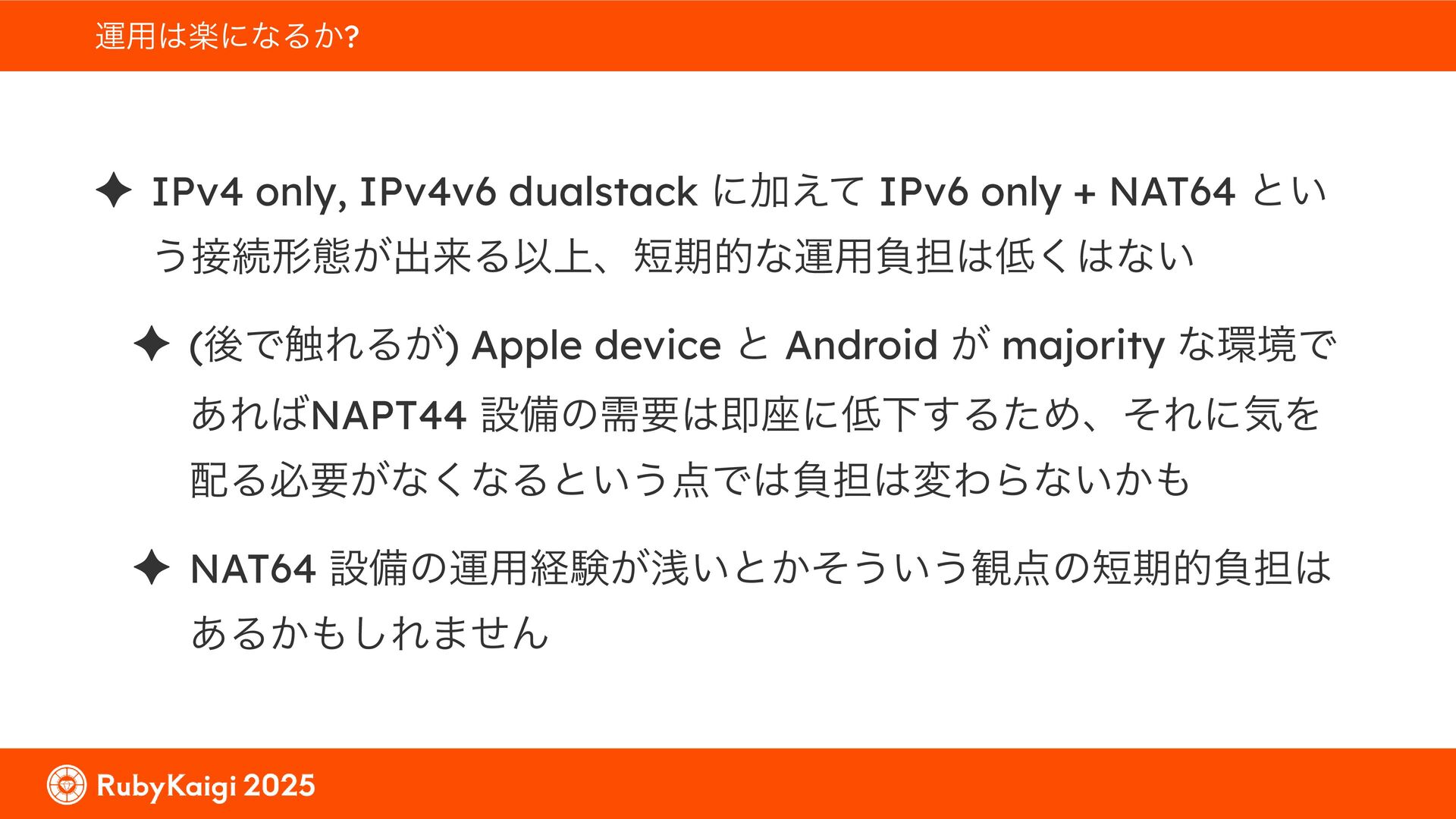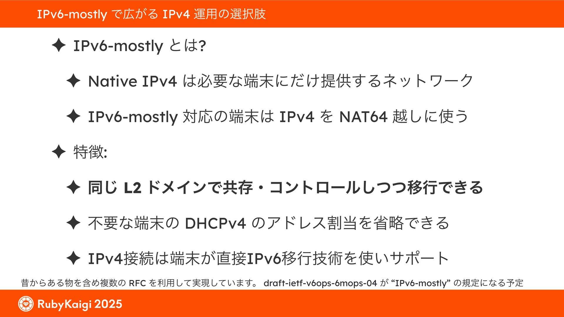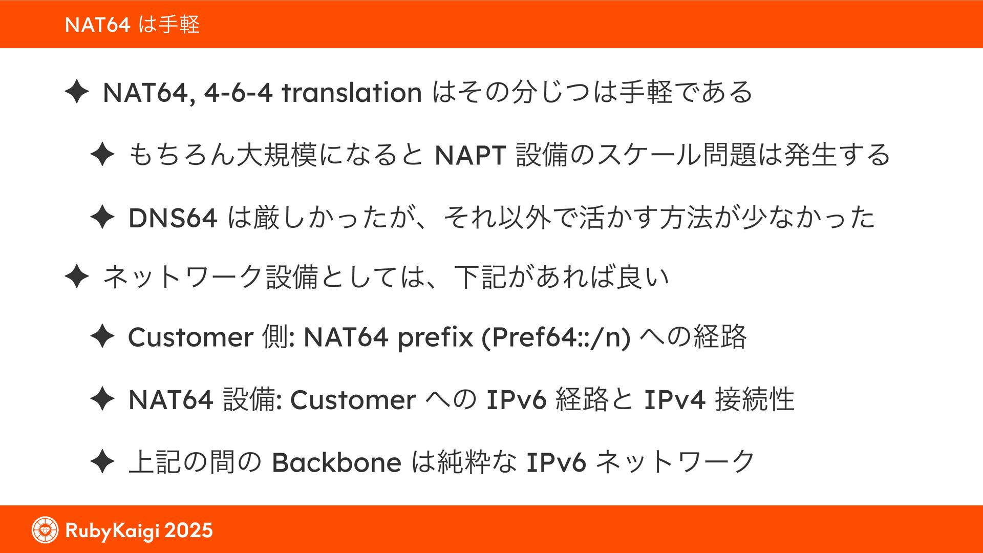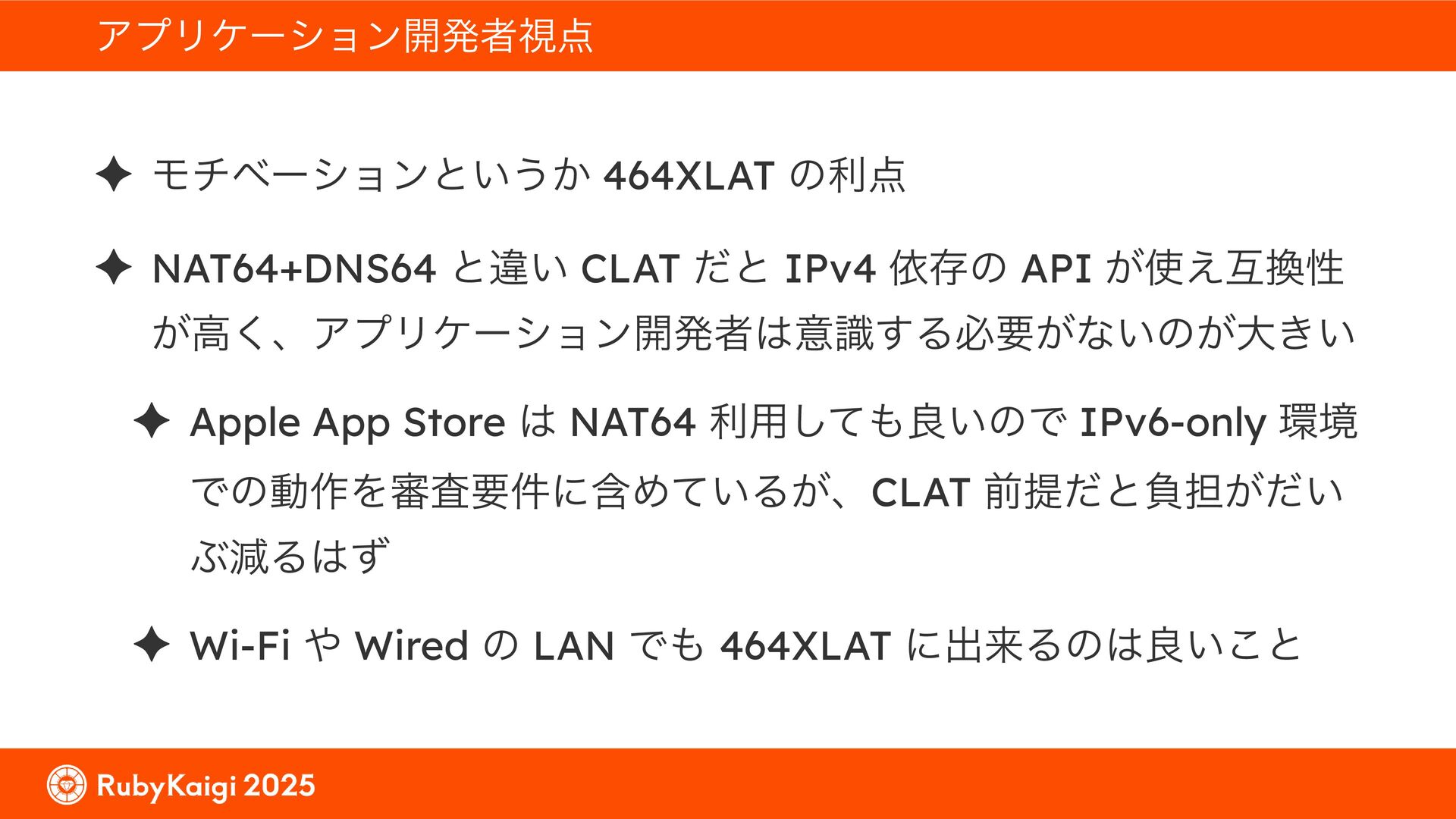 ͕͚ͭΔ Option 82 Ͱ switchport SSID ΛऔΕΔ ✦ ͨͩɺSubnet Ͱఆٛͨ͠ option-data Λ client class Ͱ্ॻ͖ ग़དྷͳ͍ɻͦͷͨΊઃఆΦϓτΠϯํࣜͰߦ͏ Kea Ͱ Option 108 ͷ Scoping https://github.com/ruby-no-kai/rubykaigi-net/blob/master/k8s/dhcp/config/class_main_ssid.libsonnet { name: 'main_ssid', test: "(split(relay4[2].hex, ':', 2) == 'RubyKaigi 2025')" + // SSID " or (relay4[1].hex == 'cs-01-venue:ge-0/0/0.0:usr')", // switchport 'only-if-required': true, 'option-data': [{ name: 'v6-only-preferred', data: '1800' }], }