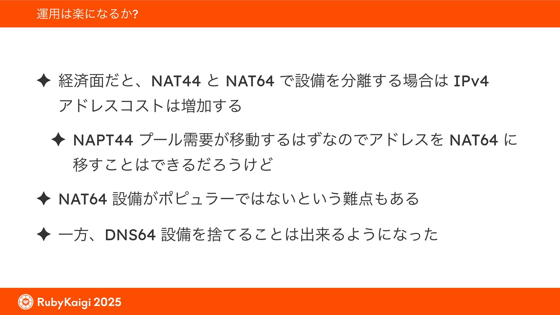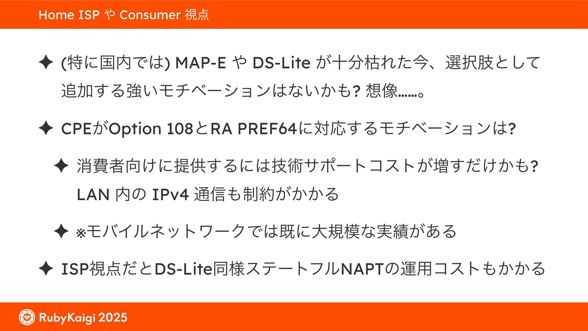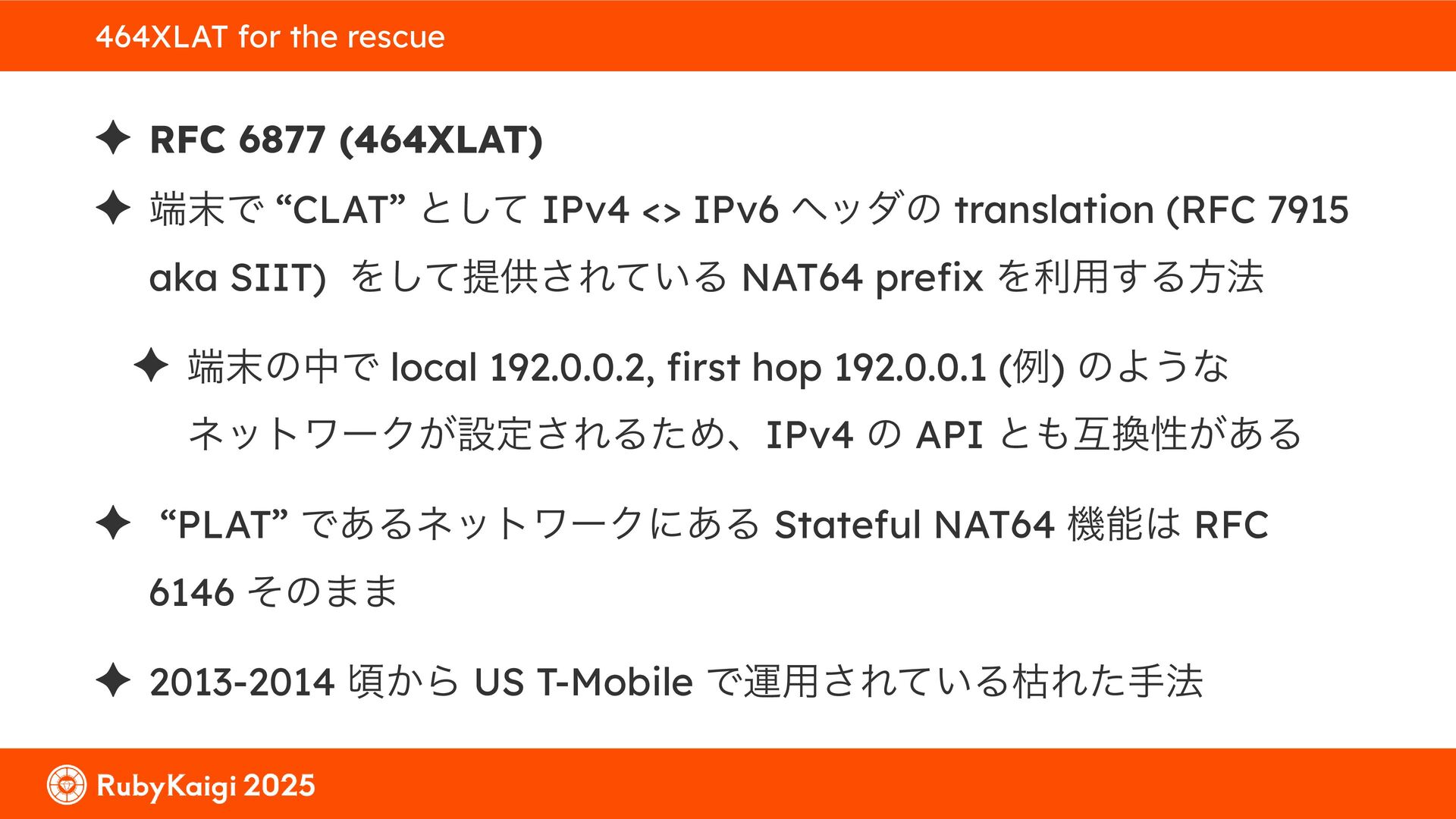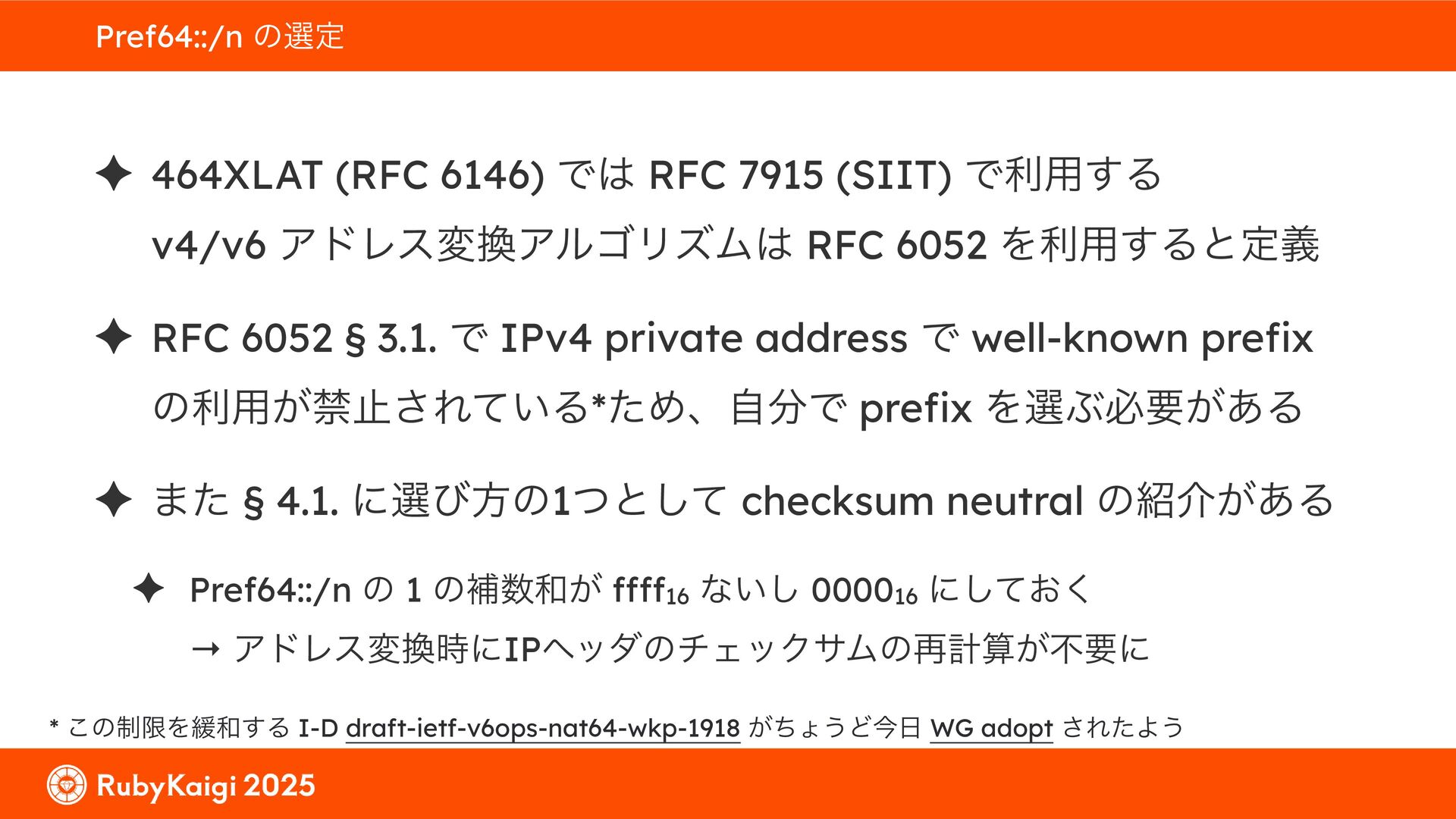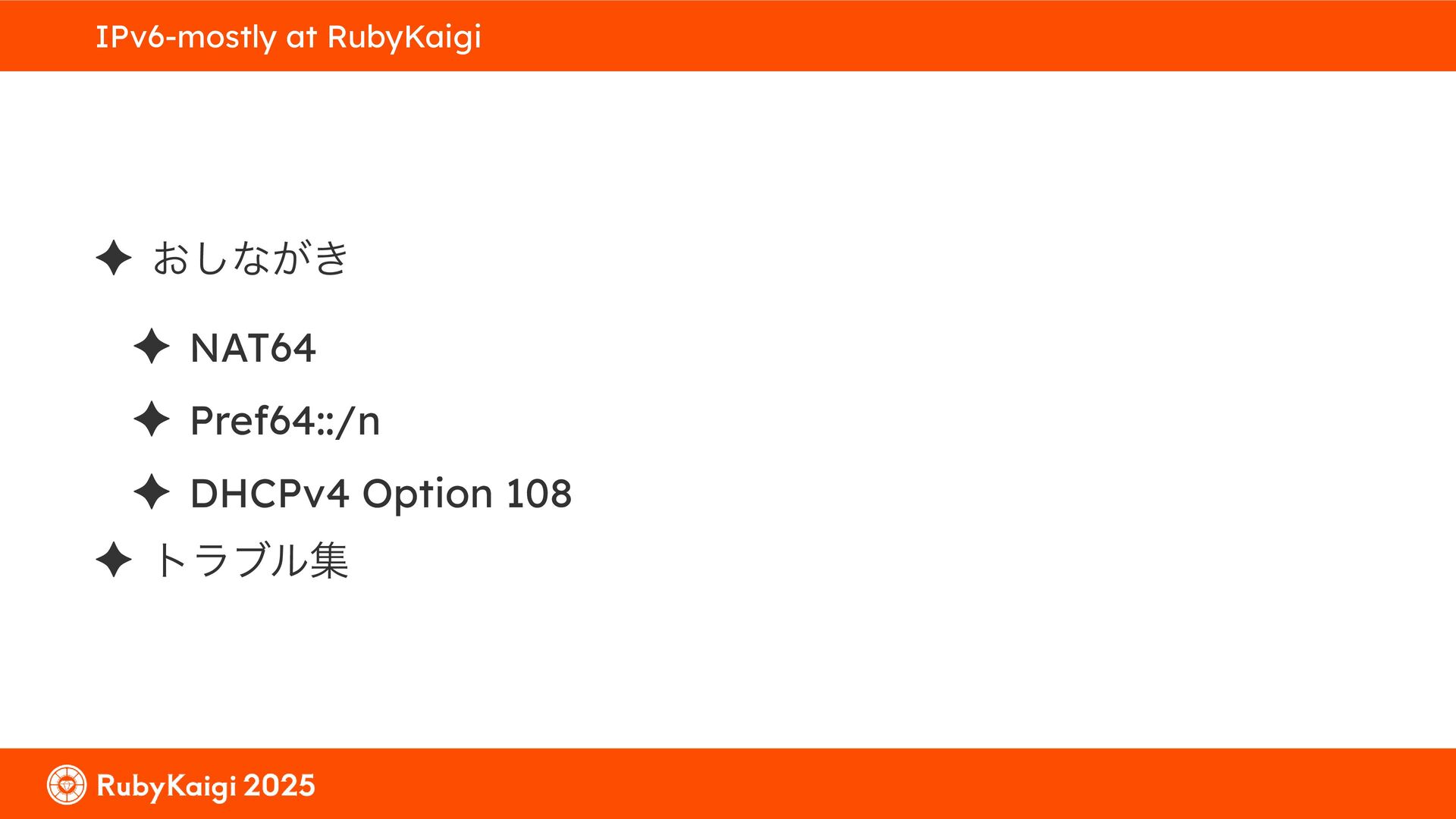 ͕͚ͭΔ Option 82 Ͱ switchport SSID ΛऔΕΔ ✦ ͨͩɺSubnet Ͱఆٛͨ͠ option-data Λ client class Ͱ্ॻ͖ ग़དྷͳ͍ɻͦͷͨΊઃఆΦϓτΠϯํࣜͰߦ͏ Kea Ͱ Option 108 ͷ Scoping https://github.com/ruby-no-kai/rubykaigi-net/blob/master/k8s/dhcp/config/class_main_ssid.libsonnet { name: 'main_ssid', test: "(split(relay4[2].hex, ':', 2) == 'RubyKaigi 2025')" + // SSID " or (relay4[1].hex == 'cs-01-venue:ge-0/0/0.0:usr')", // switchport 'only-if-required': true, 'option-data': [{ name: 'v6-only-preferred', data: '1800' }], }