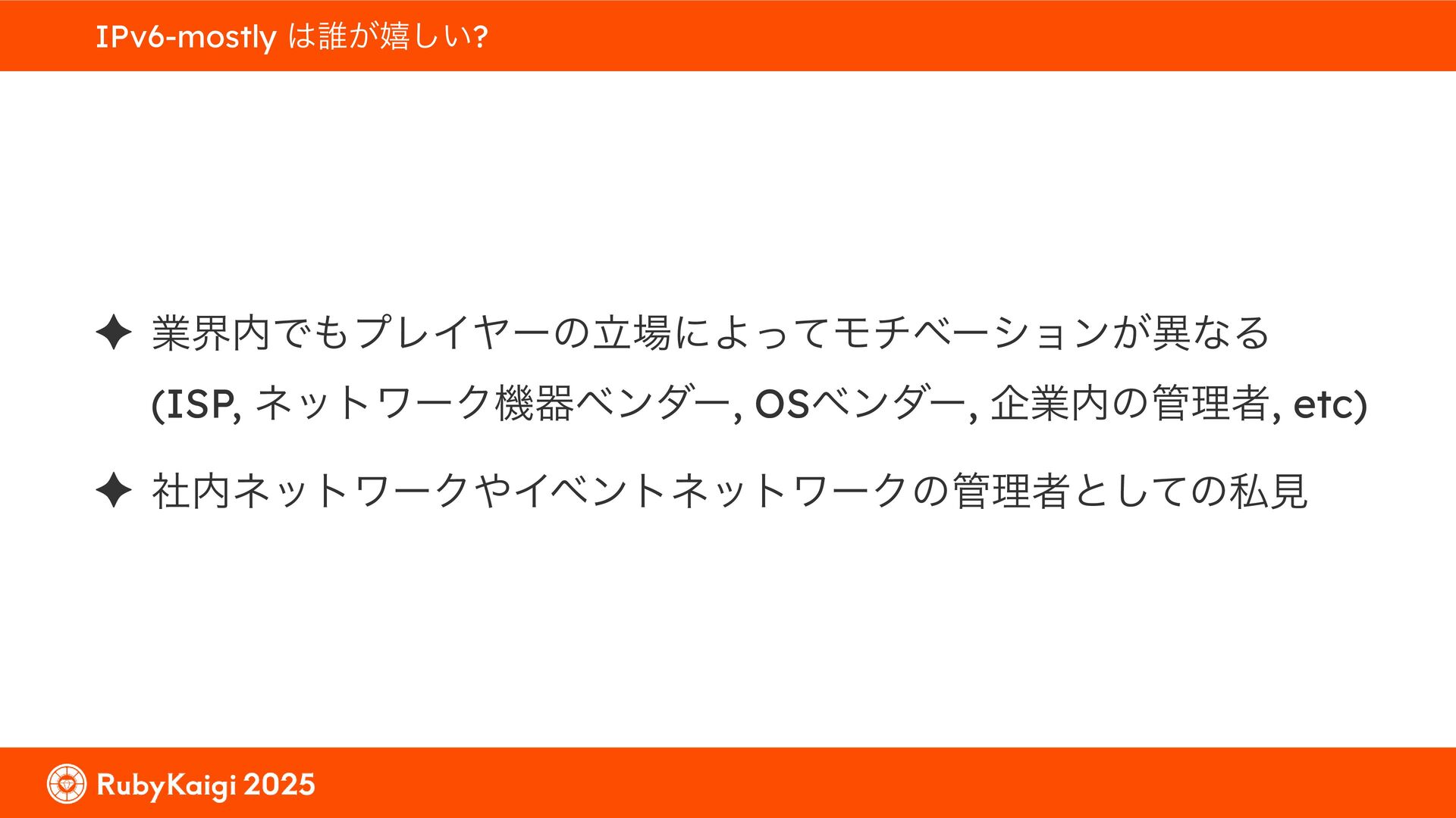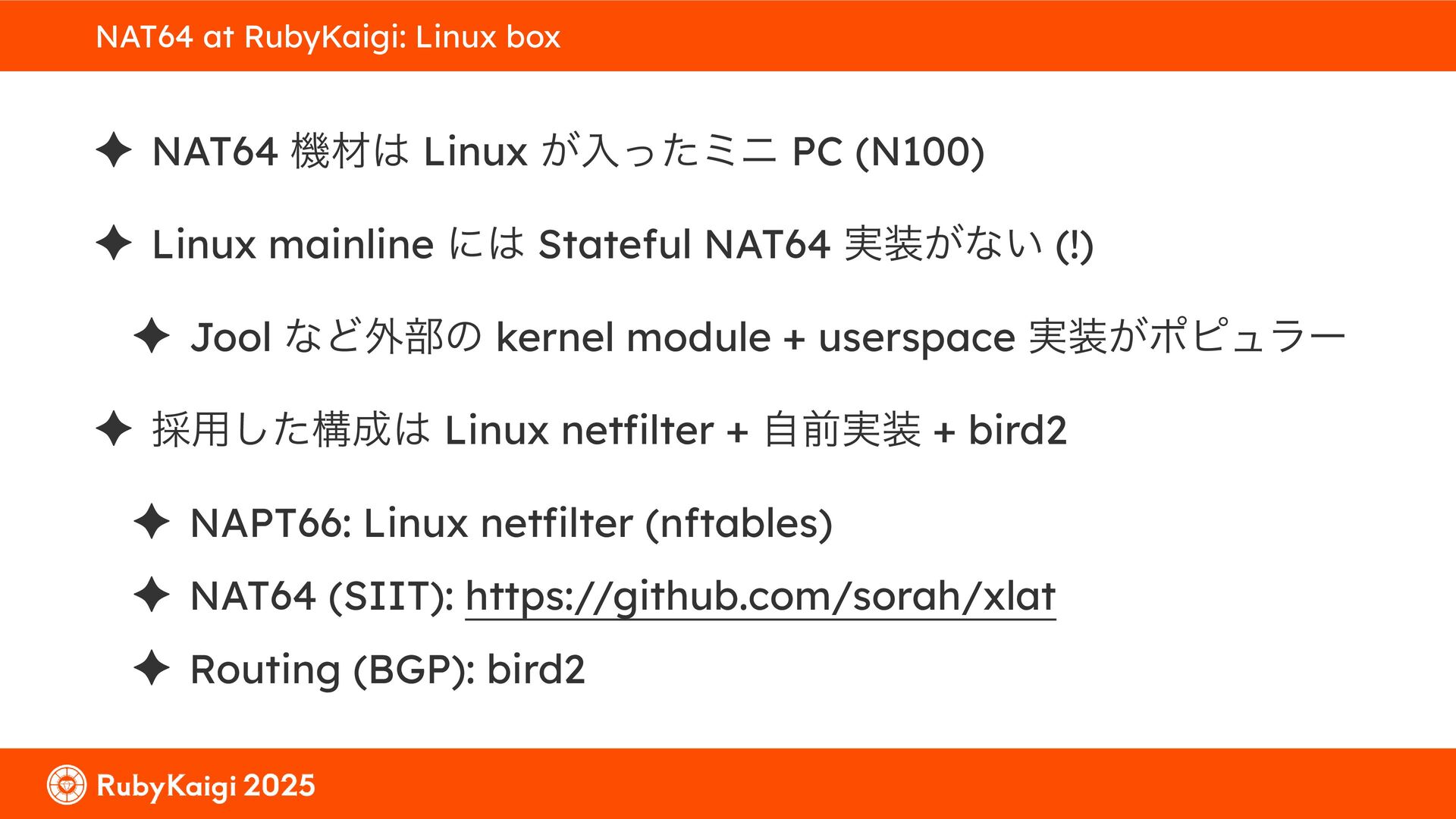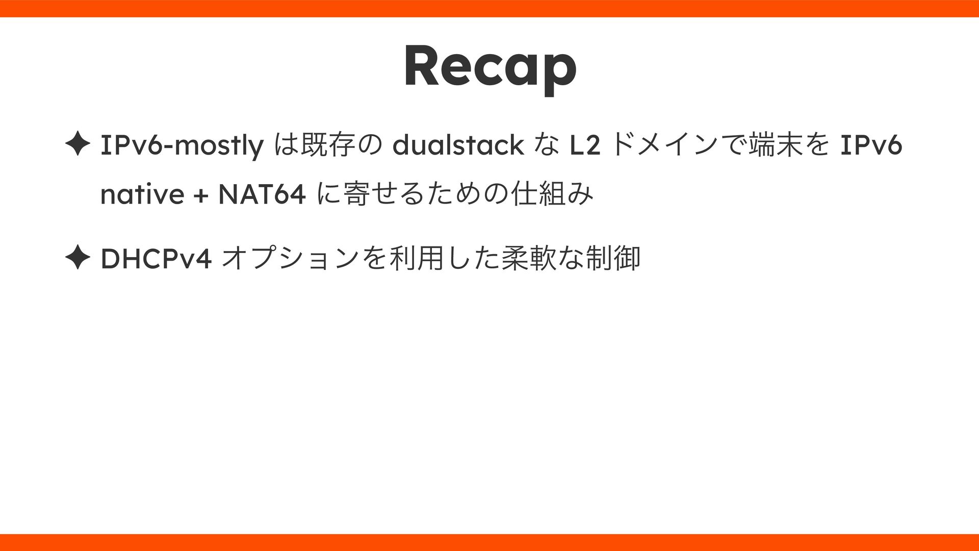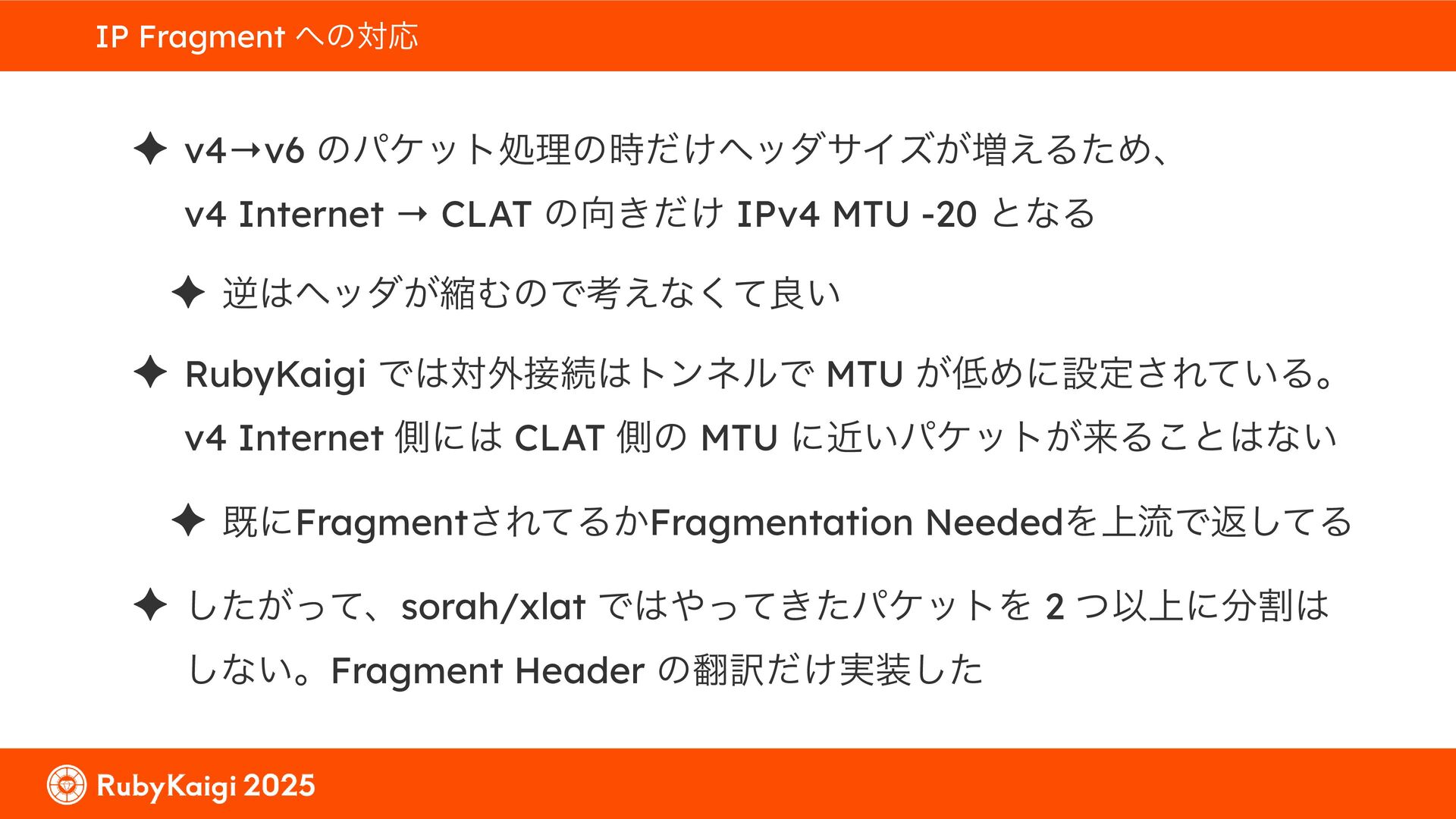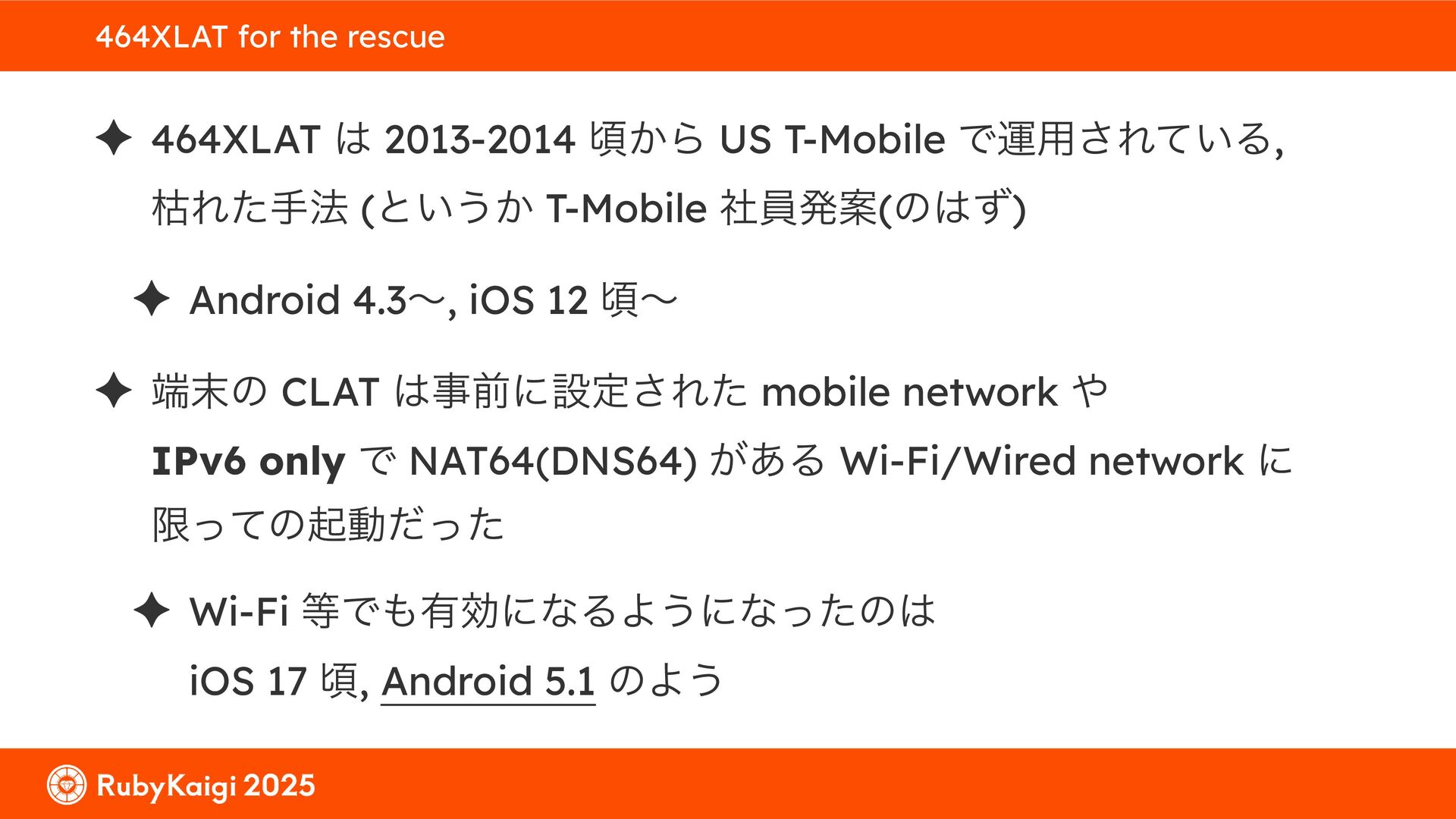 ͕͚ͭΔ Option 82 Ͱ switchport SSID ΛऔΕΔ ✦ ͨͩɺSubnet Ͱఆٛͨ͠ option-data Λ client class Ͱ্ॻ͖ ग़དྷͳ͍ɻͦͷͨΊઃఆΦϓτΠϯํࣜͰߦ͏ Kea Ͱ Option 108 ͷ Scoping https://github.com/ruby-no-kai/rubykaigi-net/blob/master/k8s/dhcp/config/class_main_ssid.libsonnet { name: 'main_ssid', test: "(split(relay4[2].hex, ':', 2) == 'RubyKaigi 2025')" + // SSID " or (relay4[1].hex == 'cs-01-venue:ge-0/0/0.0:usr')", // switchport 'only-if-required': true, 'option-data': [{ name: 'v6-only-preferred', data: '1800' }], }
