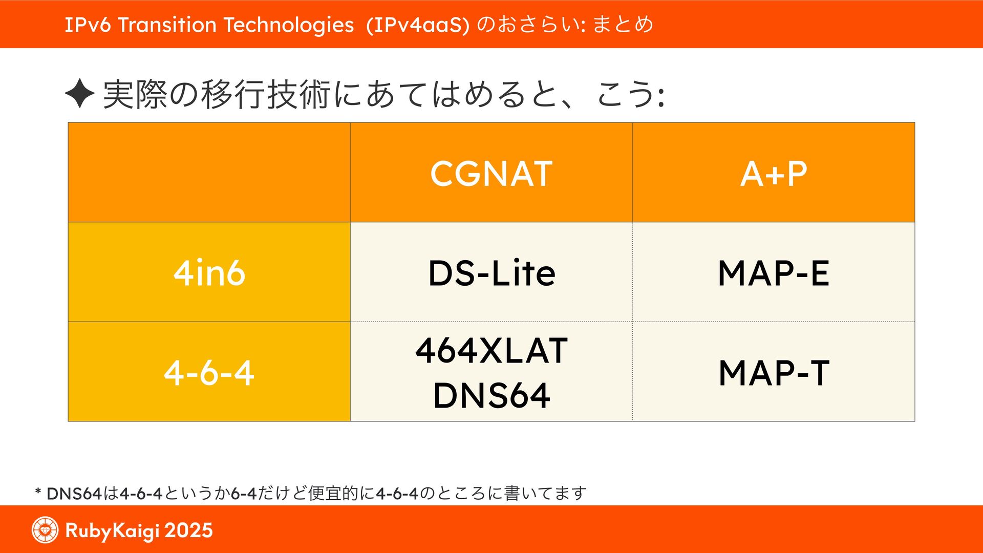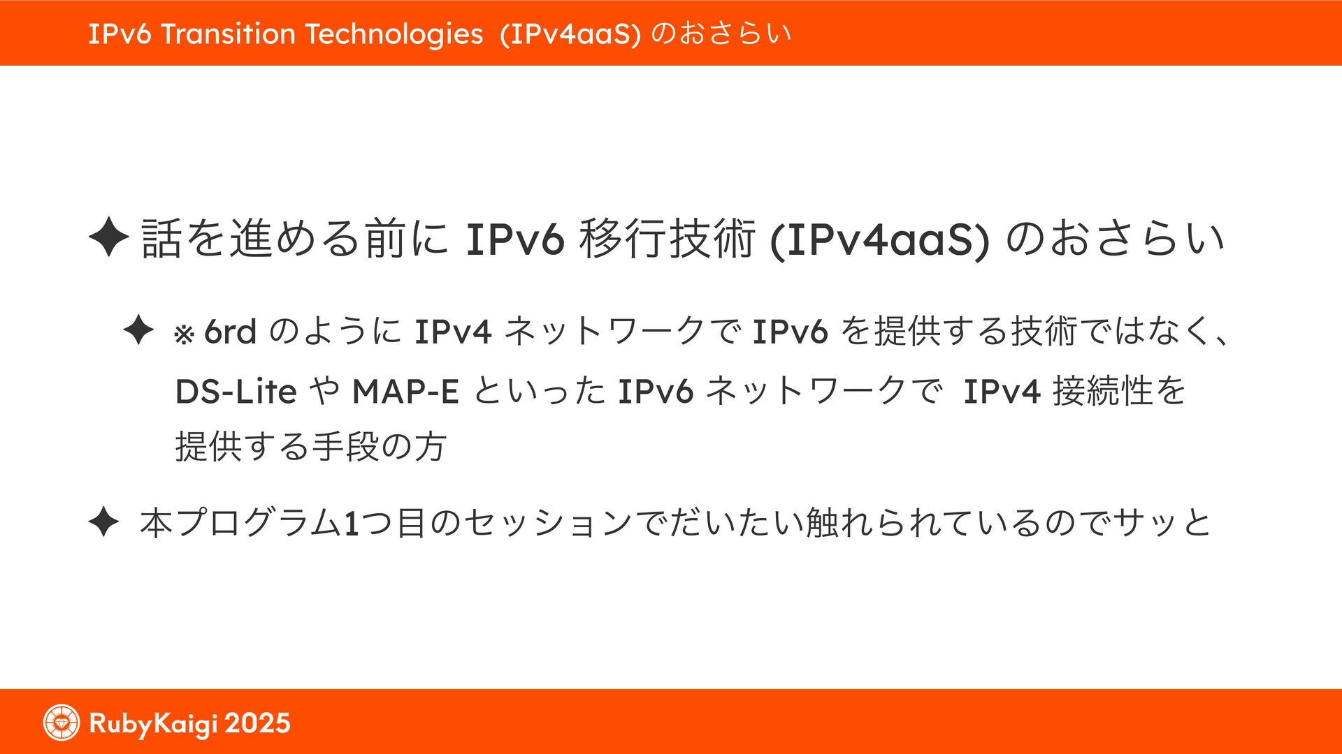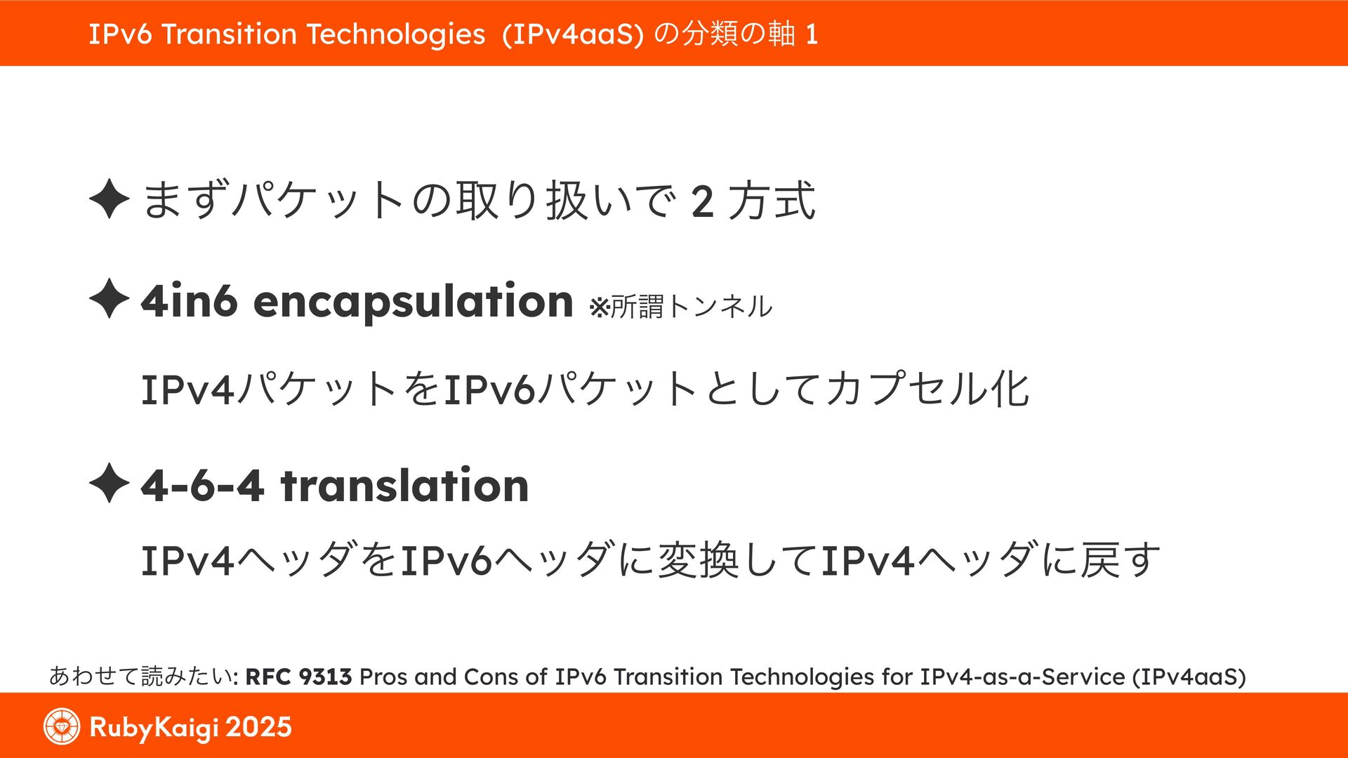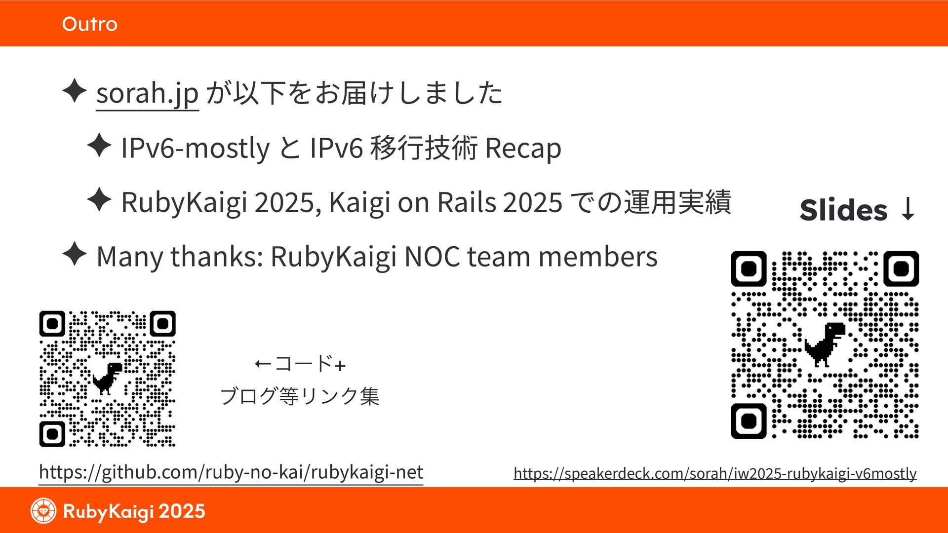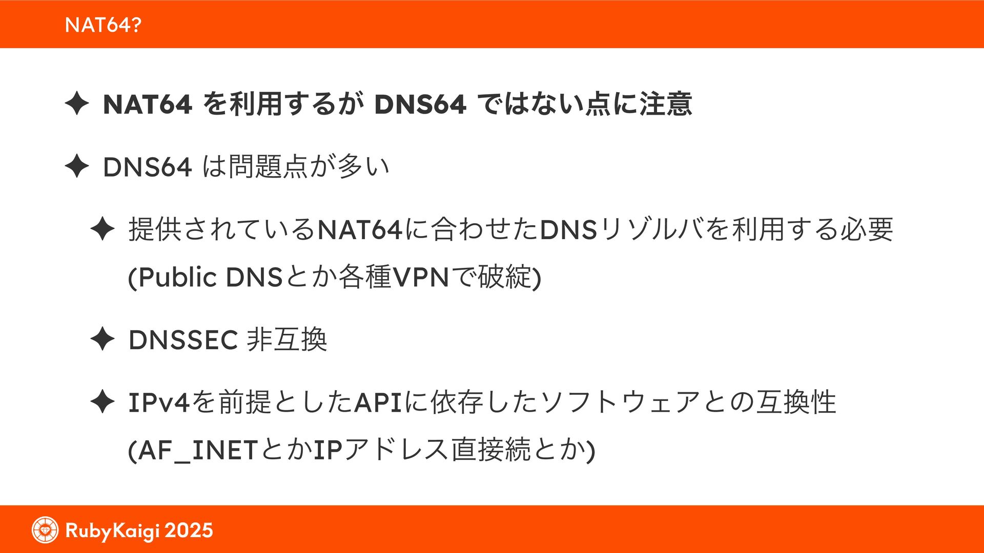 ͕͚ͭΔ Option 82 Ͱ switchport SSID ΛऔΕΔ ✦ ͨͩɺSubnet Ͱఆٛͨ͠ option-data Λ client class Ͱ্ॻ͖ ग़དྷͳ͍ɻͦͷͨΊઃఆΦϓτΠϯํࣜͰߦ͏ Kea Ͱ Option 108 ͷ Scoping https://github.com/ruby-no-kai/rubykaigi-net/blob/master/k8s/dhcp/config/class_main_ssid.libsonnet { name: 'main_ssid', test: "(split(relay4[2].hex, ':', 2) == 'RubyKaigi 2025')" + // SSID " or (relay4[1].hex == 'cs-01-venue:ge-0/0/0.0:usr')", // switchport 'only-if-required': true, 'option-data': [{ name: 'v6-only-preferred', data: '1800' }], }