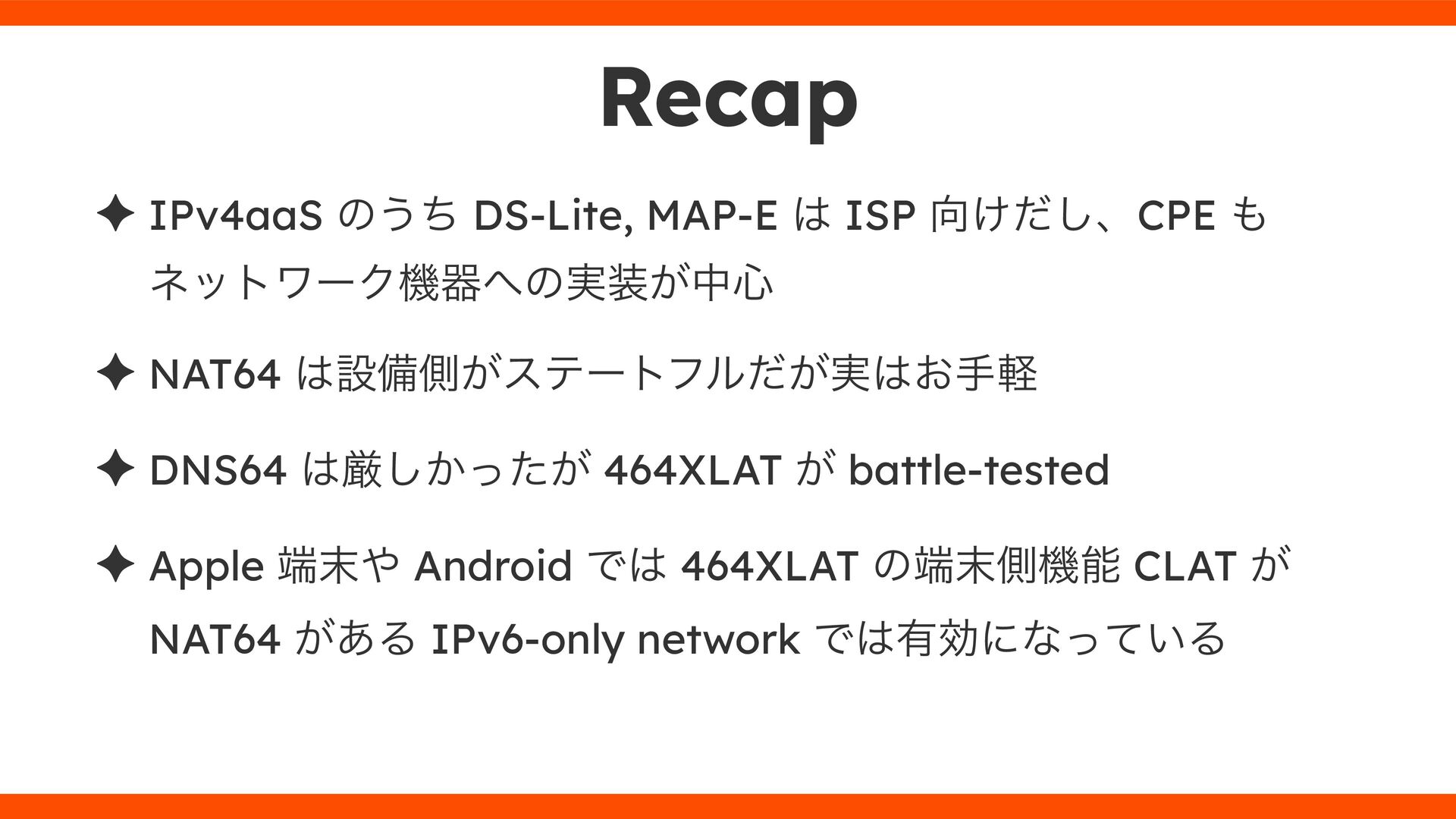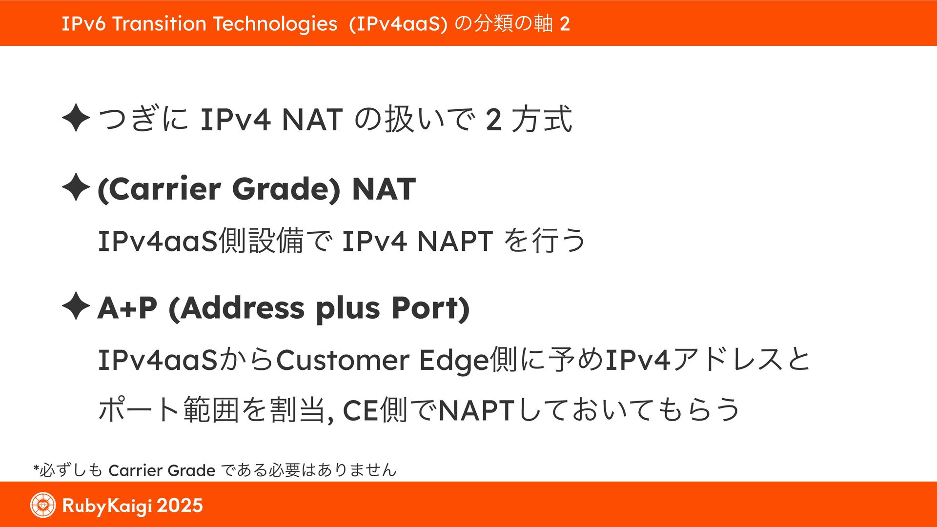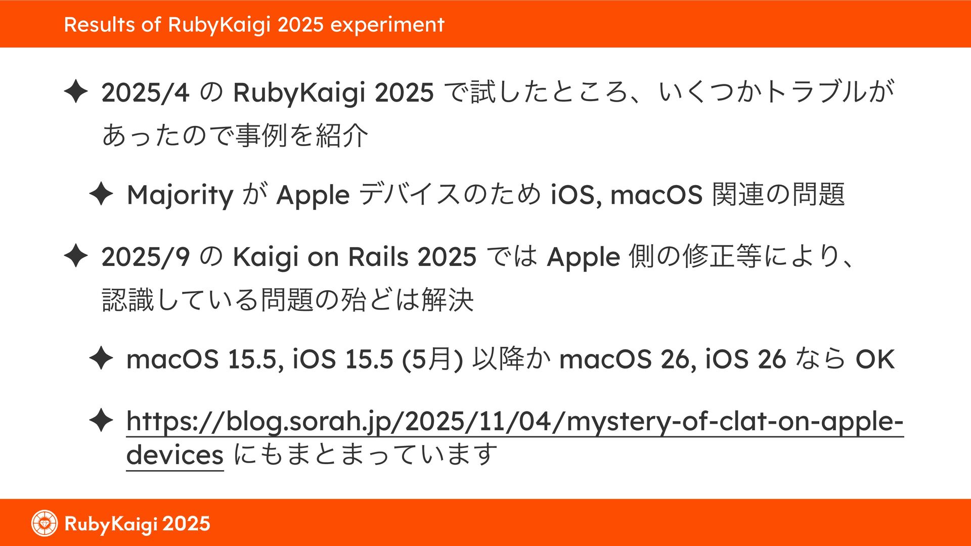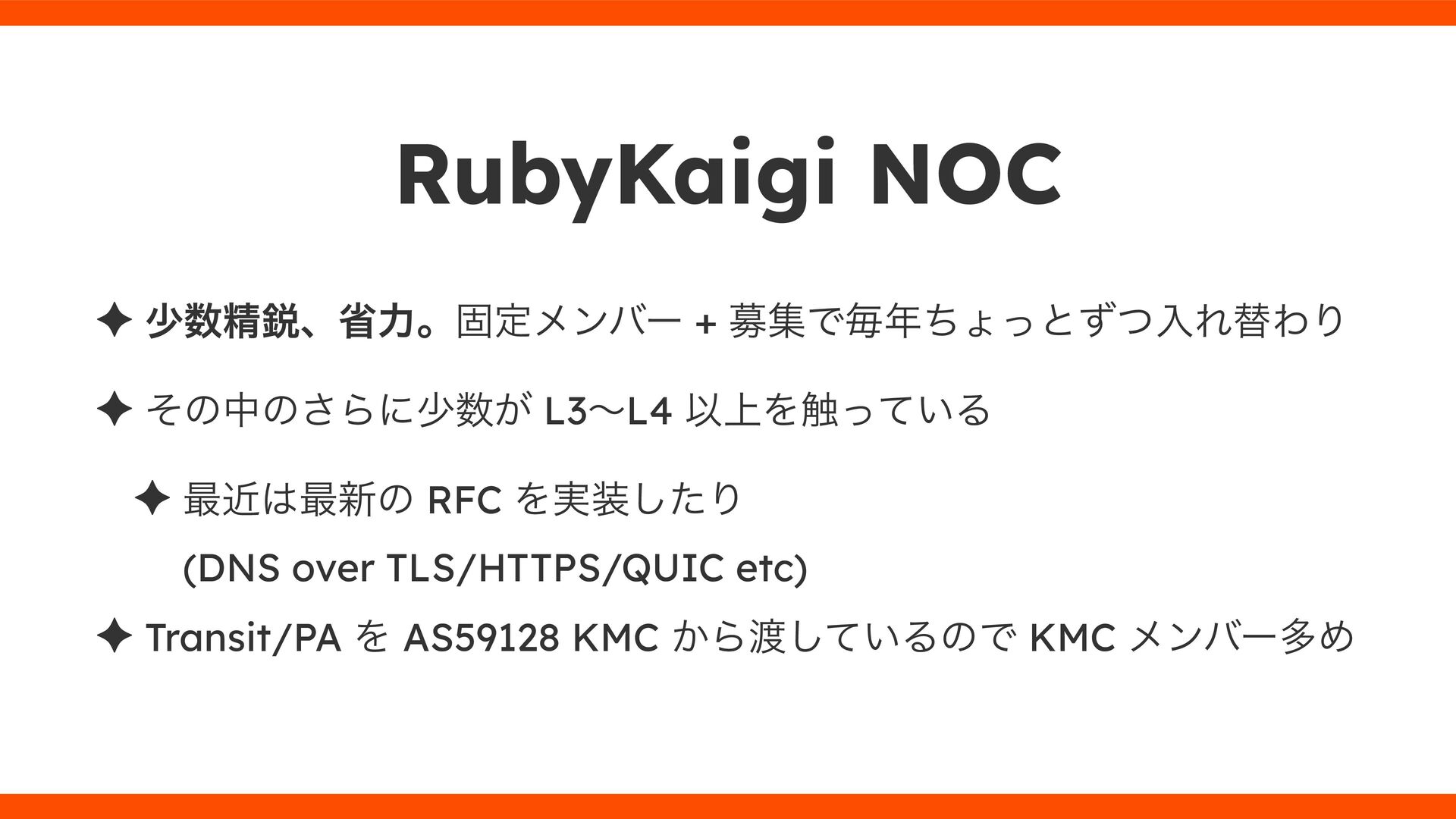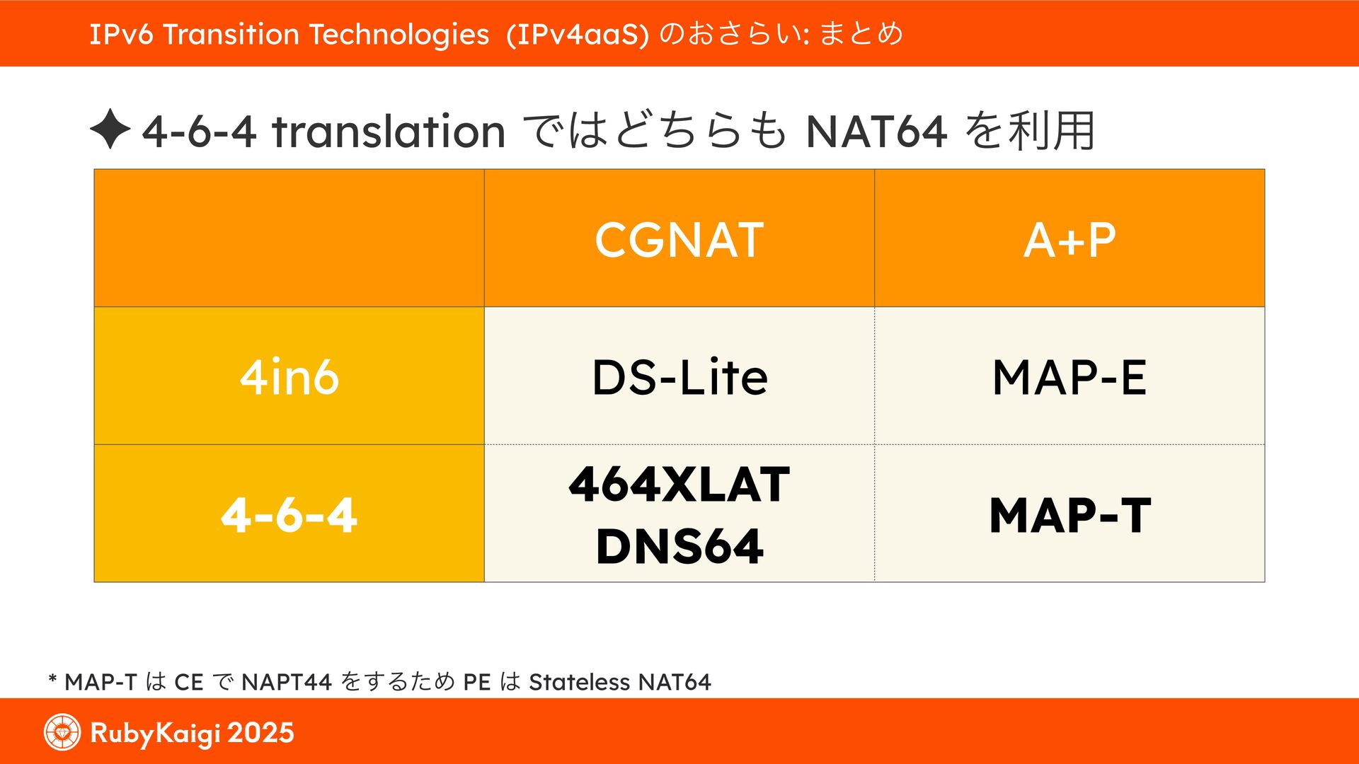 ͕͚ͭΔ Option 82 Ͱ switchport SSID ΛऔΕΔ ✦ ͨͩɺSubnet Ͱఆٛͨ͠ option-data Λ client class Ͱ্ॻ͖ ग़དྷͳ͍ɻͦͷͨΊઃఆΦϓτΠϯํࣜͰߦ͏ Kea Ͱ Option 108 ͷ Scoping https://github.com/ruby-no-kai/rubykaigi-net/blob/master/k8s/dhcp/config/class_main_ssid.libsonnet { name: 'main_ssid', test: "(split(relay4[2].hex, ':', 2) == 'RubyKaigi 2025')" + // SSID " or (relay4[1].hex == 'cs-01-venue:ge-0/0/0.0:usr')", // switchport 'only-if-required': true, 'option-data': [{ name: 'v6-only-preferred', data: '1800' }], }
