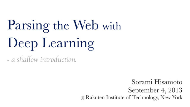 representation features for dependency parsing on web text. ‣ Web domain: lot of unlabeled data. 38 Dependency parsing NER & Chunking Dependency parsing (web text) Brown clustering Word embedding [Koo+ 2008] [Turian+ 2010] our work [Turian+ 2010] our work Preliminary investigation for incorporating deep structure to parsing.