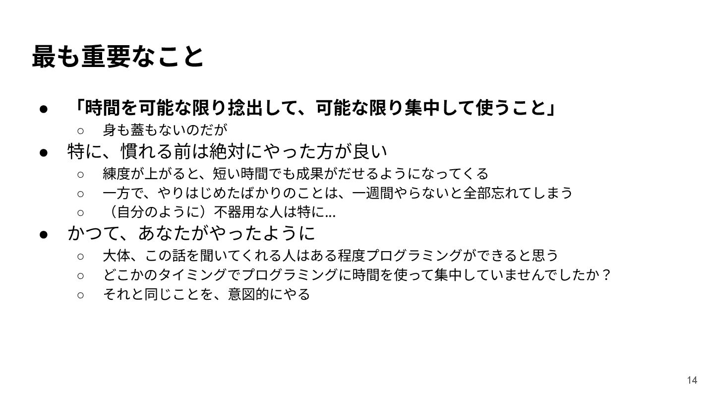 最も重要なこと • 「時間を可能な限り捻出して、可能な限り集中して使うこと」 ◦ ⾝も蓋もないのだが • 特に、慣れる前は絶対にやった⽅が良い ◦ 練度が上がると、短い時間でも成果がだせるようになってくる ◦