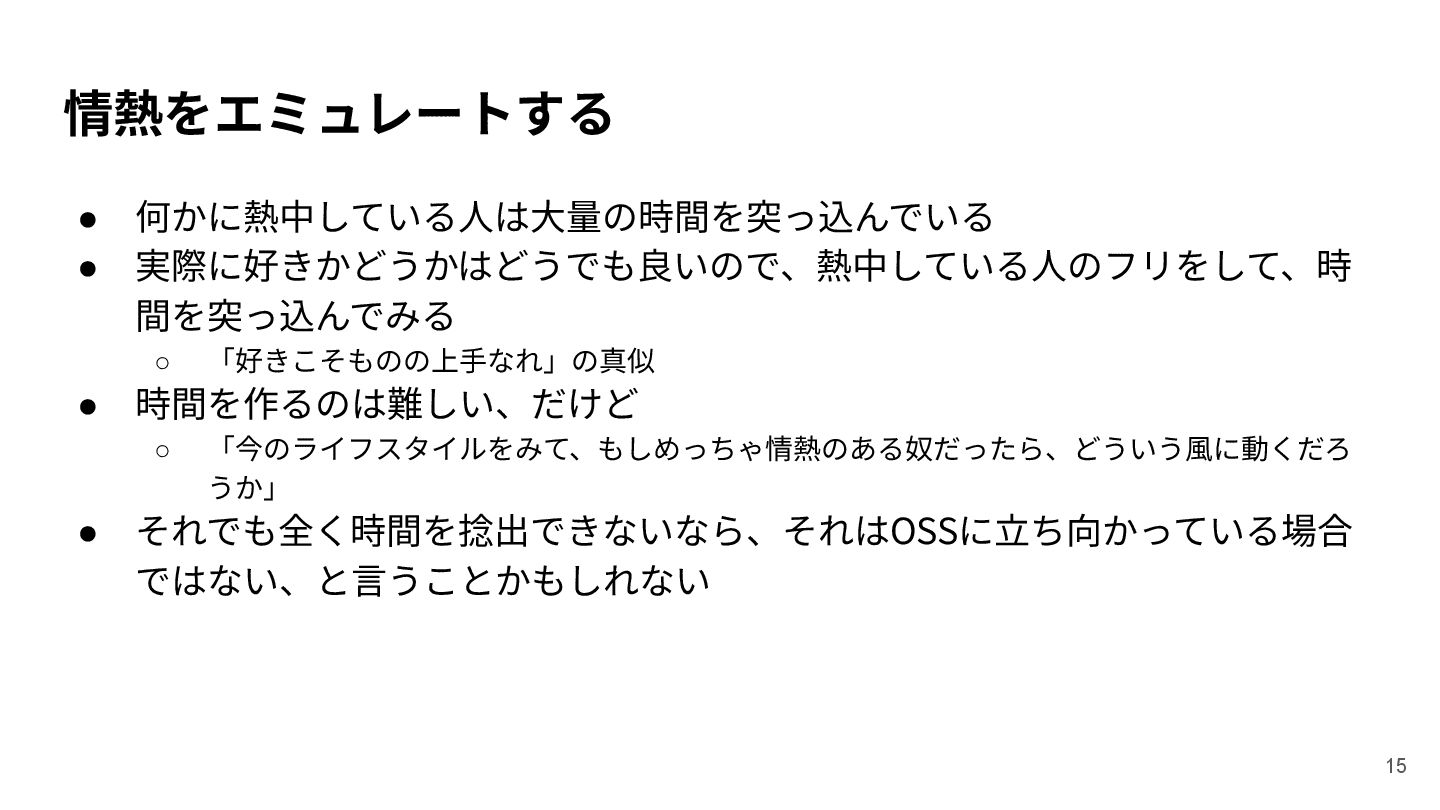 ◦ 「今のライフスタイルをみて、もしめっちゃ情熱のある奴だったら、どういう⾵に動くだろ うか」 • それでも全く時間を捻出できないなら、それはOSSに⽴ち向かっている場合 ではない、と⾔うことかもしれない 15