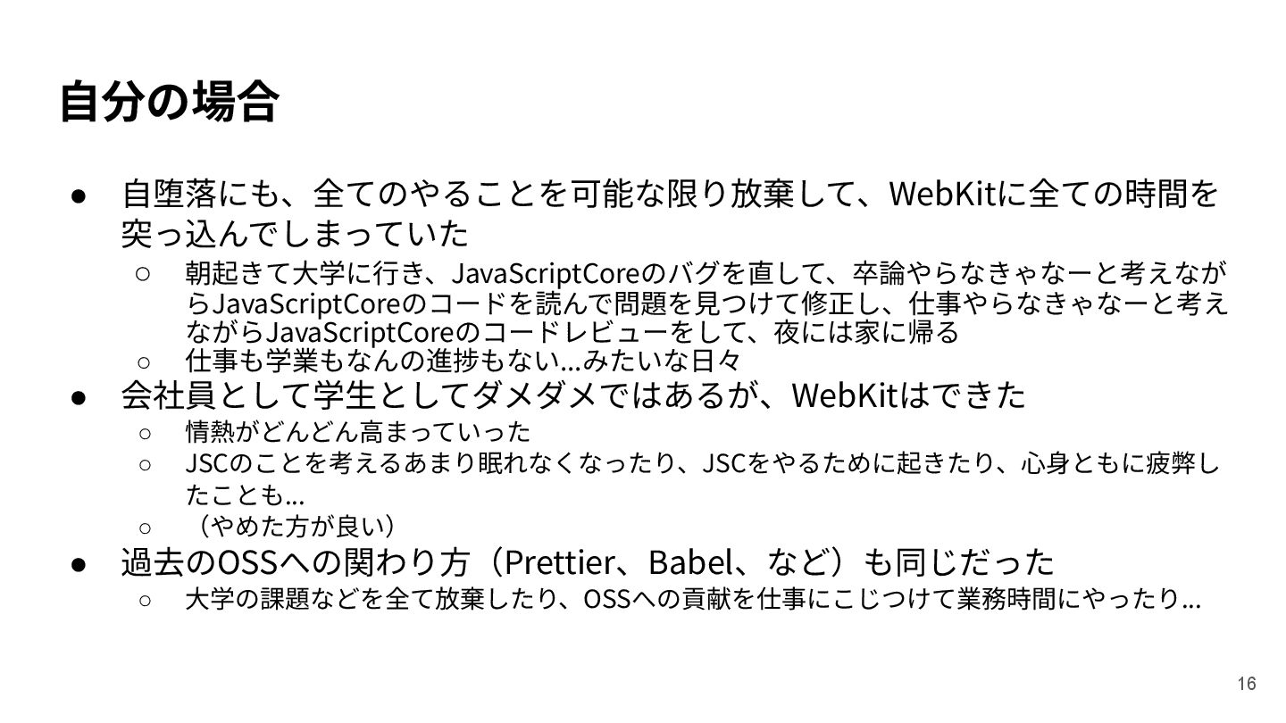 ⾃分の場合 • ⾃堕落にも、全てのやることを可能な限り放棄して、WebKitに全ての時間を 突っ込んでしまっていた ◦ 朝起きて⼤学に⾏き、JavaScriptCoreのバグを直して、卒論やらなきゃなーと考えなが らJavaScriptCoreのコードを読んで問題を⾒つけて修正し、仕事やらなきゃなーと考え ながらJavaScriptCoreのコードレビューをして、夜には家に帰る ◦ 仕事も学業もなんの進捗もない...みたいな⽇々