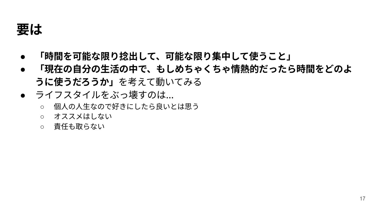 要は • 「時間を可能な限り捻出して、可能な限り集中して使うこと」 • 「現在の⾃分の⽣活の中で、もしめちゃくちゃ情熱的だったら時間をどのよ うに使うだろうか」を考えて動いてみる • ライフスタイルをぶっ壊すのは... ◦ 個⼈の⼈⽣なので好きにしたら良いとは思う