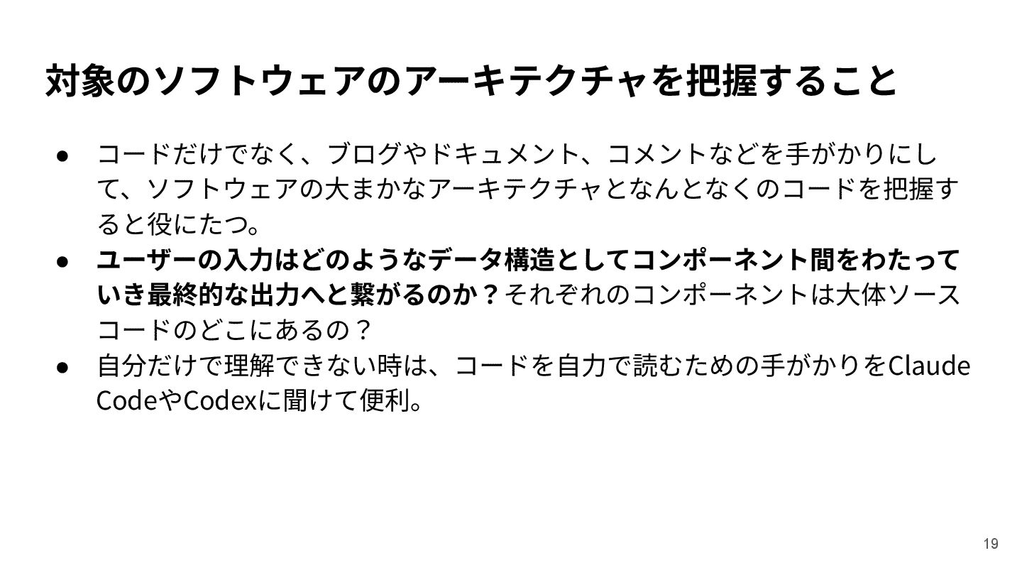 ⾃分だけで理解できない時は、コードを⾃⼒で読むための⼿がかりをClaude CodeやCodexに聞けて便利。 19