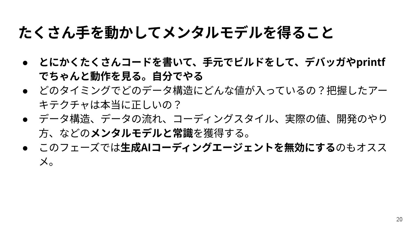 たくさん⼿を動かしてメンタルモデルを得ること • とにかくたくさんコードを書いて、⼿元でビルドをして、デバッガやprintf でちゃんと動作を⾒る。⾃分でやる • どのタイミングでどのデータ構造にどんな値が⼊っているの?把握したアー キテクチャは本当に正しいの? • データ構造、データの流れ、コーディングスタイル、実際の値、開発のやり ⽅、などのメンタルモデルと常識を獲得する。