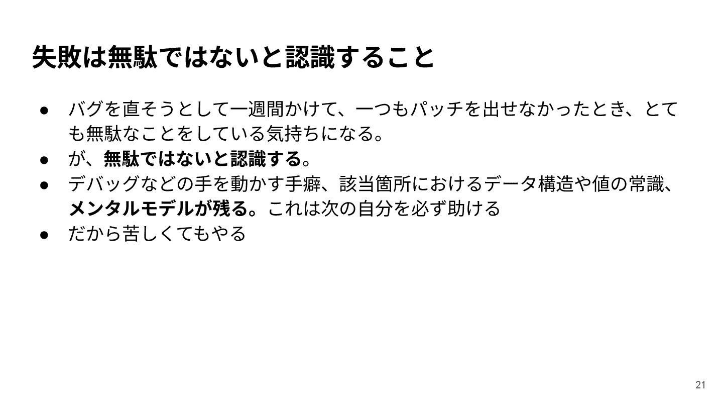 失敗は無駄ではないと認識すること • バグを直そうとして⼀週間かけて、⼀つもパッチを出せなかったとき、とて も無駄なことをしている気持ちになる。 • が、無駄ではないと認識する。 • デバッグなどの⼿を動かす⼿癖、該当箇所におけるデータ構造や値の常識、 メンタルモデルが残る。これは次の⾃分を必ず助ける •