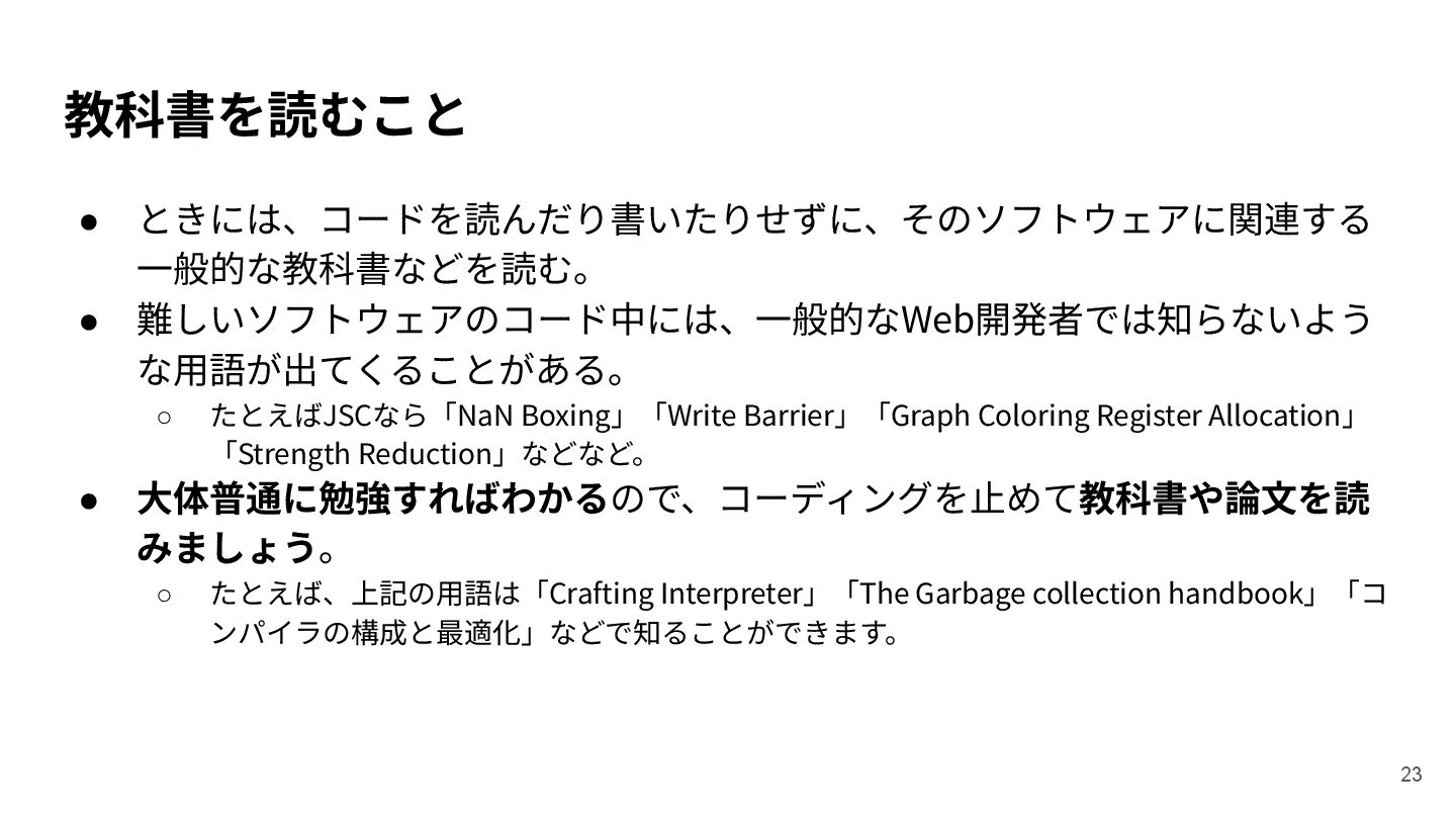 教科書を読むこと • ときには、コードを読んだり書いたりせずに、そのソフトウェアに関連する ⼀般的な教科書などを読む。 • 難しいソフトウェアのコード中には、⼀般的なWeb開発者では知らないよう な⽤語が出てくることがある。 ◦ たとえばJSCなら「NaN Boxing」「Write