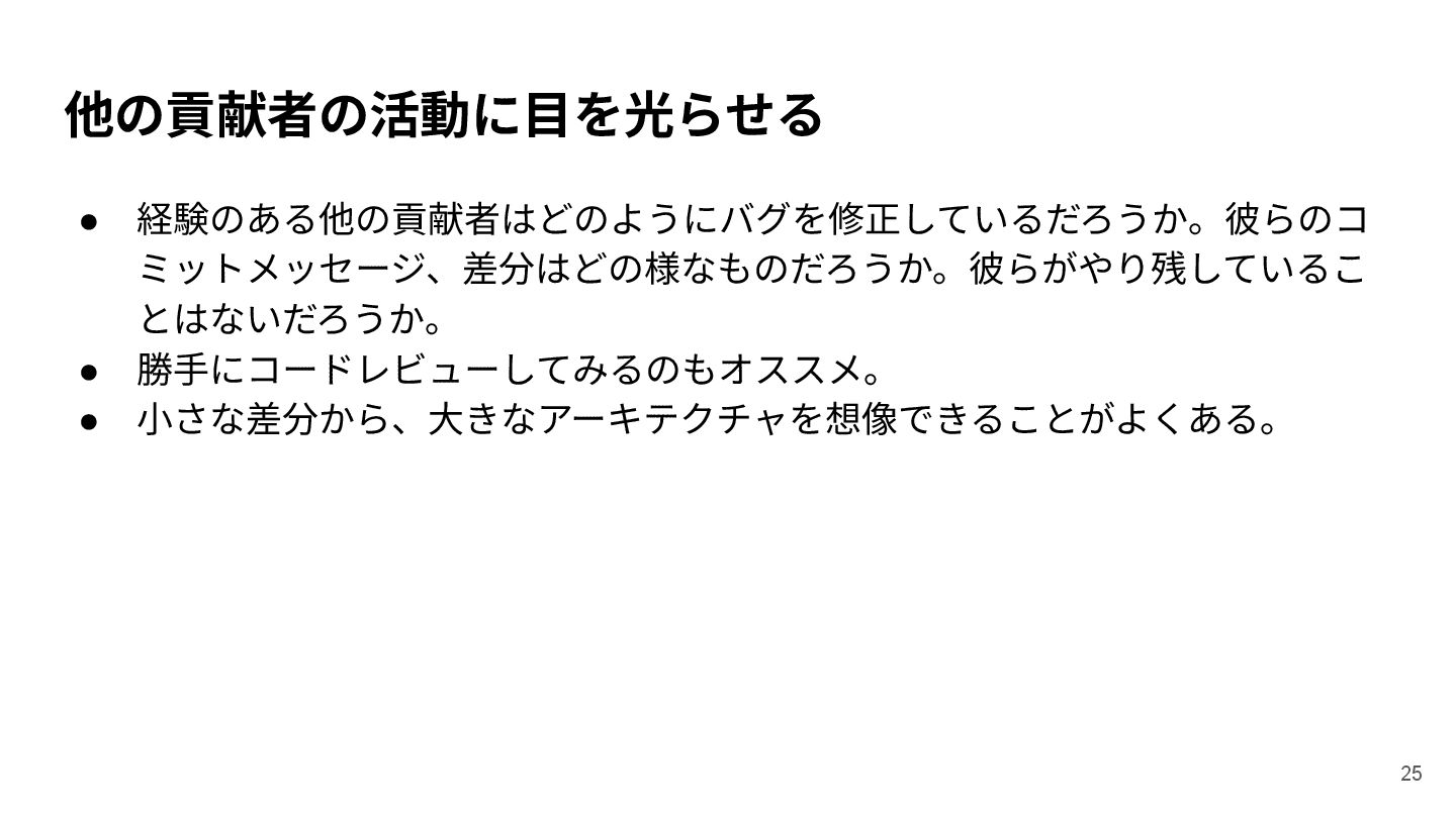 他の貢献者の活動に⽬を光らせる • 経験のある他の貢献者はどのようにバグを修正しているだろうか。彼らのコ ミットメッセージ、差分はどの様なものだろうか。彼らがやり残しているこ とはないだろうか。 • 勝⼿にコードレビューしてみるのもオススメ。 • ⼩さな差分から、⼤きなアーキテクチャを想像できることがよくある。 25