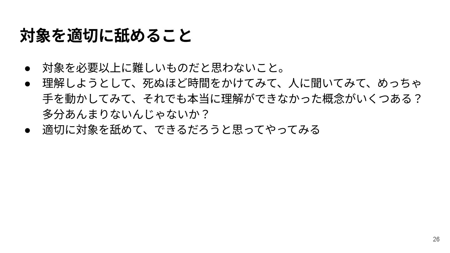対象を適切に舐めること • 対象を必要以上に難しいものだと思わないこと。 • 理解しようとして、死ぬほど時間をかけてみて、⼈に聞いてみて、めっちゃ ⼿を動かしてみて、それでも本当に理解ができなかった概念がいくつある? 多分あんまりないんじゃないか? • 適切に対象を舐めて、できるだろうと思ってやってみる 26