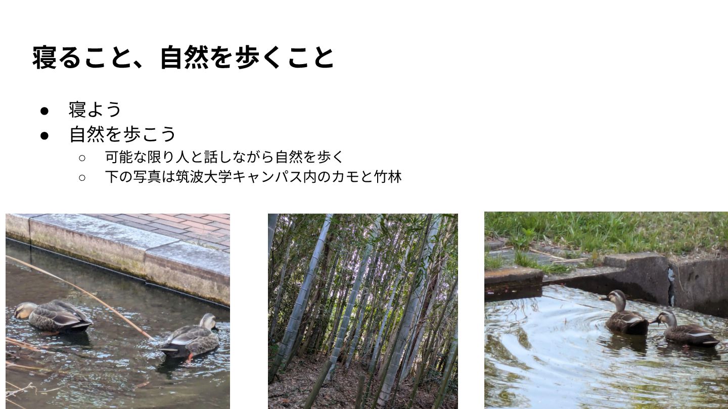 寝ること、⾃然を歩くこと • 寝よう • ⾃然を歩こう ◦ 可能な限り⼈と話しながら⾃然を歩く ◦ 下の写真は筑波⼤学キャンパス内のカモと⽵林 27