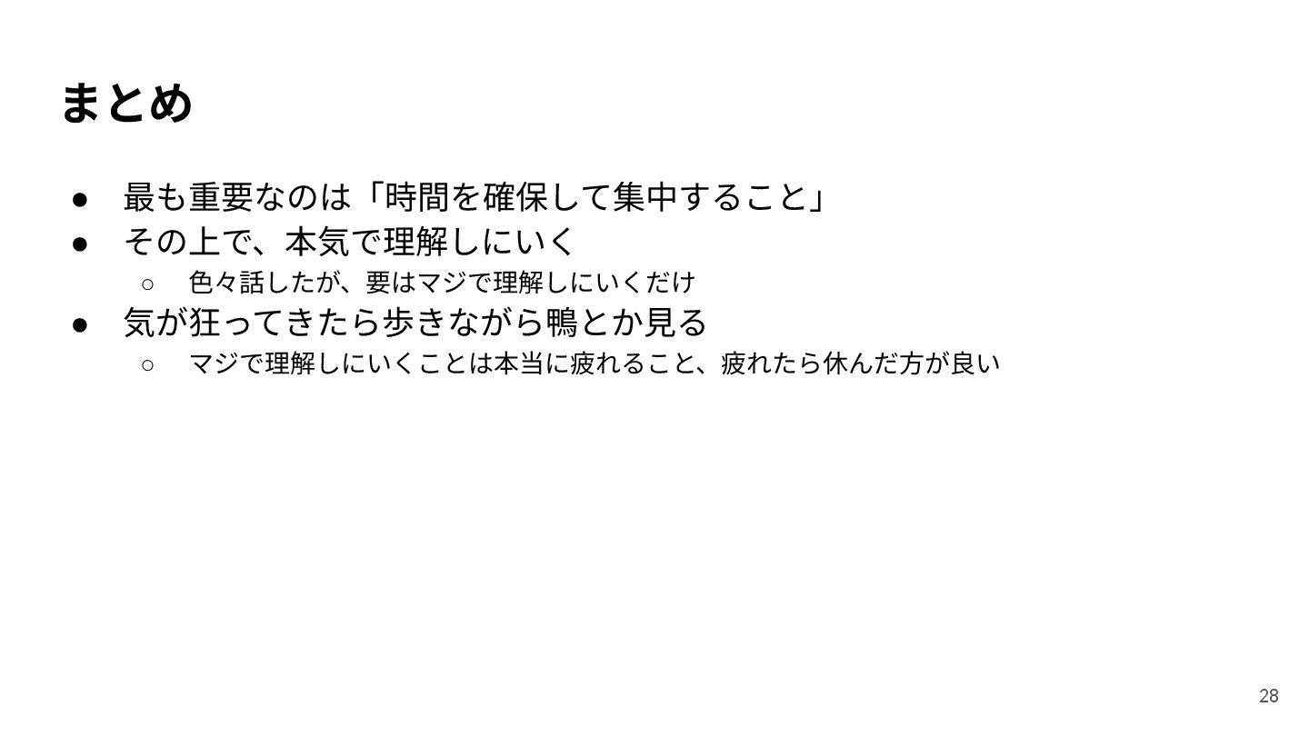 まとめ • 最も重要なのは「時間を確保して集中すること」 • その上で、本気で理解しにいく ◦ ⾊々話したが、要はマジで理解しにいくだけ • 気が狂ってきたら歩きながら鴨とか⾒る ◦