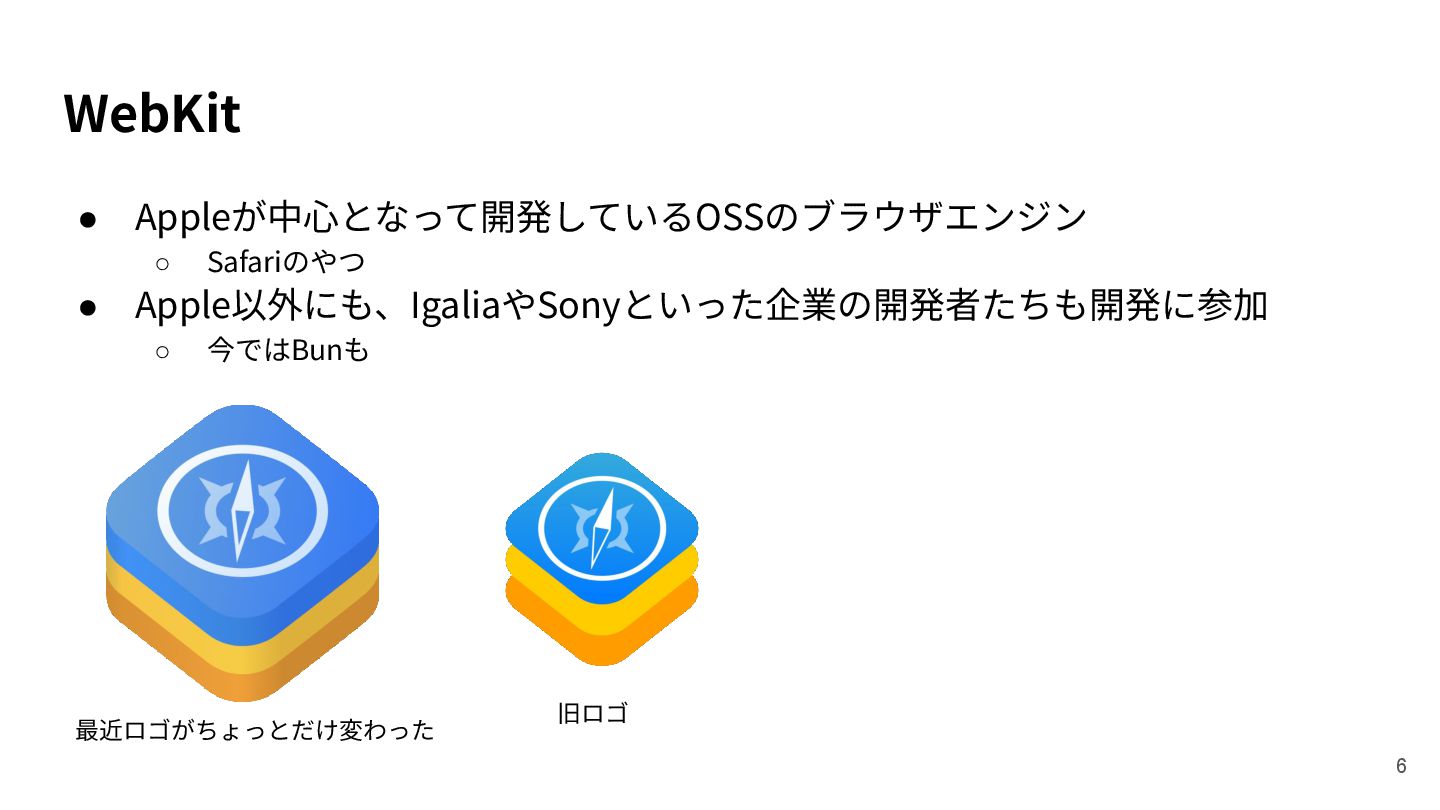 WebKit • Appleが中⼼となって開発しているOSSのブラウザエンジン ◦ Safariのやつ • Apple以外にも、IgaliaやSonyといった企業の開発者たちも開発に参加 ◦ 今ではBunも 最近ロゴがちょっとだけ変わった