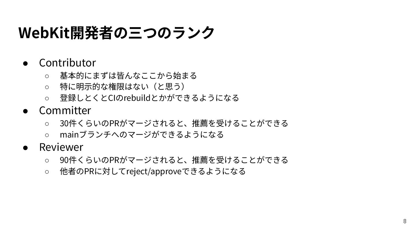WebKit開発者の三つのランク • Contributor ◦ 基本的にまずは皆んなここから始まる ◦ 特に明⽰的な権限はない(と思う) ◦ 登録しとくとCIのrebuildとかができるようになる •