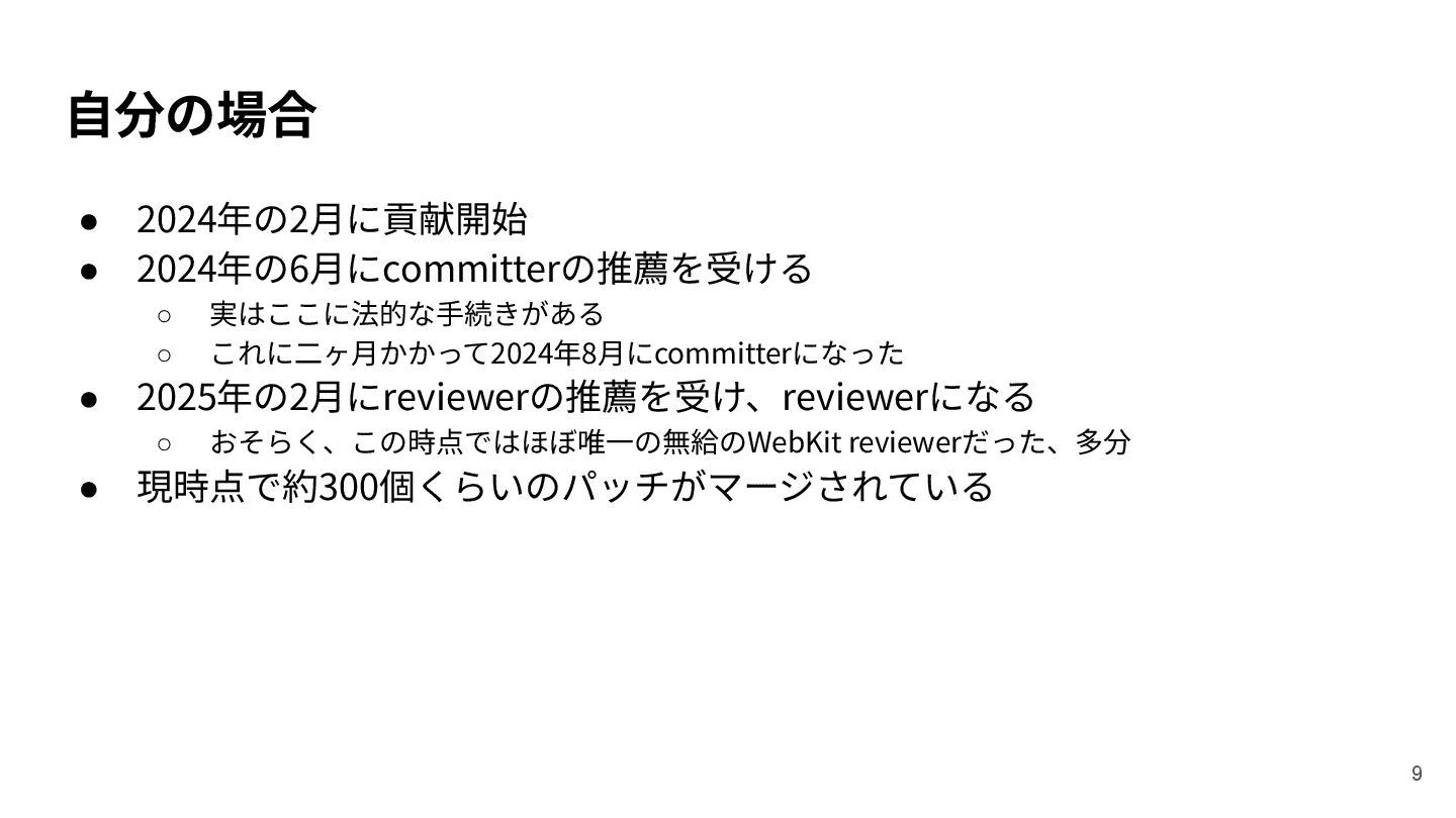 2025年の2⽉にreviewerの推薦を受け、reviewerになる ◦ おそらく、この時点ではほぼ唯⼀の無給のWebKit reviewerだった、多分 • 現時点で約300個くらいのパッチがマージされている 9