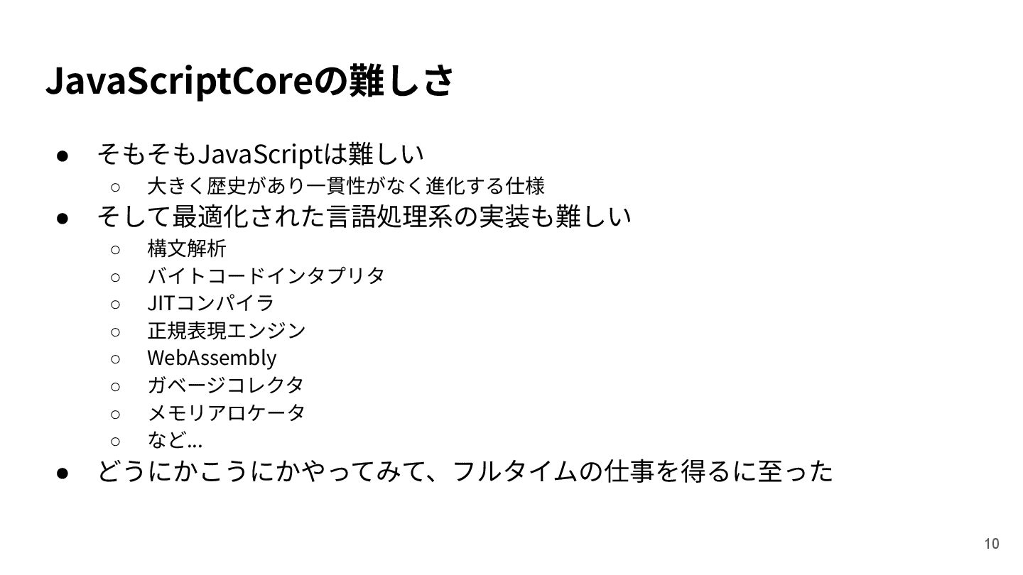JavaScriptCoreの難しさ • そもそもJavaScriptは難しい ◦ ⼤きく歴史があり⼀貫性がなく進化する仕様 • そして最適化された⾔語処理系の実装も難しい ◦ 構⽂解析 ◦