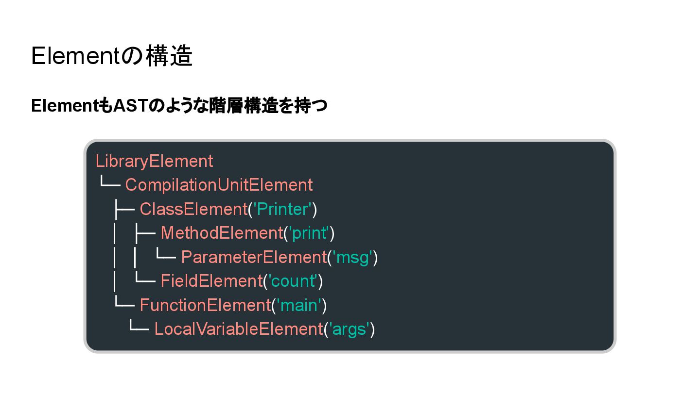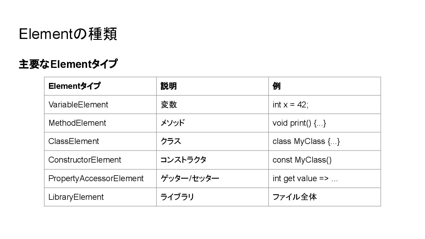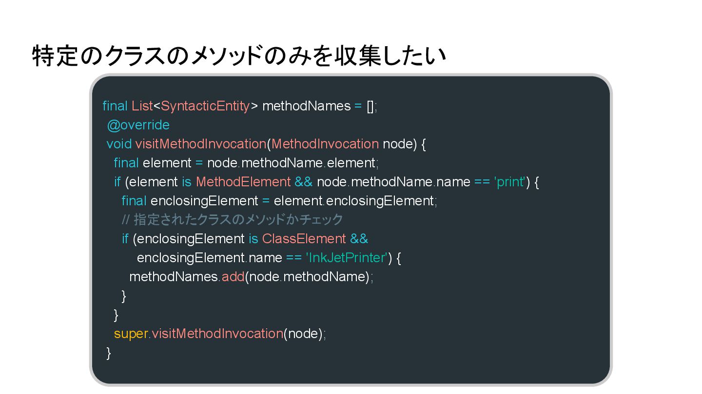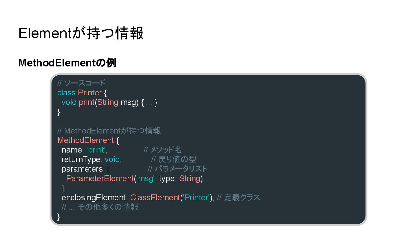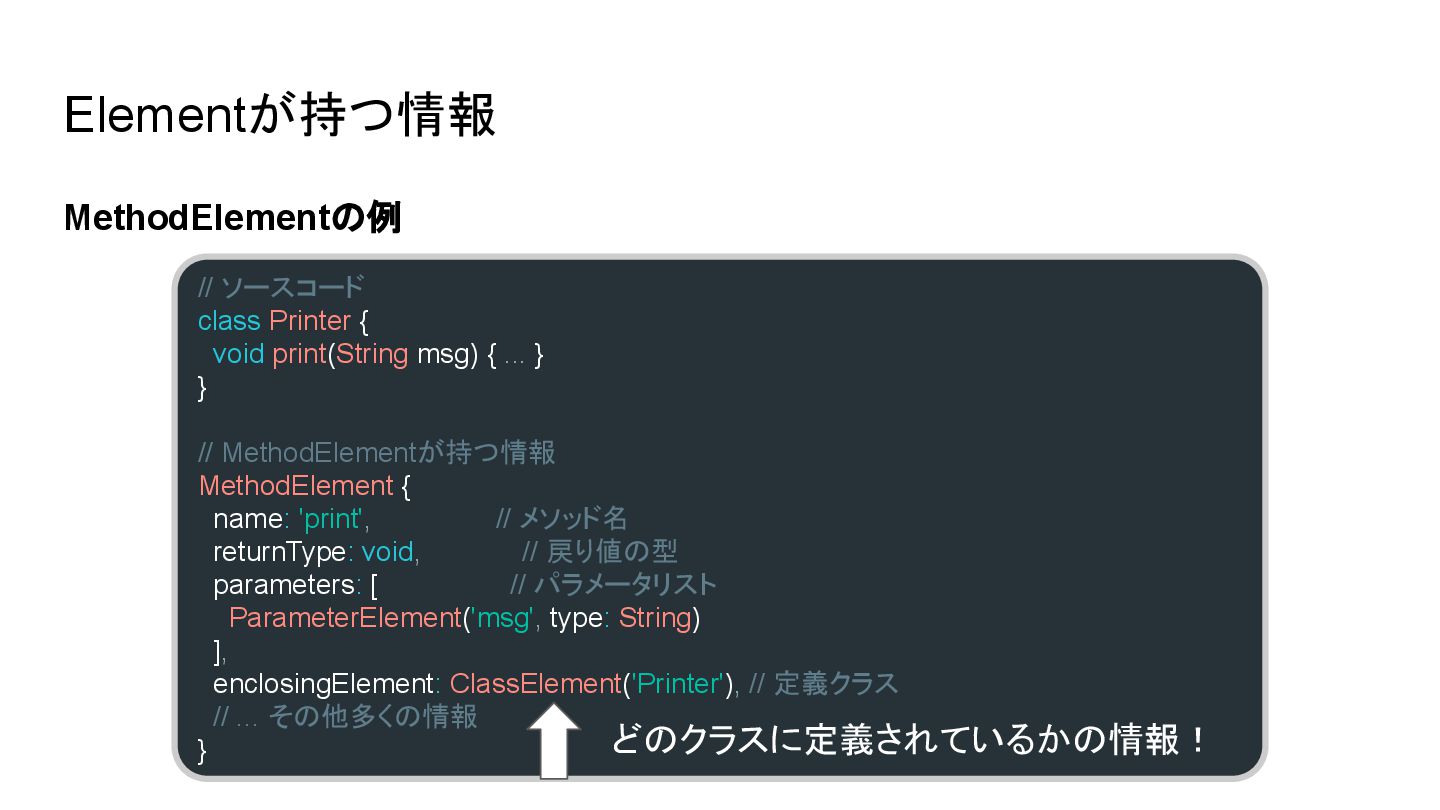 { ... } } // MethodElementが持つ情報 MethodElement { name: 'print', // メソッド名 returnType: void, // 戻り値の型 parameters: [ // パラメータリスト ParameterElement('msg', type: String) ], enclosingElement: ClassElement('Printer'), // 定義クラス // ... その他多くの情報 } どのクラスに定義されているかの情報!