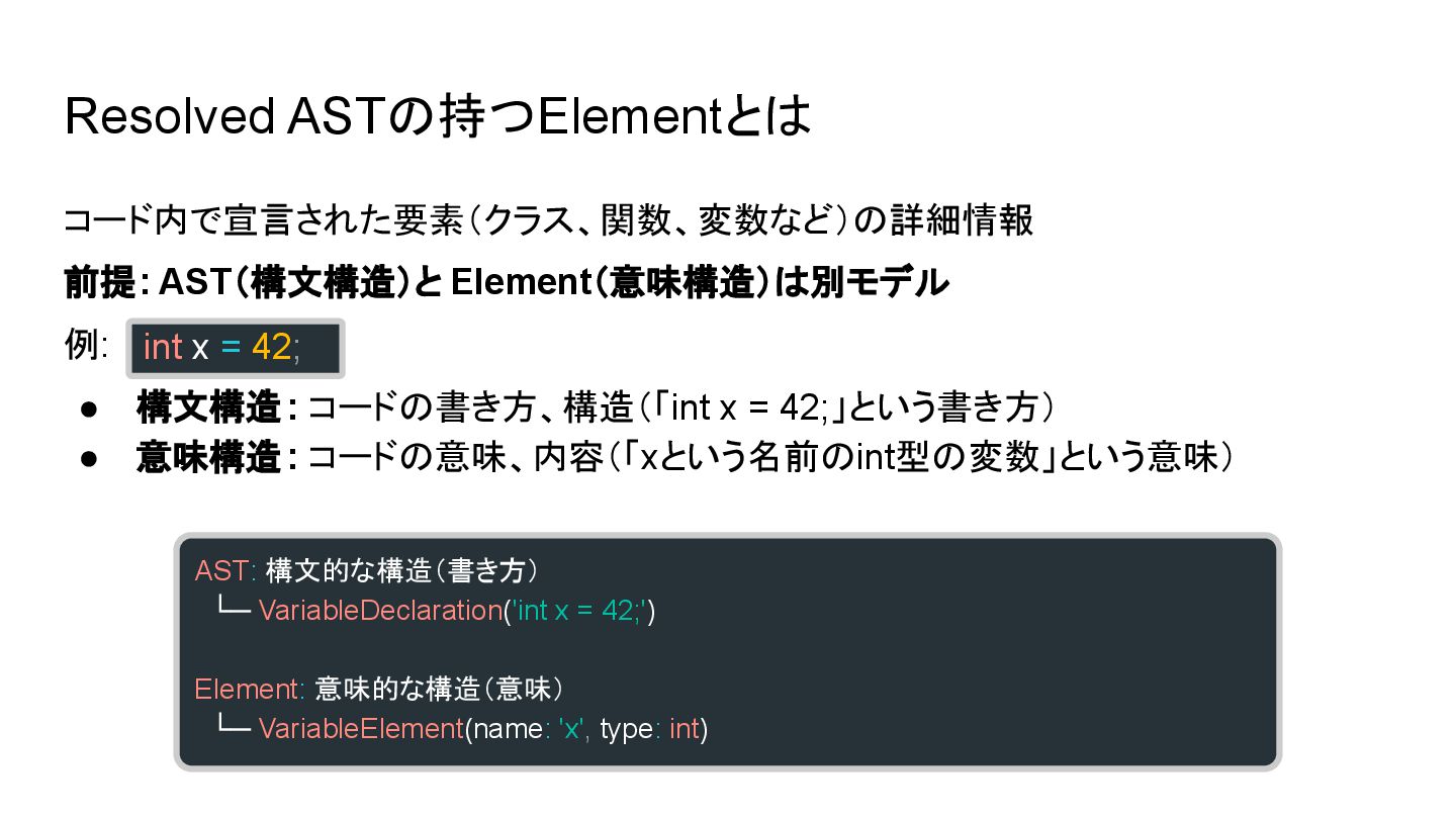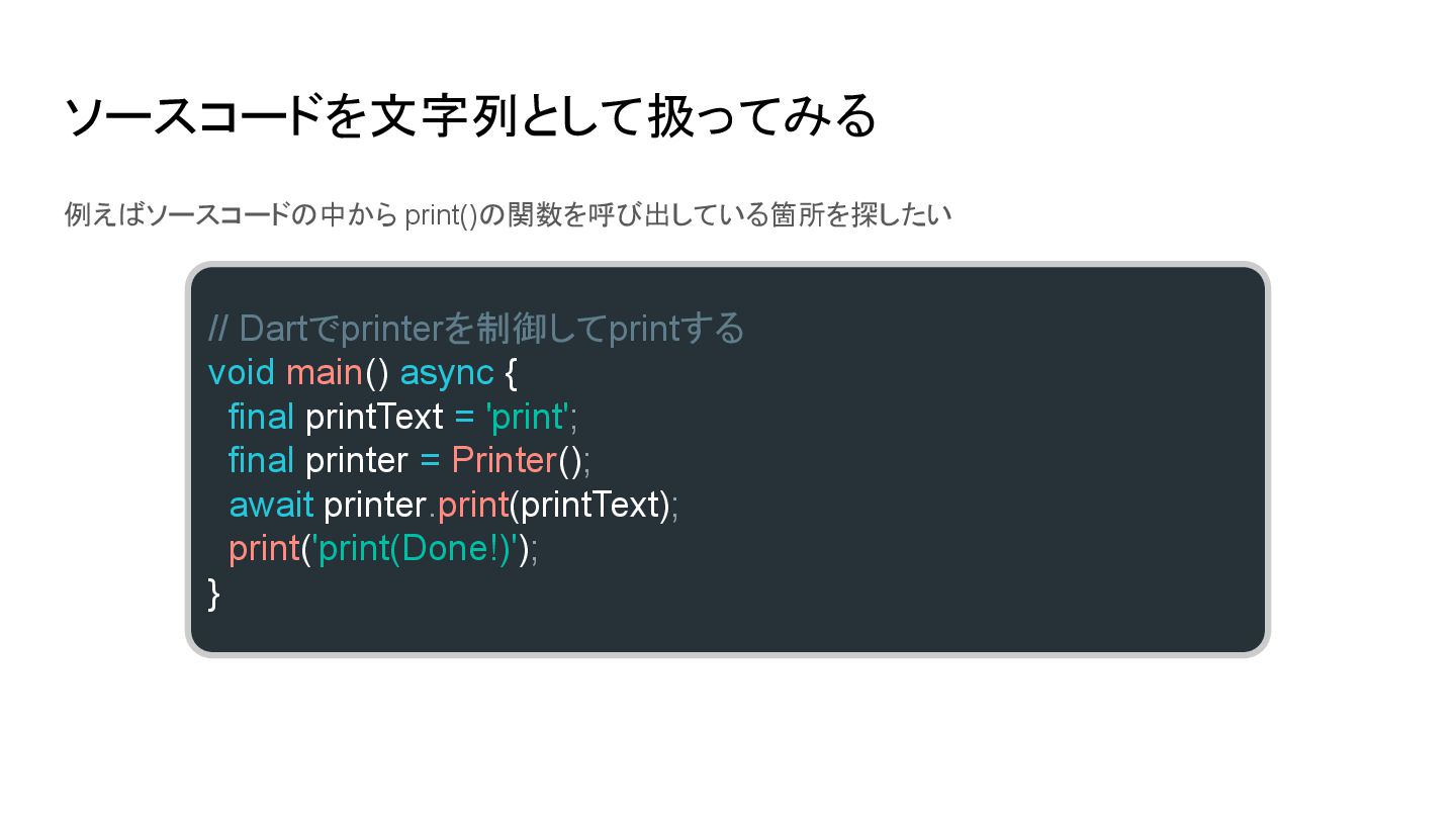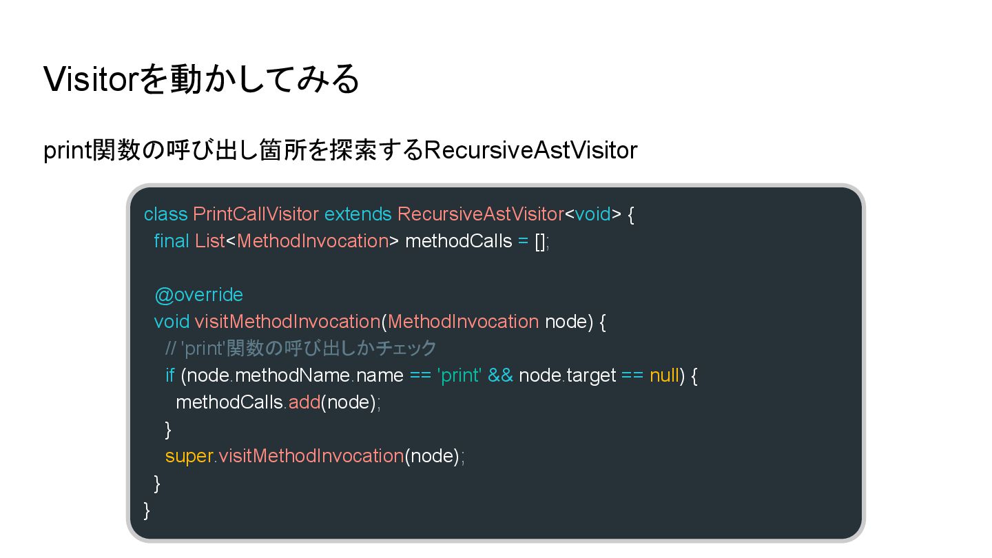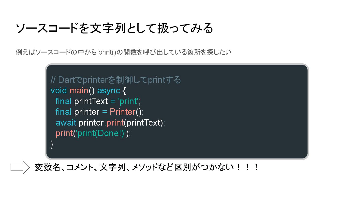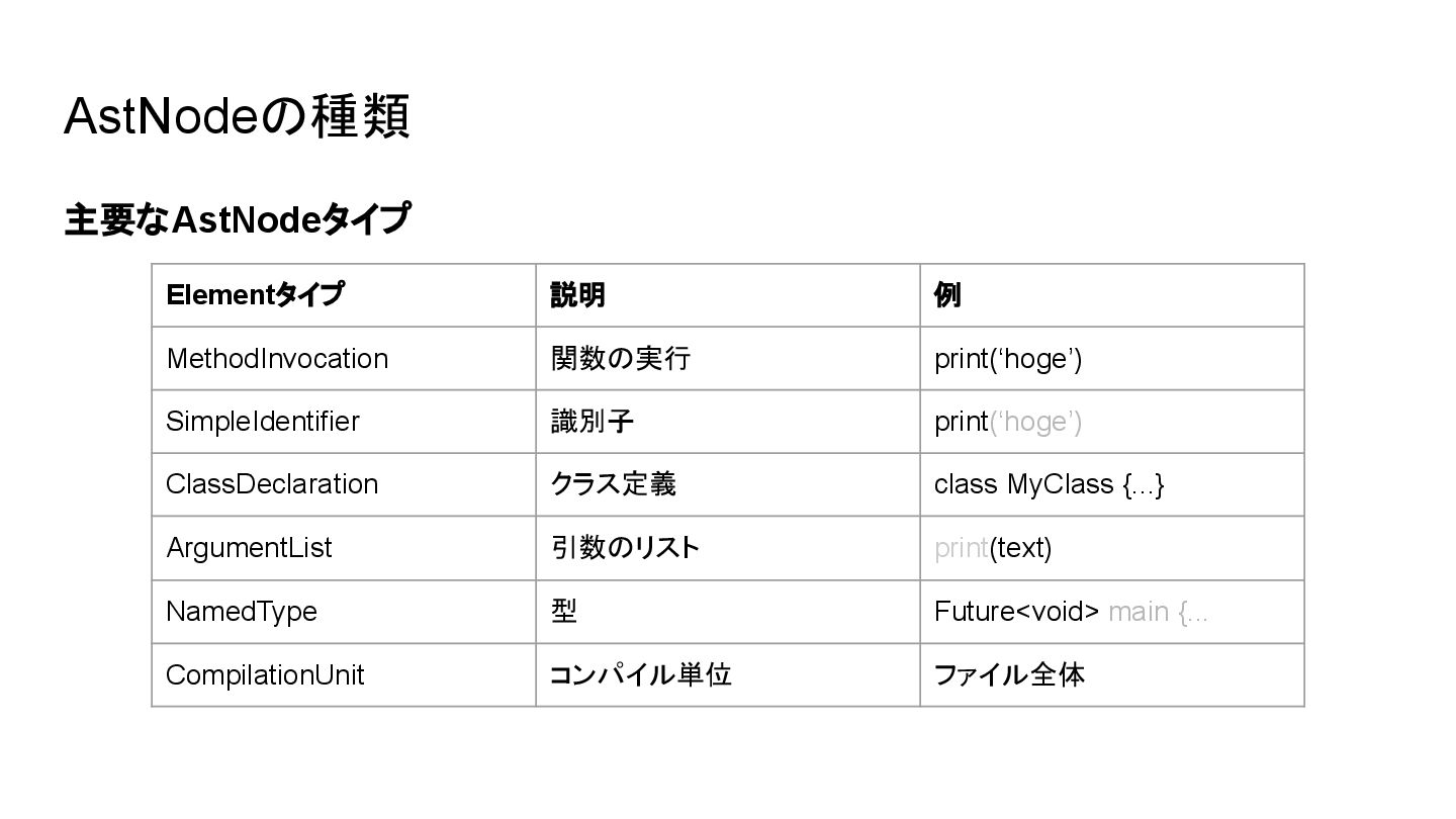 { ... } } // MethodElementが持つ情報 MethodElement { name: 'print', // メソッド名 returnType: void, // 戻り値の型 parameters: [ // パラメータリスト ParameterElement('msg', type: String) ], enclosingElement: ClassElement('Printer'), // 定義クラス // ... その他多くの情報 } どのクラスに定義されているかの情報!