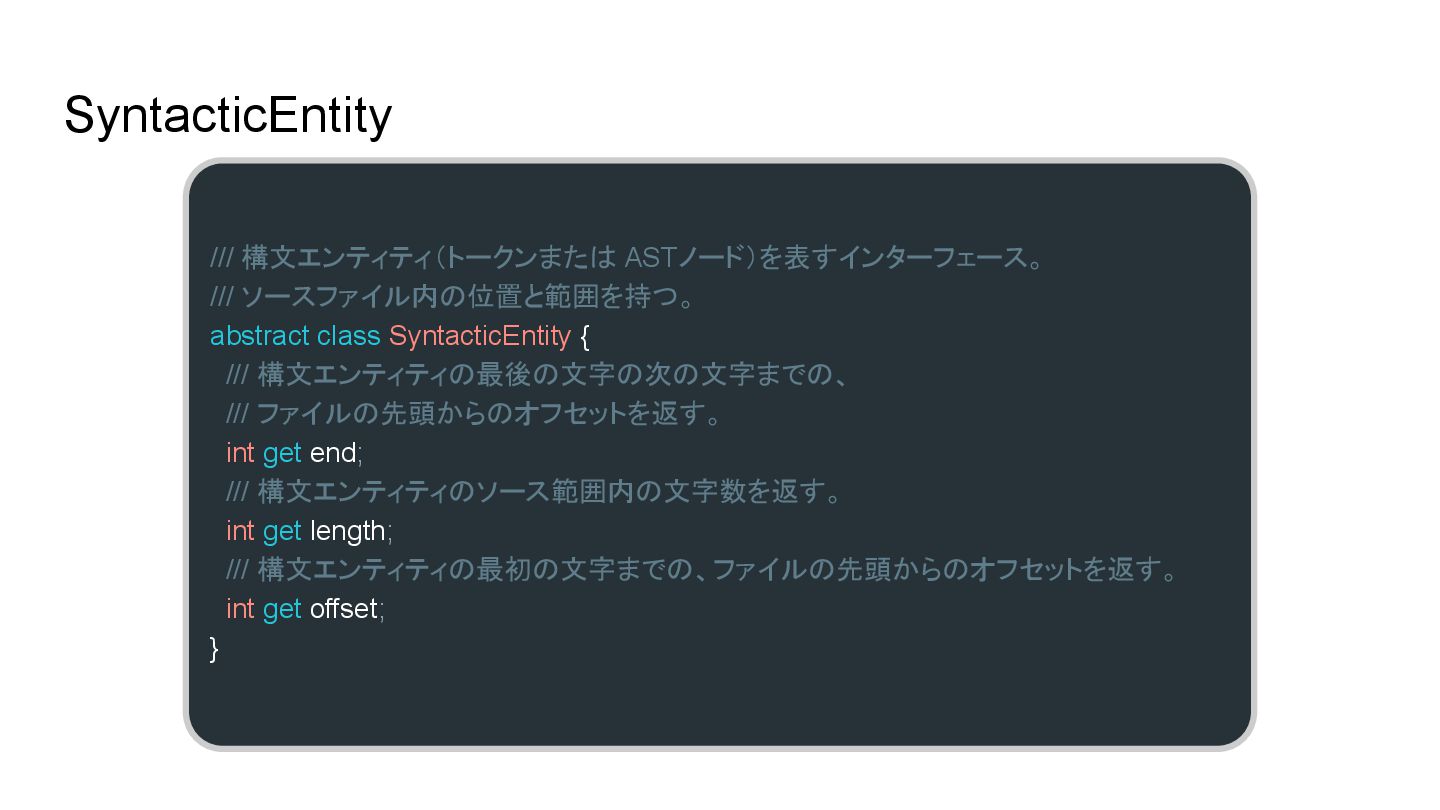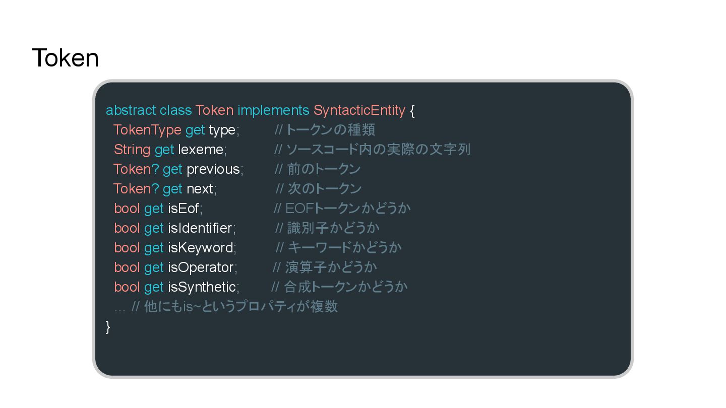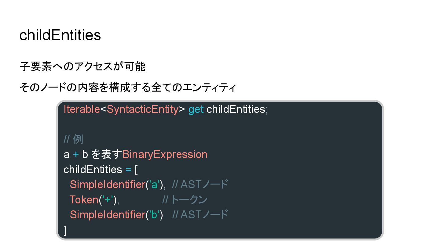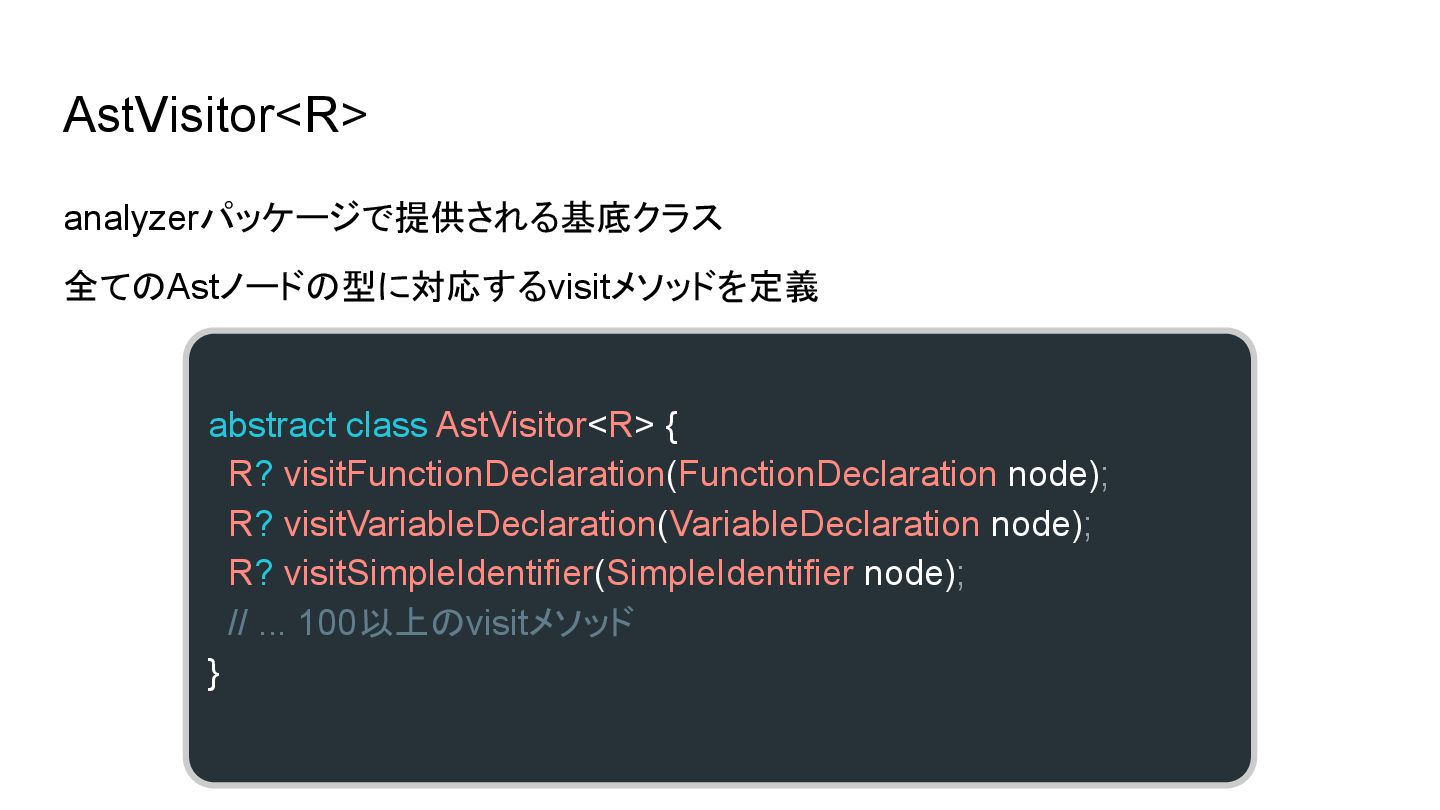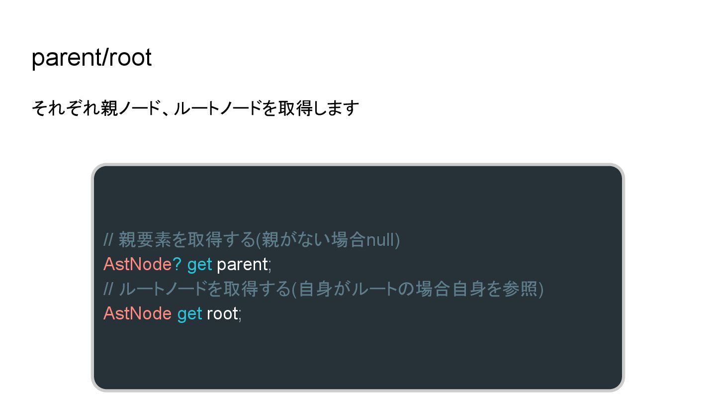 { ... } } // MethodElementが持つ情報 MethodElement { name: 'print', // メソッド名 returnType: void, // 戻り値の型 parameters: [ // パラメータリスト ParameterElement('msg', type: String) ], enclosingElement: ClassElement('Printer'), // 定義クラス // ... その他多くの情報 } どのクラスに定義されているかの情報!