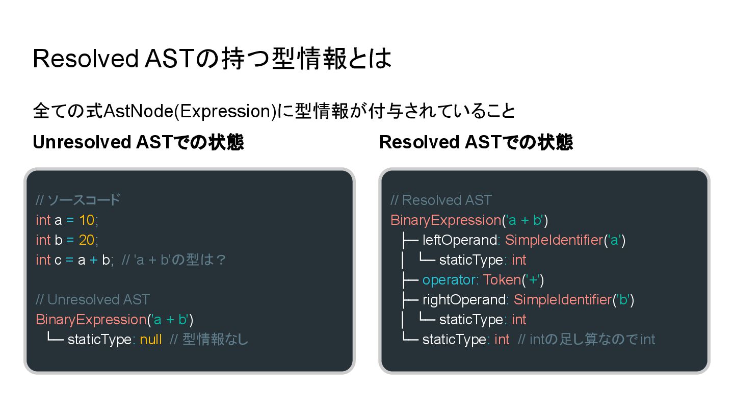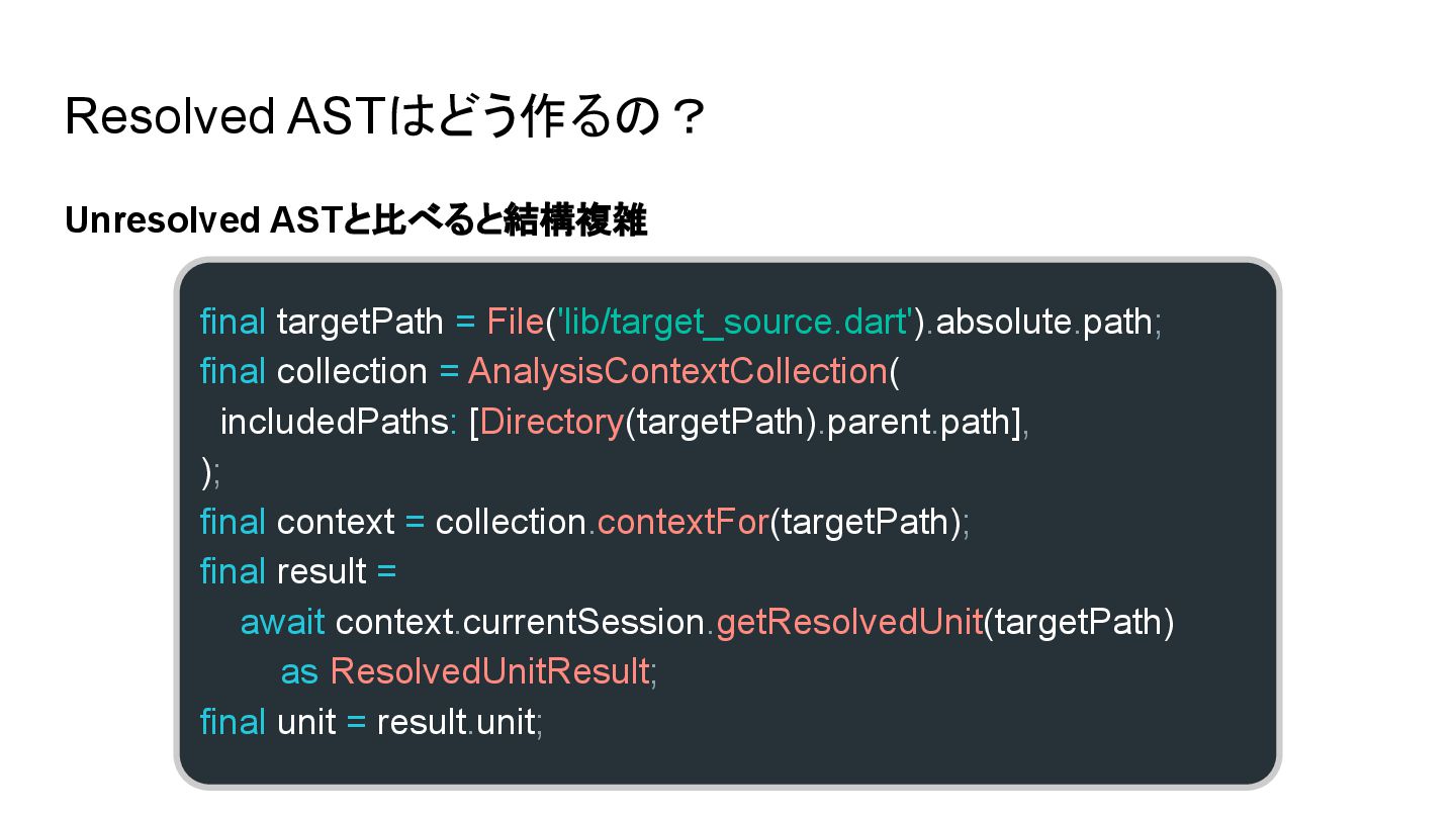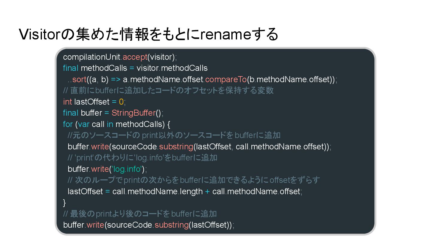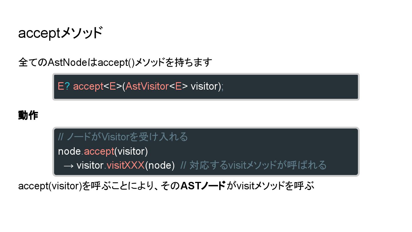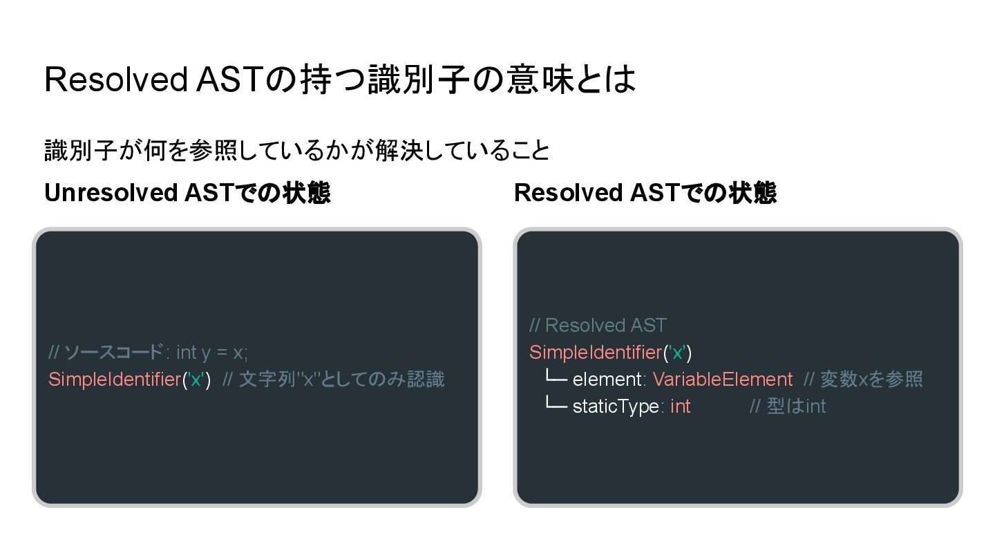{ ... } } // MethodElementが持つ情報 MethodElement { name: 'print', // メソッド名 returnType: void, // 戻り値の型 parameters: [ // パラメータリスト ParameterElement('msg', type: String) ], enclosingElement: ClassElement('Printer'), // 定義クラス // ... その他多くの情報 } どのクラスに定義されているかの情報!