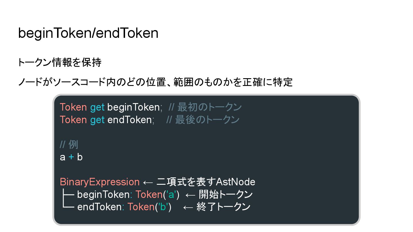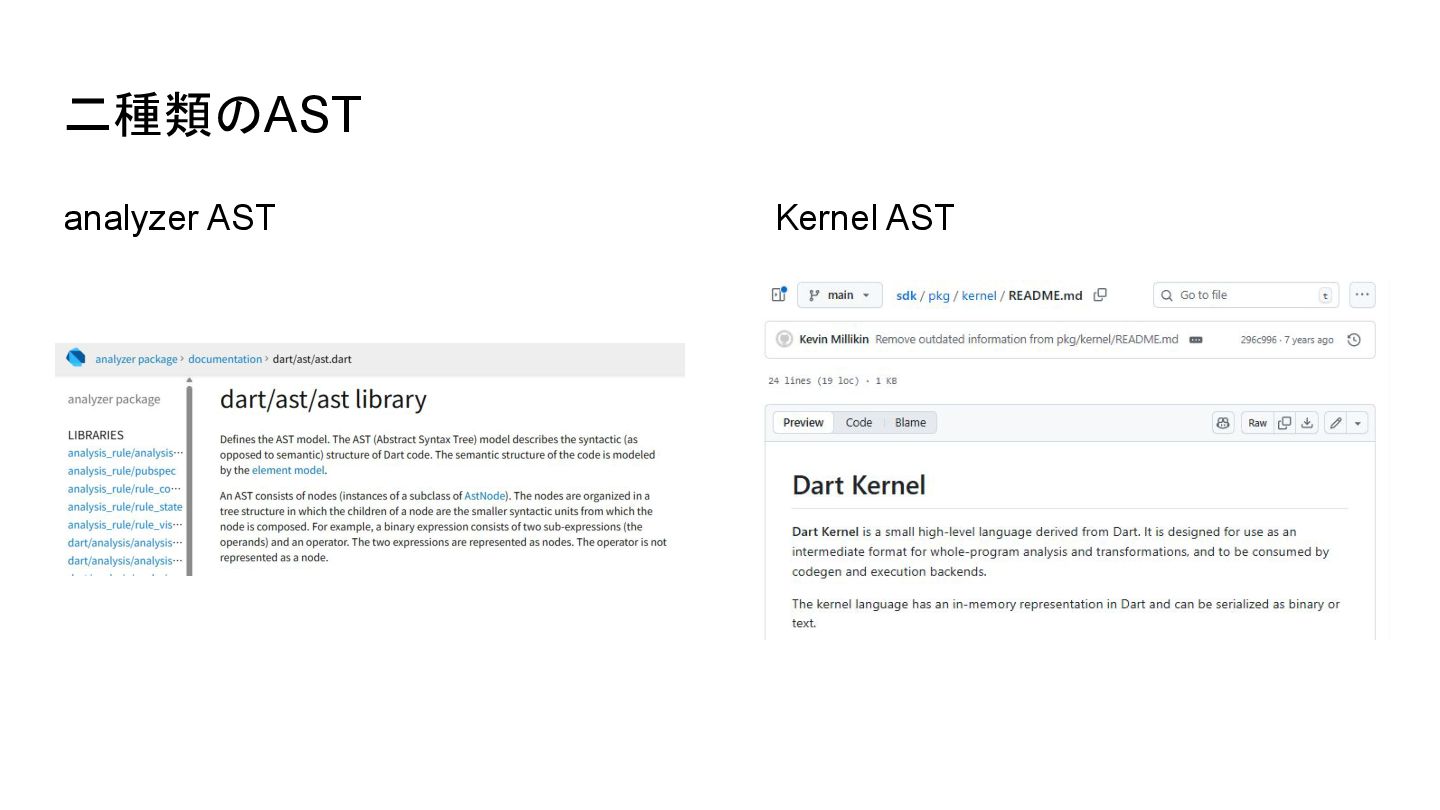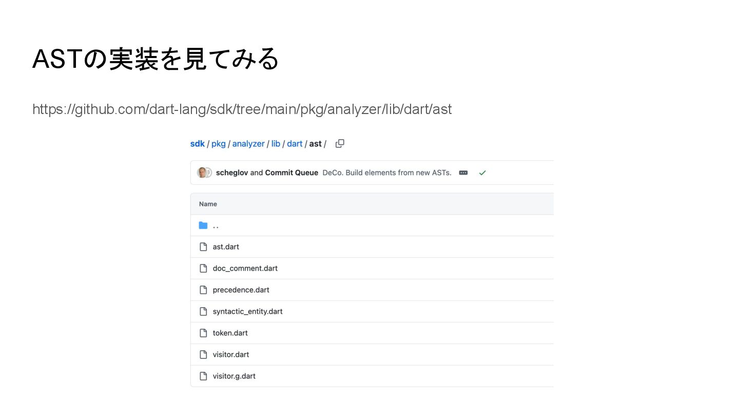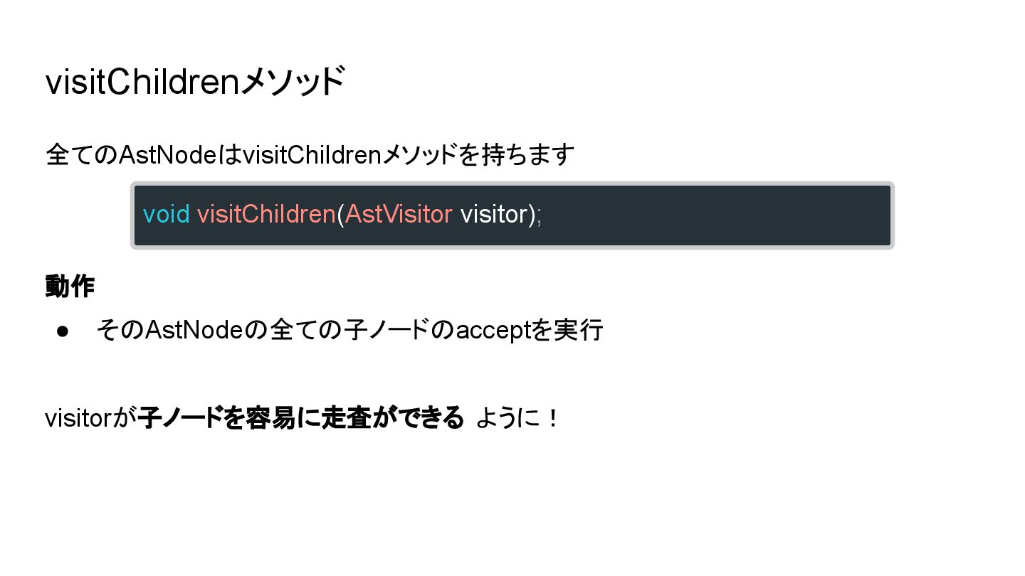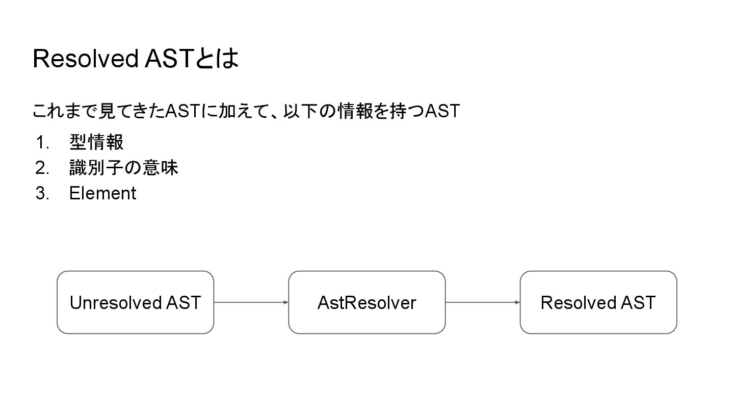 { ... } } // MethodElementが持つ情報 MethodElement { name: 'print', // メソッド名 returnType: void, // 戻り値の型 parameters: [ // パラメータリスト ParameterElement('msg', type: String) ], enclosingElement: ClassElement('Printer'), // 定義クラス // ... その他多くの情報 } どのクラスに定義されているかの情報!