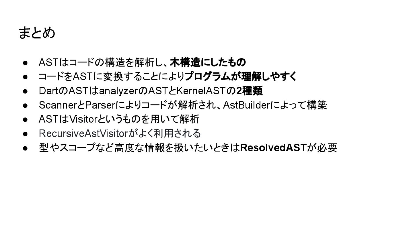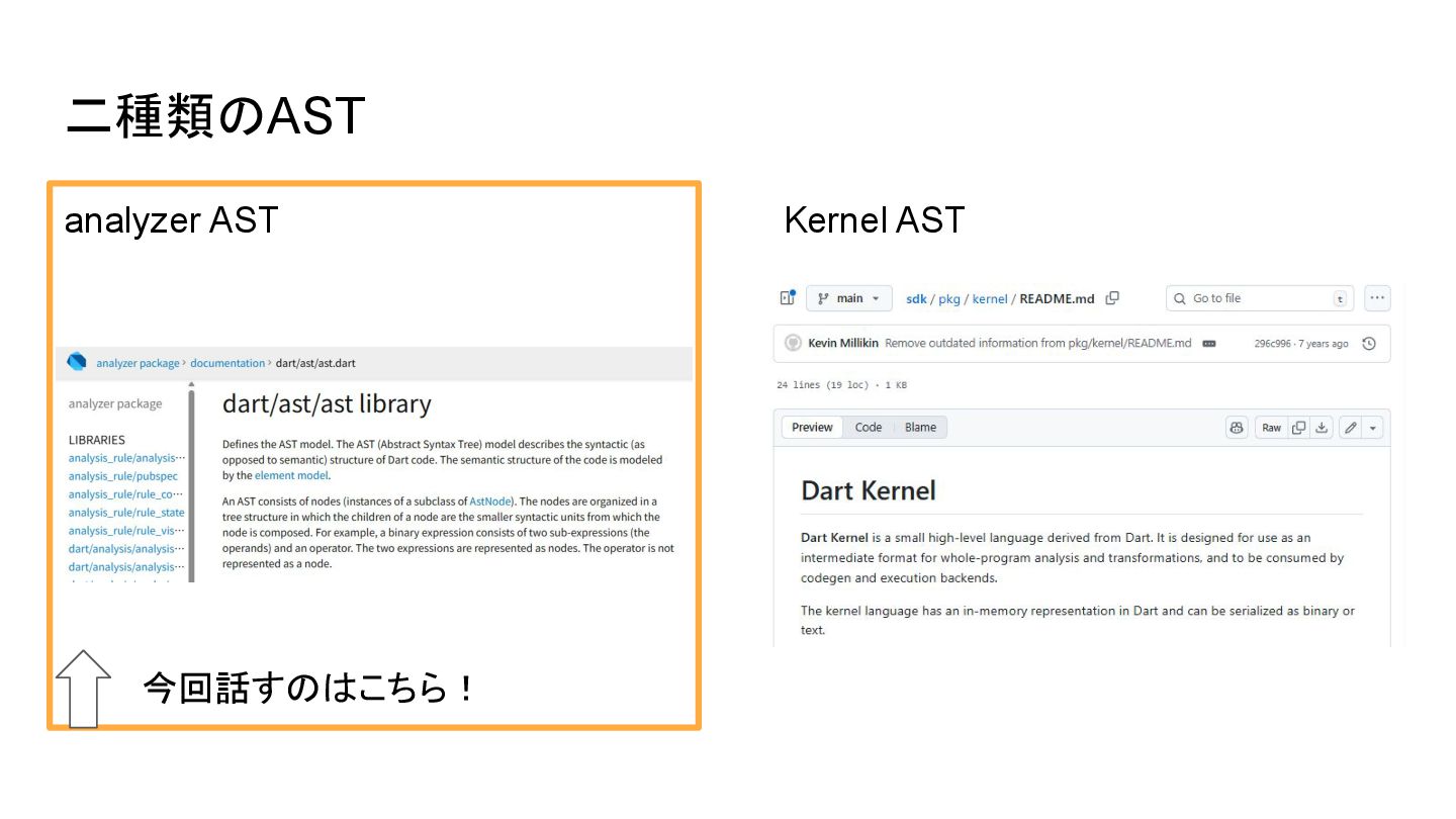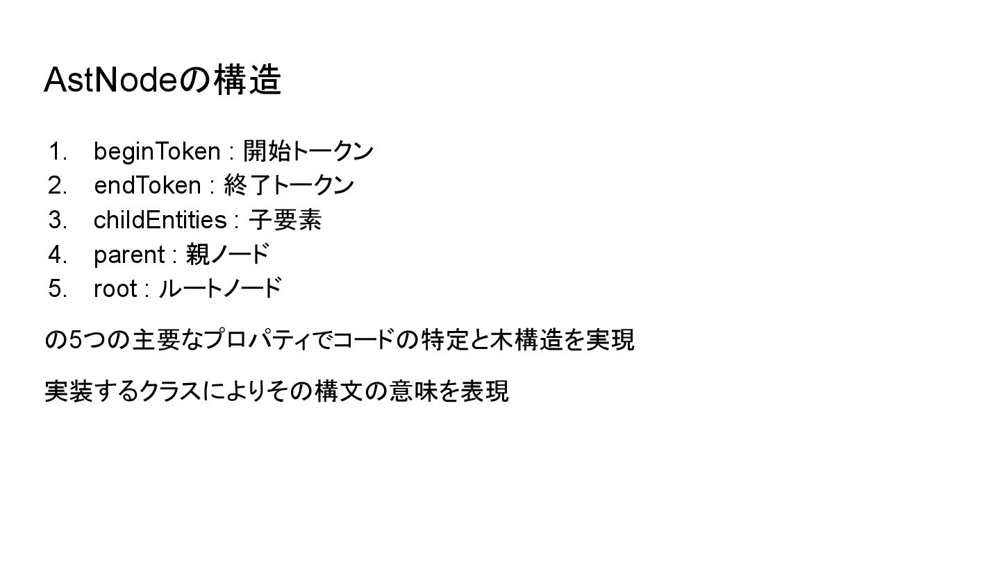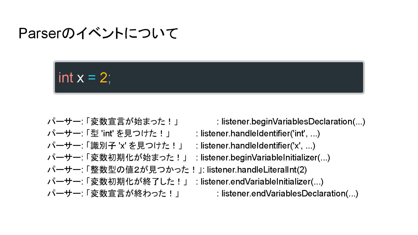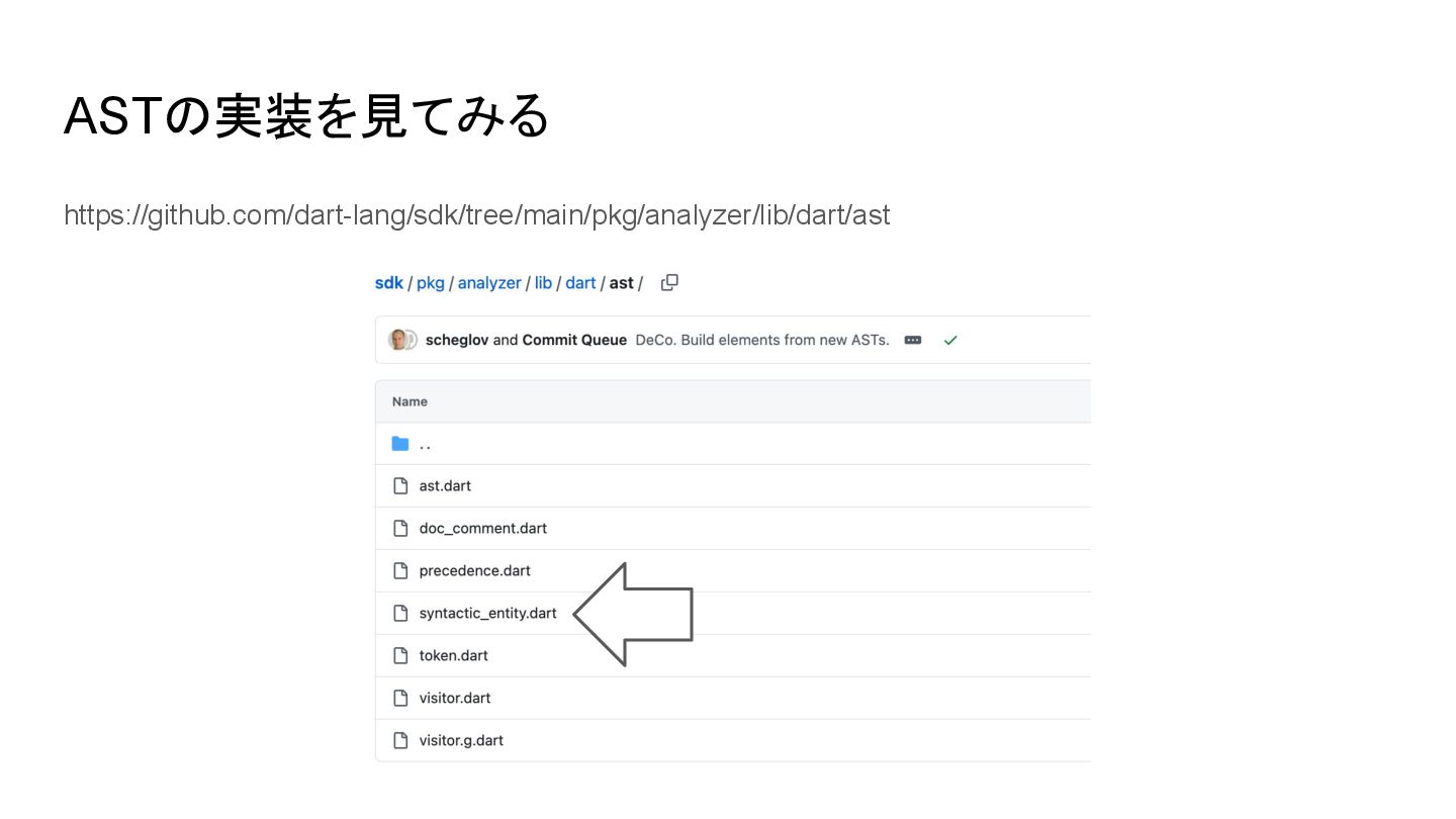 { ... } } // MethodElementが持つ情報 MethodElement { name: 'print', // メソッド名 returnType: void, // 戻り値の型 parameters: [ // パラメータリスト ParameterElement('msg', type: String) ], enclosingElement: ClassElement('Printer'), // 定義クラス // ... その他多くの情報 } どのクラスに定義されているかの情報!