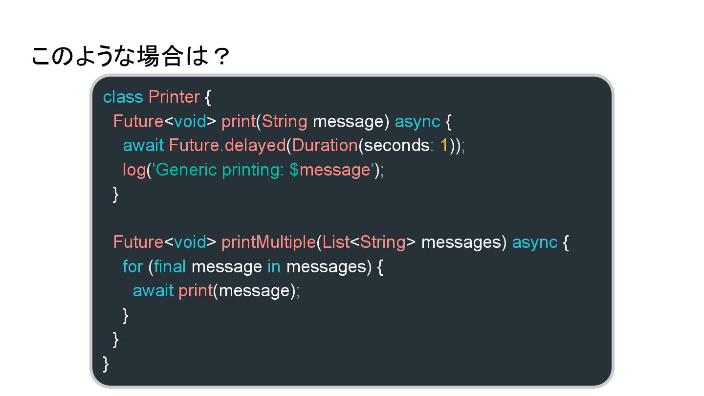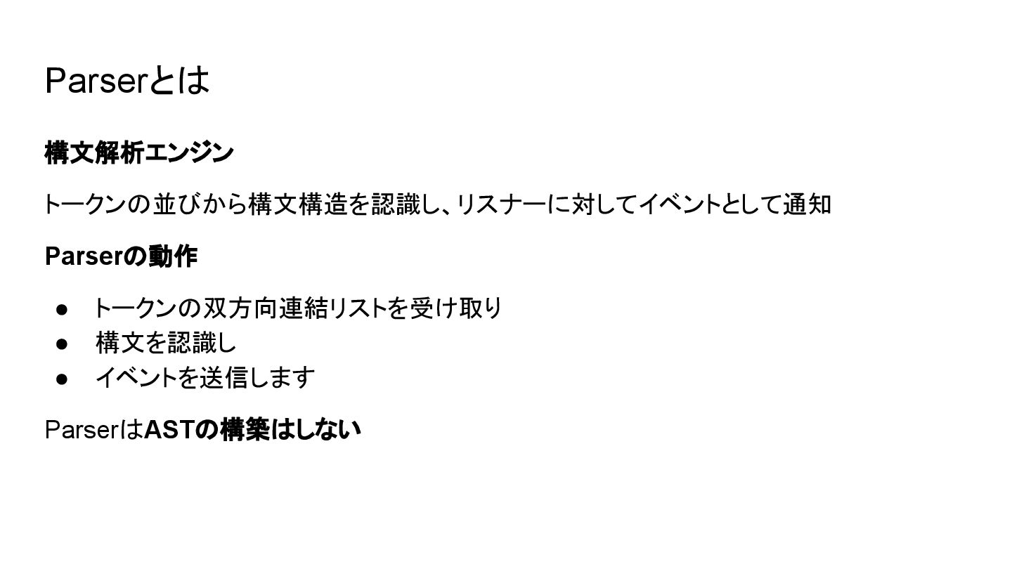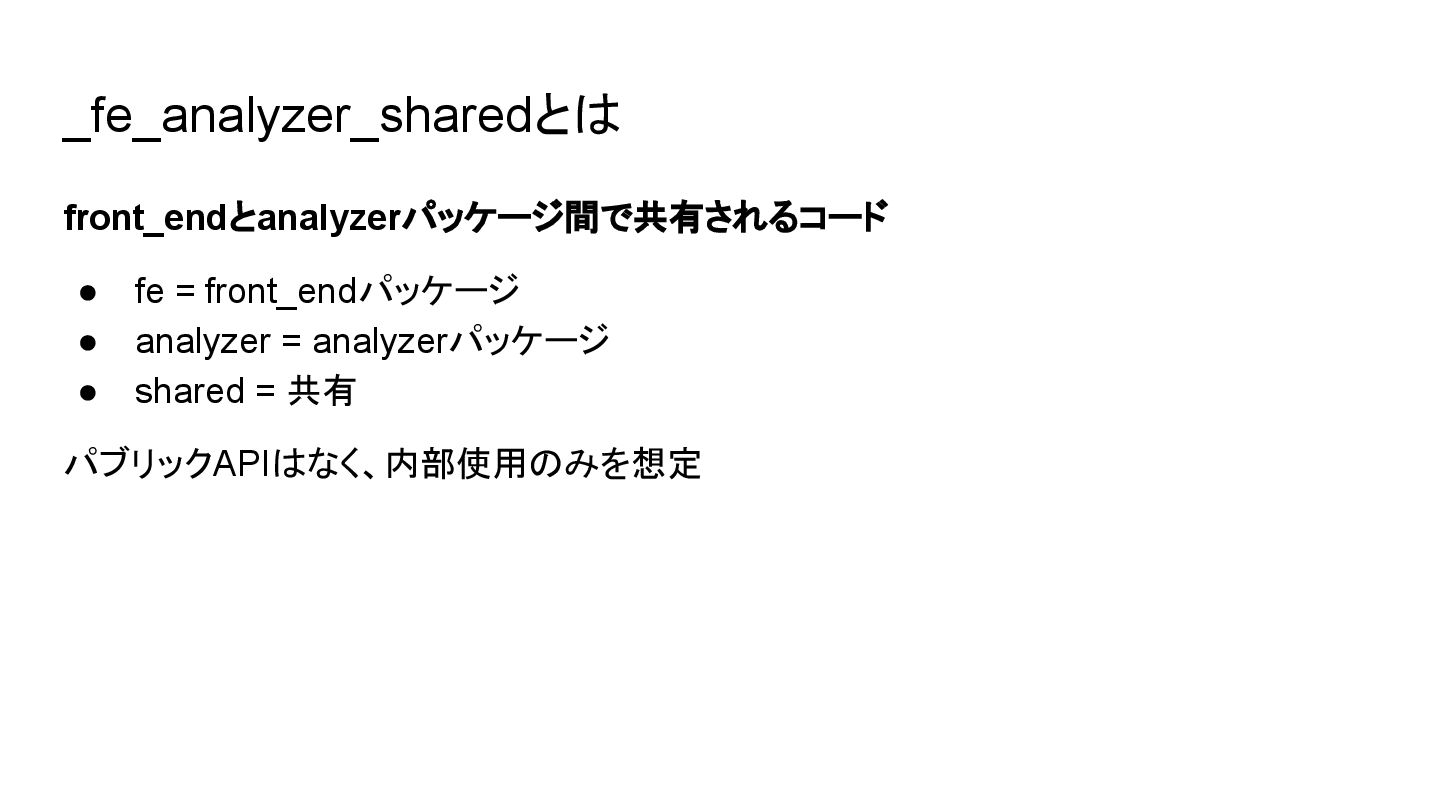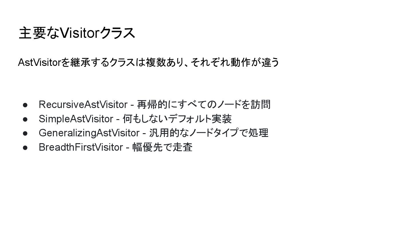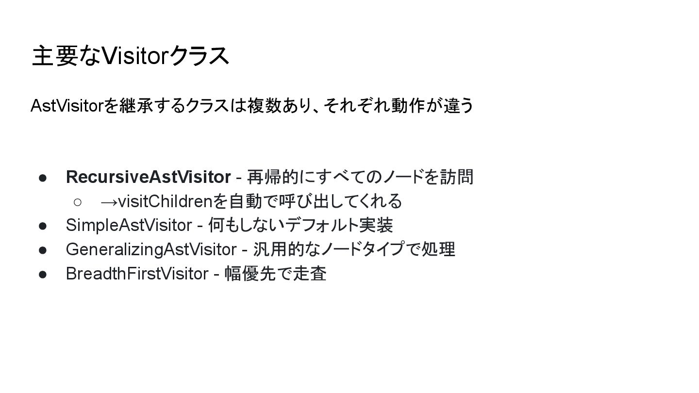 { ... } } // MethodElementが持つ情報 MethodElement { name: 'print', // メソッド名 returnType: void, // 戻り値の型 parameters: [ // パラメータリスト ParameterElement('msg', type: String) ], enclosingElement: ClassElement('Printer'), // 定義クラス // ... その他多くの情報 } どのクラスに定義されているかの情報!