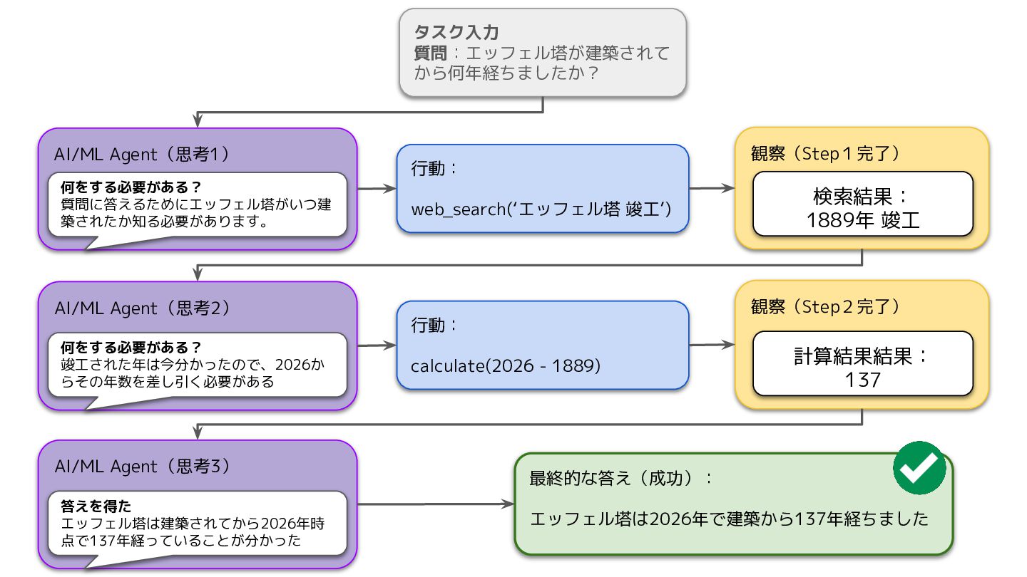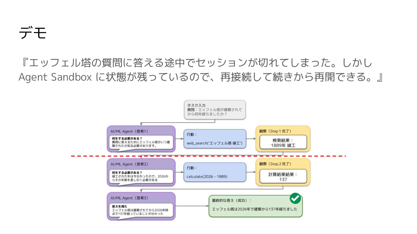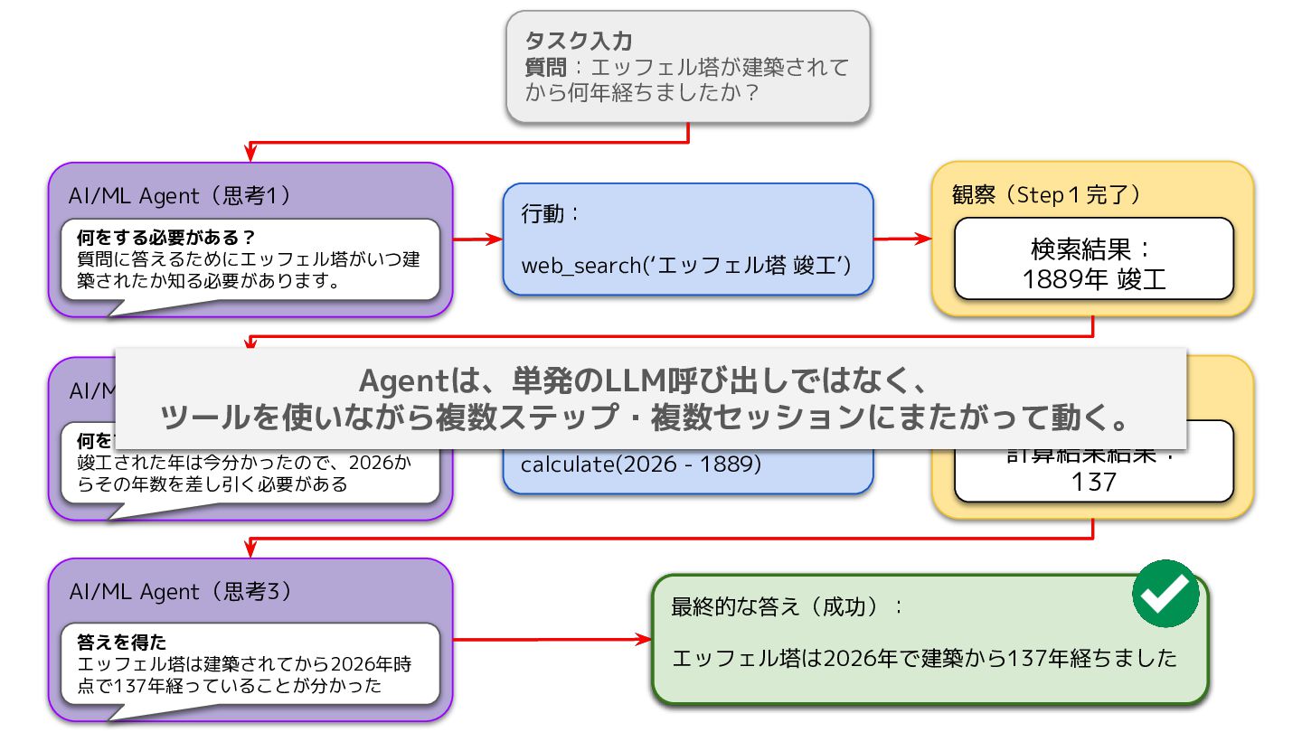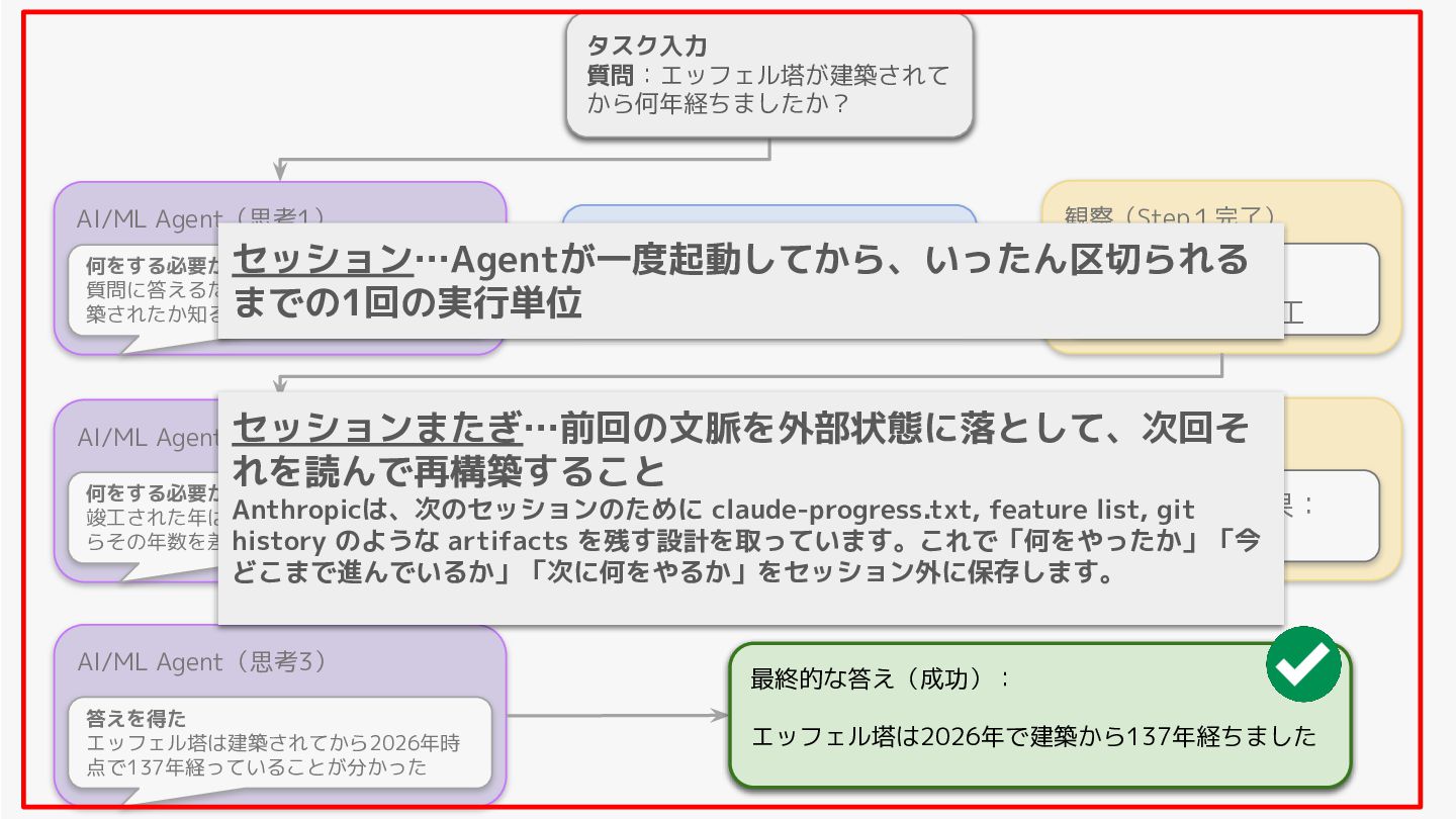 竣工’) 観察(Step1完了) 検索結果: 1889年 竣工 AI/ML Agent(思考2) 何をする必要がある? 竣工された年は今分かったので、2026か らその年数を差し引く必要がある 行動: calculate(2026 - 1889) 観察(Step2完了) 計算結果結果: 137 AI/ML Agent(思考3) 答えを得た エッフェル塔は建築されてから2026年時 点で137年経っていることが分かった 最終的な答え(成功): エッフェル塔は2026年で建築から137年経ちました タスク入力 質問:エッフェル塔が建築されて から何年経ちましたか? 最終的な答え(成功): エッフェル塔は2026年で建築から137年経ちました セッション…Agentが一度起動してから、いったん区切られる までの1回の実行単位 セッションまたぎ…前回の文脈を外部状態に落として、次回そ れを読んで再構築すること Anthropicは、次のセッションのために claude-progress.txt, feature list, git history のような artifacts を残す設計を取っています。これで「何をやったか」「今 どこまで進んでいるか」「次に何をやるか」をセッション外に保存します。