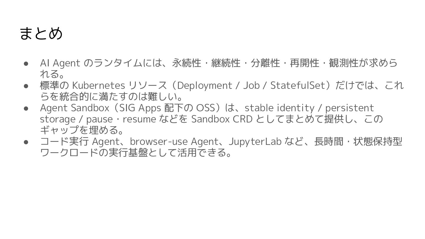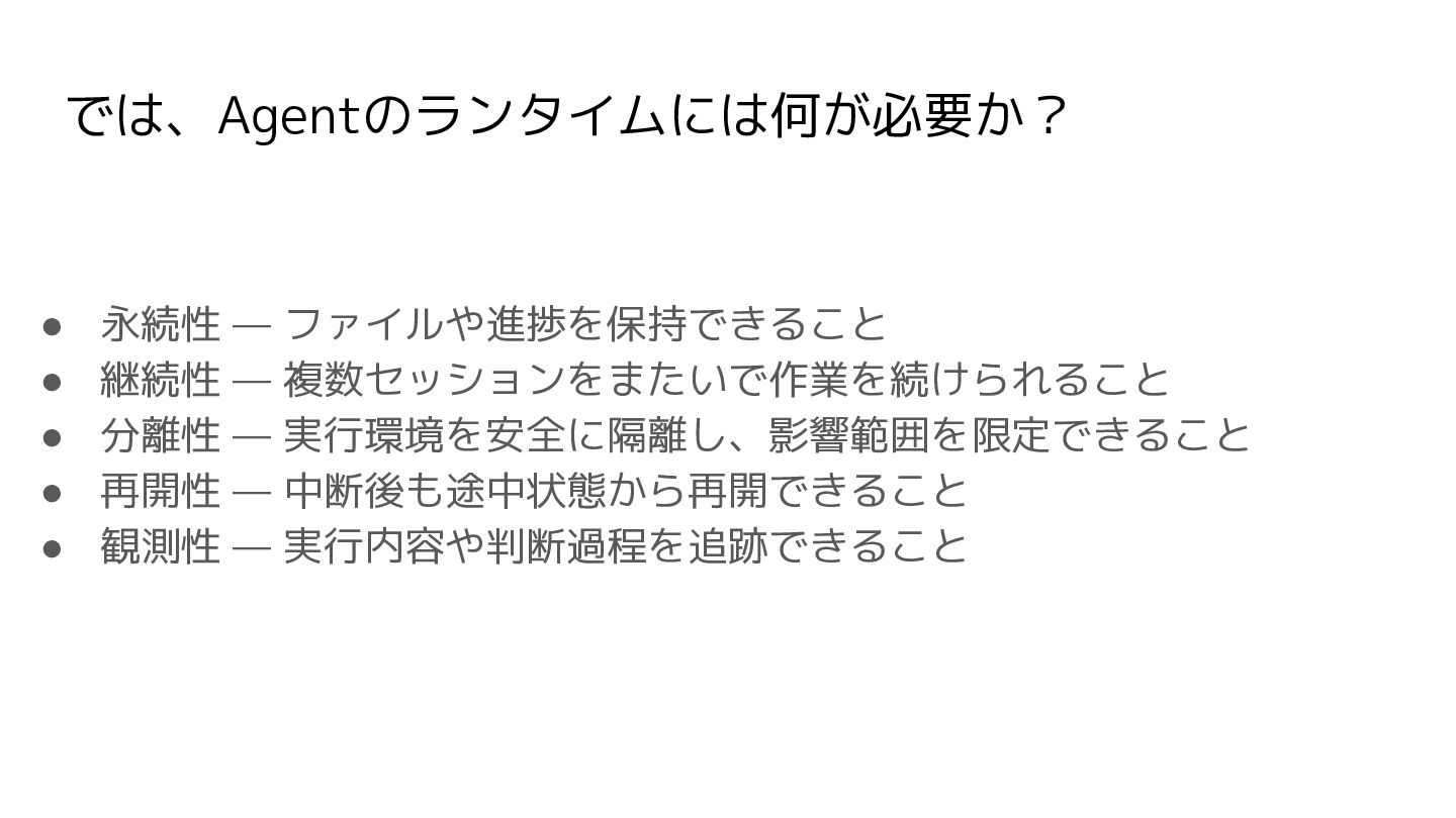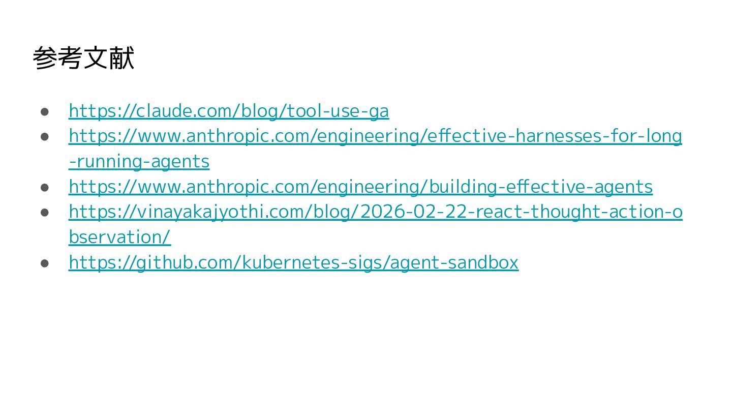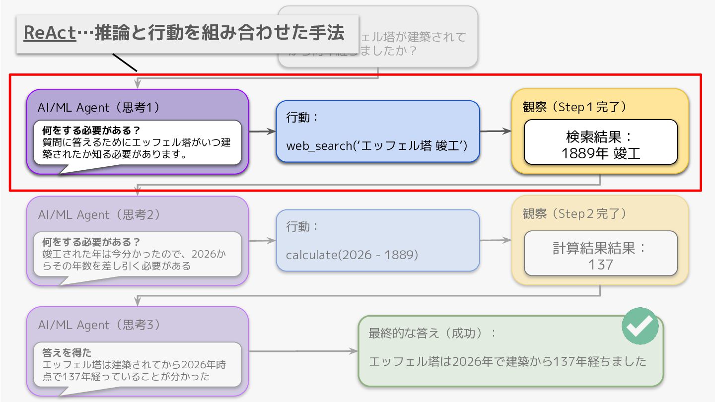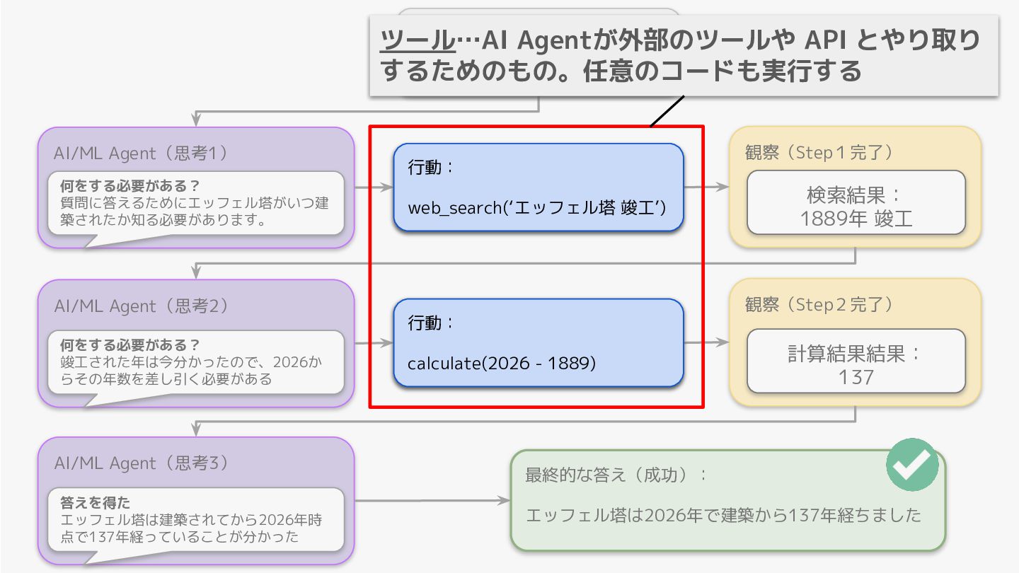 竣工’) 観察(Step1完了) 検索結果: 1889年 竣工 AI/ML Agent(思考2) 何をする必要がある? 竣工された年は今分かったので、2026か らその年数を差し引く必要がある 行動: calculate(2026 - 1889) 観察(Step2完了) 計算結果結果: 137 AI/ML Agent(思考3) 答えを得た エッフェル塔は建築されてから2026年時 点で137年経っていることが分かった 最終的な答え(成功): エッフェル塔は2026年で建築から137年経ちました タスク入力 質問:エッフェル塔が建築されて から何年経ちましたか? 最終的な答え(成功): エッフェル塔は2026年で建築から137年経ちました セッション…Agentが一度起動してから、いったん区切られる までの1回の実行単位 セッションまたぎ…前回の文脈を外部状態に落として、次回そ れを読んで再構築すること Anthropicは、次のセッションのために claude-progress.txt, feature list, git history のような artifacts を残す設計を取っています。これで「何をやったか」「今 どこまで進んでいるか」「次に何をやるか」をセッション外に保存します。