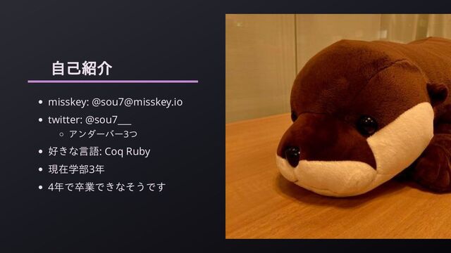 Nat := fun h => match n with | Nat.zero => absurd h (Nat.not_lt_zero 0) | Nat.succ m => m -- checkコマンドは型を表示します。 #check pred -- pred : (n : Nat) → n > 0 → Nat n > 0 では、型が値(項)に依存しています。このような型を依存型といいます。 依存型を持つ言語はLeanの他にCoq、Isabelle、Idrisなどありますが、かなり希少で す。 16