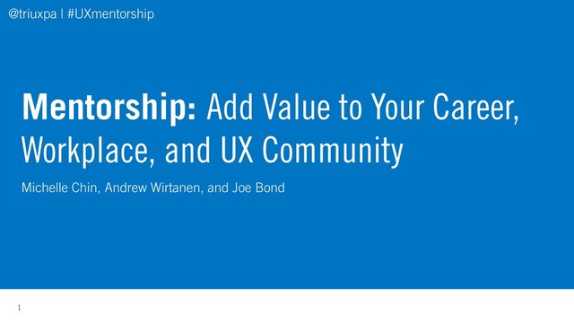 • Meetups • Workplace • Local universities • Professional network (e.g. LinkedIn, Twitter) // HOW TO START Step #2 Nancy: Entry-level UXer, looking for someone to review her portfolio for her next job. Found her mentor Andres through the mentorship program with her local UXPA chapter. Toby: UXer who’s a team of one at a startup. Wants to every other month to see what trends are going on with other UX practices. Found his mentor Maya at a UX meetup. Patty: Senior UX designer interested in advancing her career. Wants to mentor junior- level designers to see if she’d like management. Found her mentee Melissa on her team.