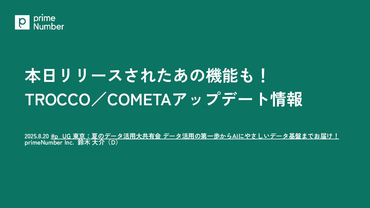 本日リリースされたあの機能も! TROCCO/COMETAアップデート情報 2025.8.20 #p_UG 東京:夏のデータ活用大共有会 データ活用の第一歩からAIにやさしいデータ基盤までお届け! primeNumber Inc. 鈴木 大介(D)