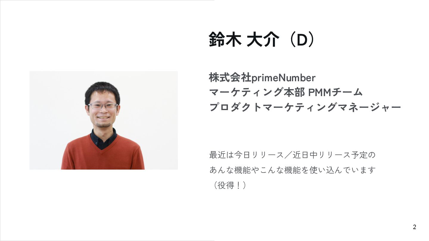 2 鈴木 大介(D) 株式会社primeNumber マーケティング本部 PMMチーム プロダクトマーケティングマネージャー 最近は今日リリース/近日中リリース予定の あんな機能やこんな機能を使い込んでいます (役得!)
