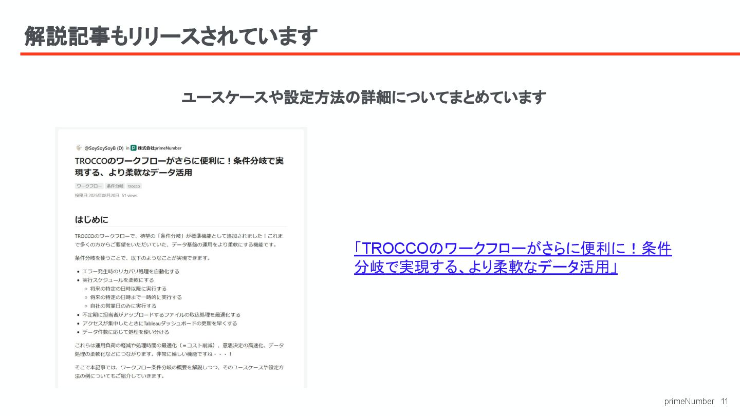 primeNumber 解説記事もリリースされています ユースケースや設定方法の詳細についてまとめています 11 「TROCCOのワークフローがさらに便利に!条件 分岐で実現する、より柔軟なデータ活用」