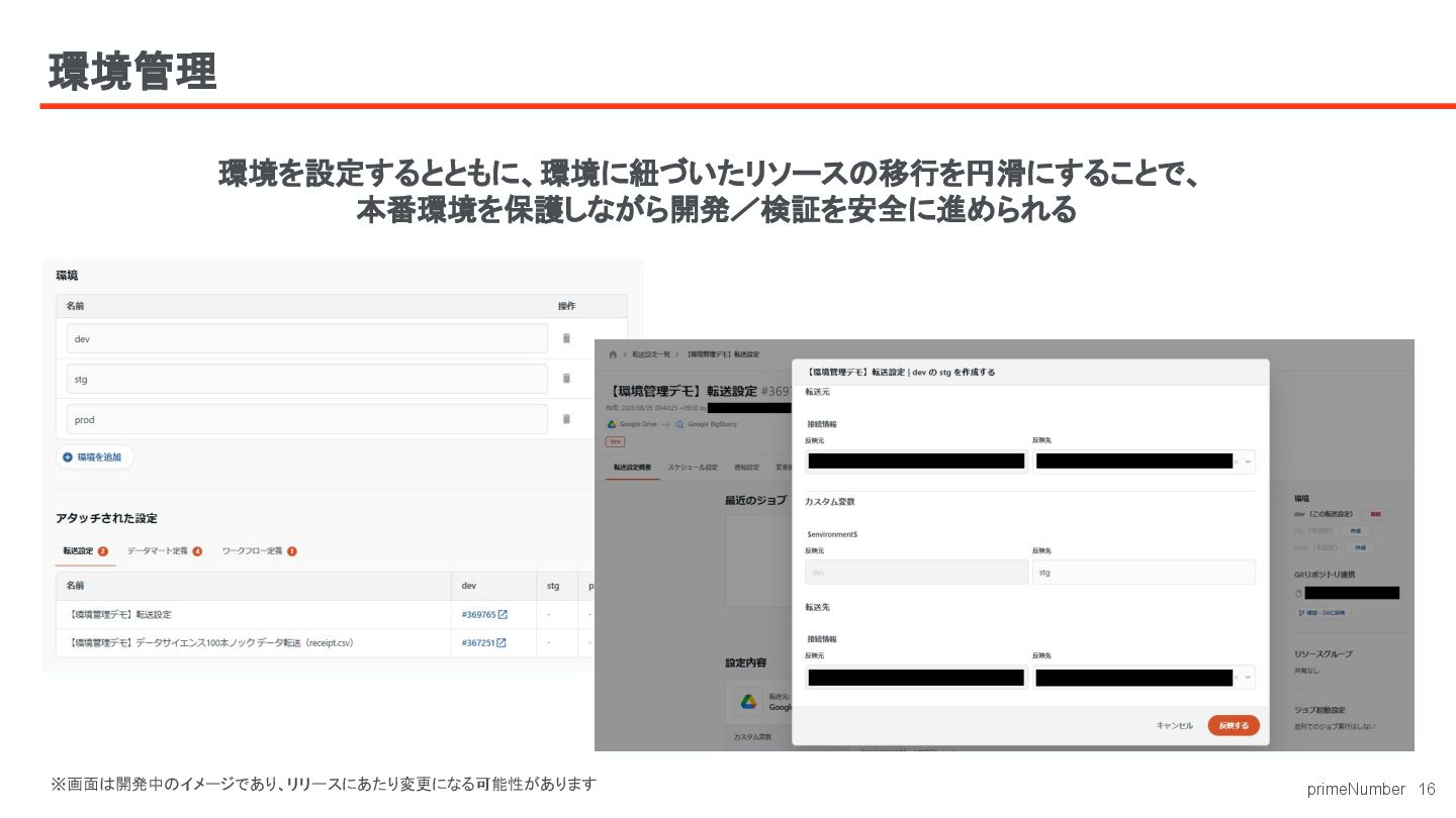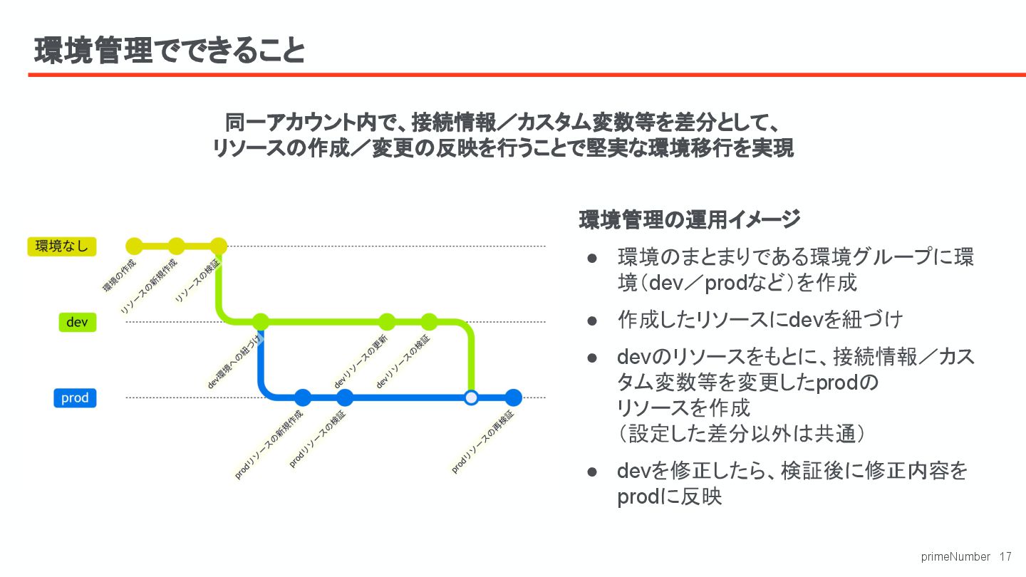primeNumber 環境管理 環境を設定するとともに、環境に紐づいたリソースの移行を円滑にすることで、 本番環境を保護しながら開発/検証を安全に進められる 16 ※画面は開発中のイメージであり、リリースにあたり変更になる可能性があります