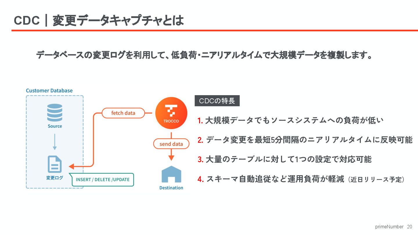 primeNumber CDC|変更データキャプチャとは データベースの変更ログを利用して、低負荷・ニアリアルタイムで大規模データを複製します。 1. 大規模データでもソースシステムへの負荷が低い 2. データ変更を最短5分間隔のニアリアルタイムに反映可能 3. 大量のテーブルに対して1つの設定で対応可能 4.