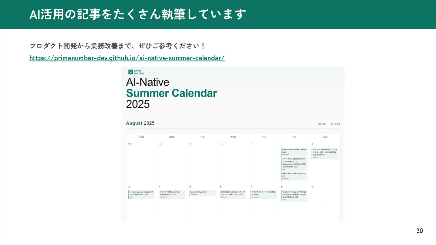 30 AI活用の記事をたくさん執筆しています プロダクト開発から業務改善まで、ぜひご参考ください! https://primenumber-dev.github.io/ai-native-summer-calendar/