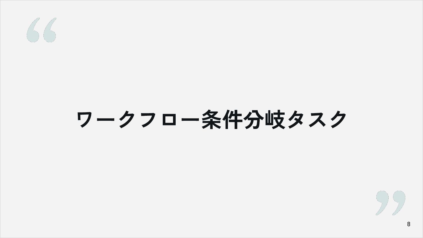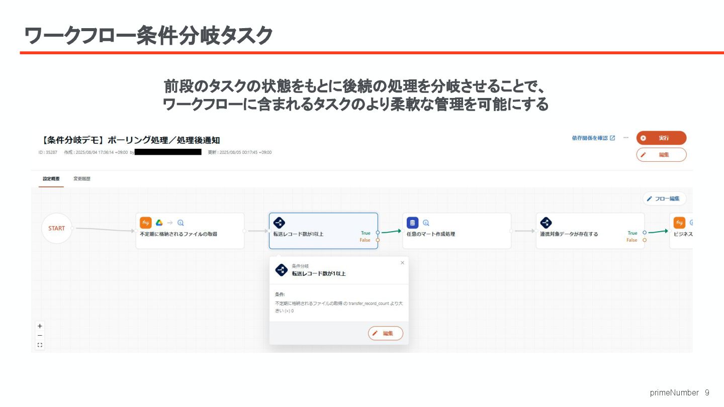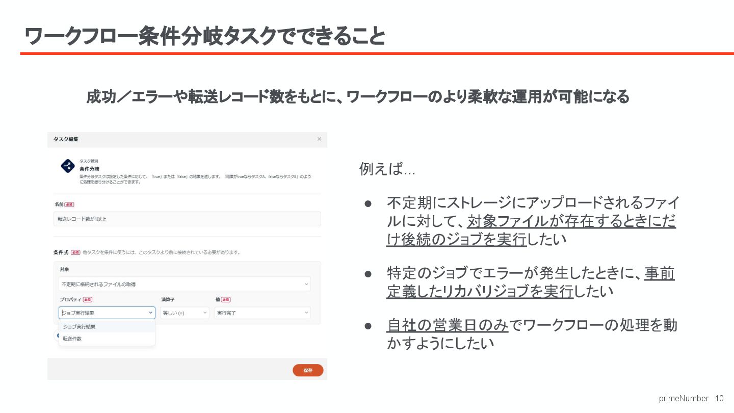primeNumber ワークフロー条件分岐タスク 前段のタスクの状態をもとに後続の処理を分岐させることで、 ワークフローに含まれるタスクのより柔軟な管理を可能にする 9