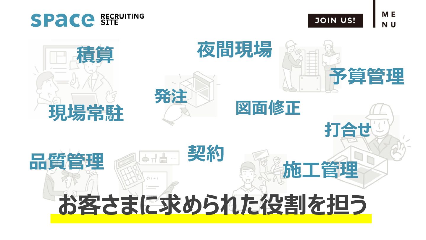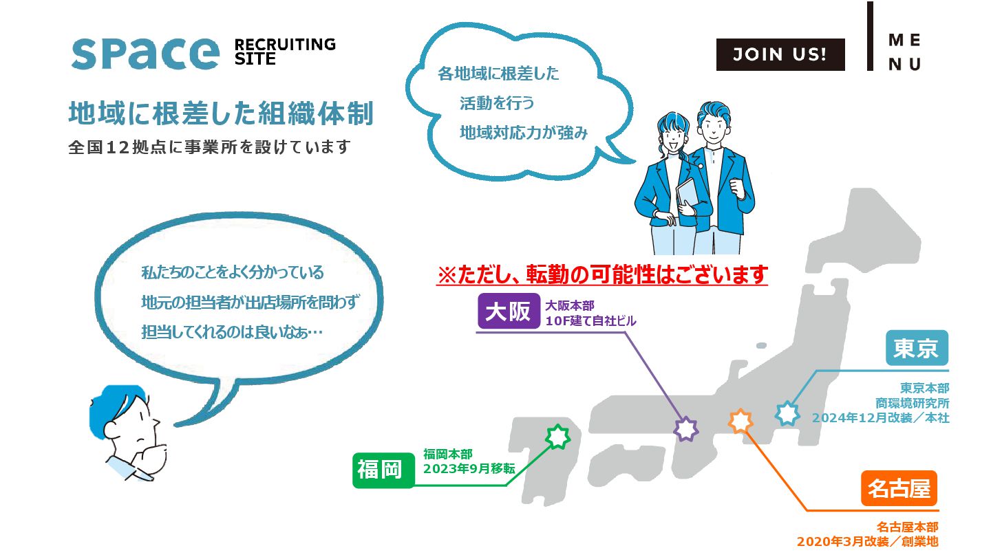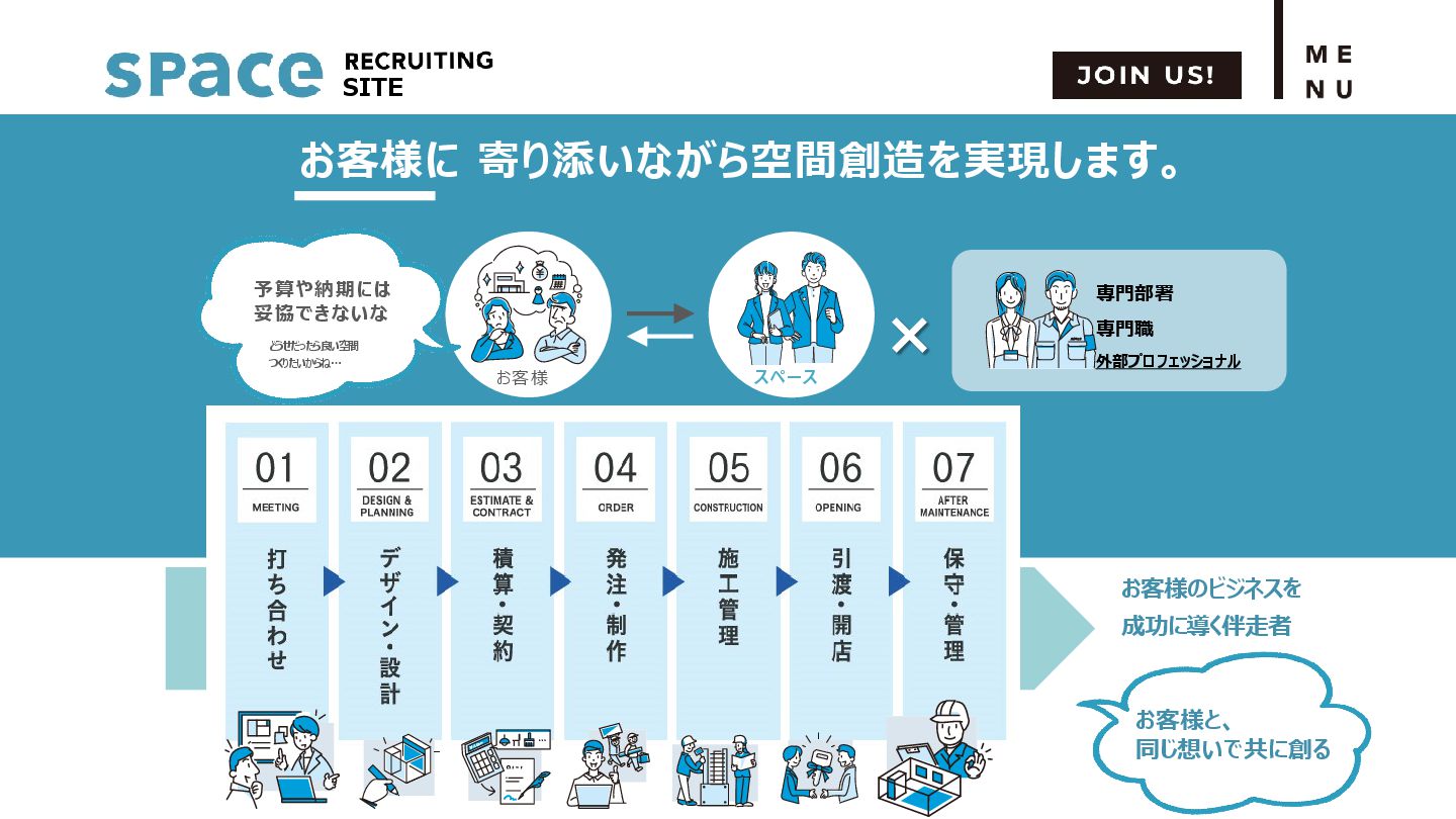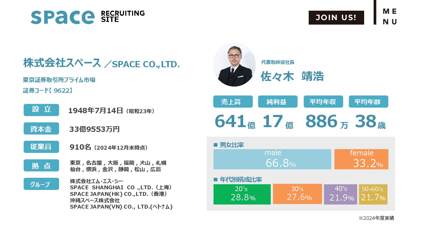 資本金 33億9553万円 従業員 拠 点 東京 , 名古屋 , 大阪 , 福岡 , 犬山 , 札幌 仙台 , 横浜 , 金沢 , 静岡 , 松山 , 広島 グループ 株式会社エム・エス・シー SPACE SHANGHAI CO .,LTD.(上海) SPACE JAPAN(HK) CO.,LTD.(香港) 沖縄スペース株式会社 SPACE JAPAN(VN) CO., LTD.(ベトナム) female 33.2% male 66.8% 28.8% 20’s 東京証券取引所プライム市場 証券コード【 9622】 27.6% 30’s 40’s 21.9% 50-60’s 21.7% 886 平均年収 38 平均年齢 641 売上高 17 純利益 億 億 万 歳 ▪ 男女比率 ▪ 年代別構成比率 SITE ※2024年度実績