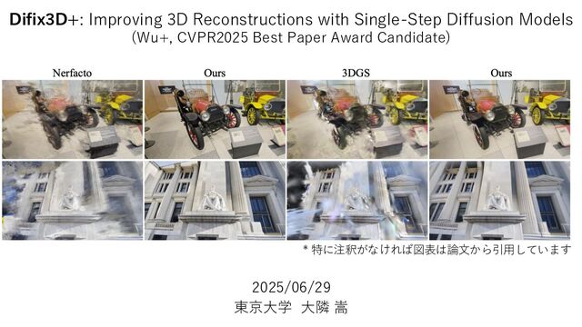 - NeRFや3DGSにおける極端な視点からのレンダリングのアーティファクトを、単一ステップ拡散モデル「Difix」で除去するDifix3D+を提案 - Difixは、3D再構成時にアーティファクト付きのビューをクリーンアップして品質を向上させ、推論時にはリアルタイムでアーティファクトを除去 - NeRFと3DGSの両方に対応し、既存手法よりFIDスコアを平均2倍改善しつつ3Dの一貫性を維持