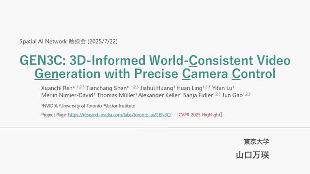 東京大学 Spatial AI Network 勉強会 (2025/7/22) Xuanchi Ren* 1,2,3 Tianchang Shen* 1,2,3 Jiahui Huang1 Huan Ling1,2,3 Yifan Lu1 Merlin Nimier-David1 Thomas Müller1 Alexander Keller1 Sanja Fidler1,2,3 Jun Gao1,2,3 1NVIDIA 2University of Toronto 3Vector Institute Project Page: https://research.nvidia.com/labs/toronto-ai/GEN3C/ [CVPR 2025 Highlight]