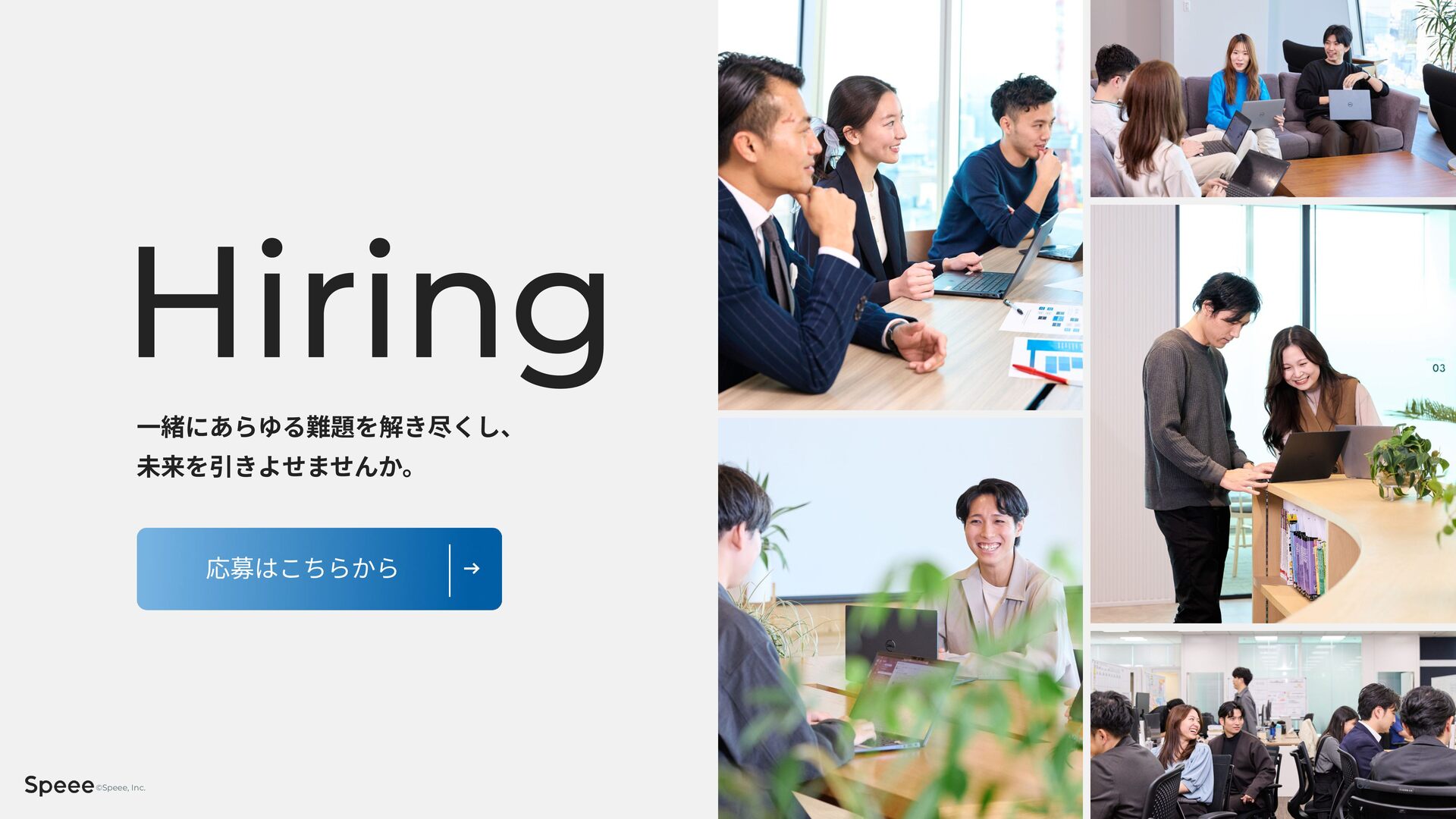 期⽇の死守と期待成果の両⽴にこだわる。両 ⽅を⾼次元で達成させようとする組織こそ成 ⻑する企業の条件である。 テクノロジーは成果を⾶躍的に伸ばす。私た ちは技術発想を根幹にもち、技術を活かして ⼤きな効率化‧創造をもたらす集団である。 他部署の存在のおかげで、⾃部署の業務が成 り⽴つ。私たちは得られる情報や経験の差を 認識し、理解を深め、協⼒しあえる組織であ る。 02 本質の⾒極め 01 組織成⻑への貢献 04 プラステクノロジー 03 スピード&クオリティ 05 他部署への尊重、感謝 期待されているレベルを超えた成果は、当事 者意識によって創出され、成果者の成⻑を加 速させる。私たちは、常に期待以上の価値を 提供する意識を強く持っている。 やらされる仕事からは⾼い成果は⽣まれな い。⾃ら責任を取りに⾏く姿勢で仕事に挑む ことによって、更なる成⻑機会を得られる。 複数要因が絡まない業務は滅多になく、他責 に陥る要素は常にある。闇雲に⾃責をするの ではなく、責任の領域を広げようとしていく 意識の⾼いメンバーに、⼤きな信頼が寄せら れる。 企業倫理への理解が希薄な企業に永続的な繁 栄はない。⼀個⼈として社内外のルール厳守 は当然とし、Speeeブランドに忠誠を誓い、 社会に誇れる組織を形成しよう。 プロフェッショナルは実⾏にこだわる。成否 の分かれ道は、シンプルに完遂⼒に依存して いる。 07 脱‧受け⾝ 06 期待+α 09 法令とモラルの遵守 08 他責の否定 10 Execution Speee 15 を形成する の約束 限られた時間の中で成果を最⼤化するには、 効率が先、創造が後である。創造まで成し遂 げてこそ、真に価値あるアウトプットにな る。 激しく変わりゆく環境下で更なる成⻑を果た せるのは、企業成⻑につながる変化を楽し み、また、それを主体的に起こす⼈材であ る。 素直‧謙虚‧率直はひとりの⼈間として忘れ てはならないスタンスである。永続的に成⻑ していける⼈は仕事や⼈に正直で且つ客観的 に⾃分を⾒つめられる。 ネガティブな報告こそスピーディーに吸いあ がる組織は、リスク対応⼒が⾼い。私たちは 全体最適を考え、リスク対応の感度が優れて いる組織である。 継続的な成⻑とはインプットとアウトプット の循環により実現される。良質なアウトプッ トの前提となるインプットのために、知的好 奇⼼を開放しよう。 12 変化を楽しむ 11 創造のための効率化 14 迅速なリスク対応 13 素直‧謙虚‧率直 15 知的好奇⼼の探究 Speeeの文化 Chapter 05 ©Speee, Inc. 45