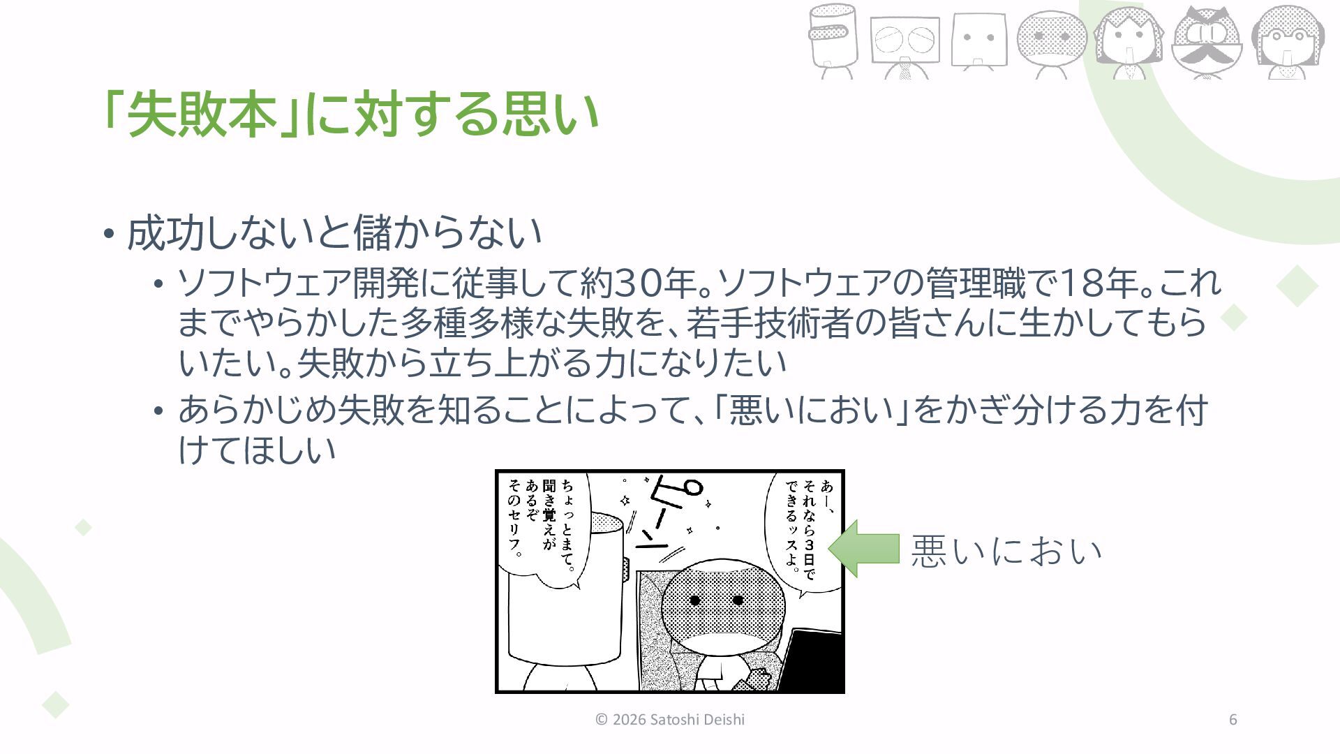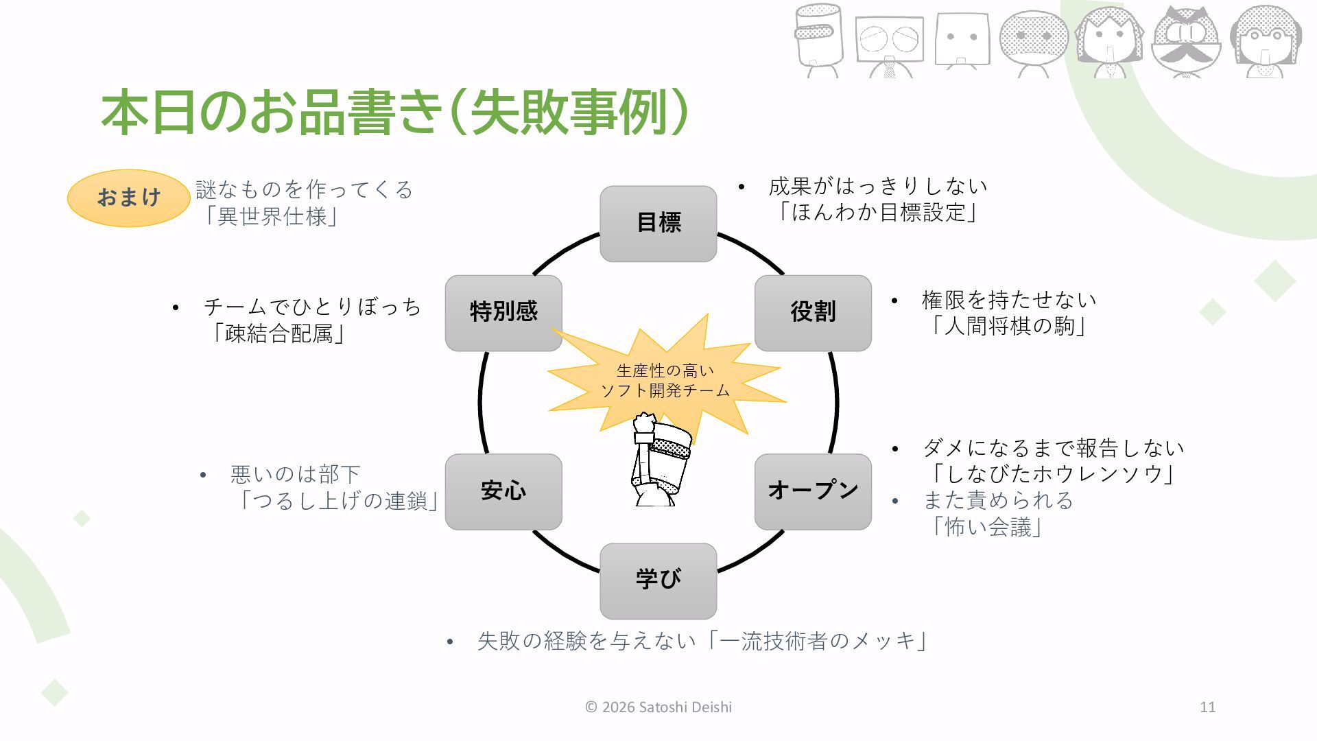 6. 本日のお品書き(失敗事例) © 2026 Satoshi Deishi 11 目標 役割 オープン 学び