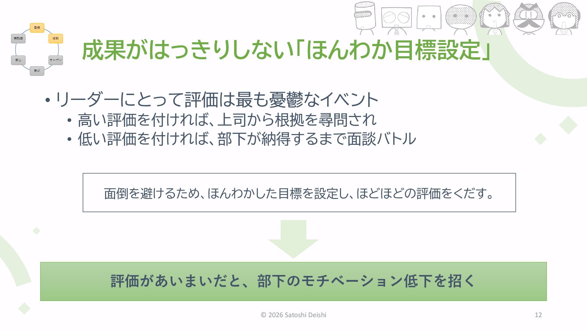 Deishi 12 目標 役割 オープン 学び 安心 特別感 評価があいまいだと、部下のモチベーション低下を招く 面倒を避けるため、ほんわかした目標を設定し、ほどほどの評価をくだす。