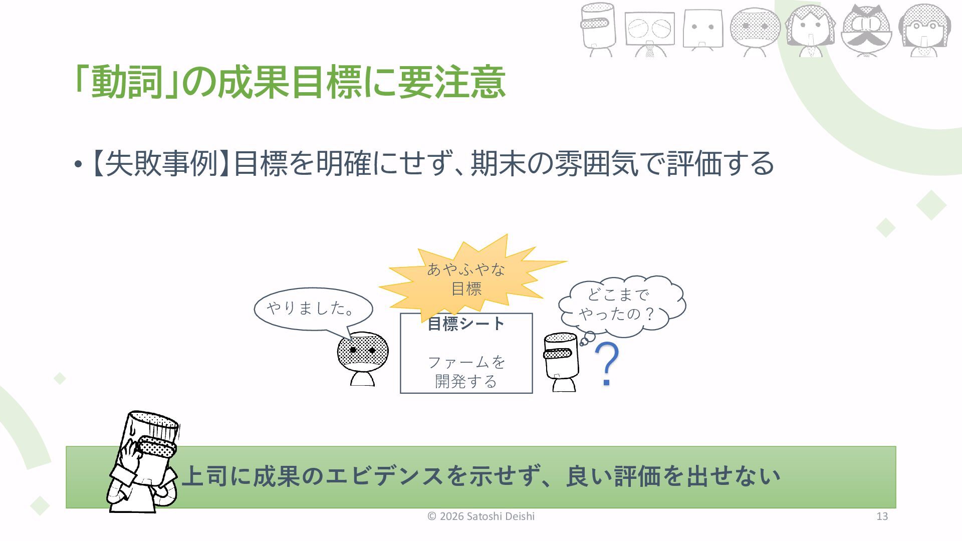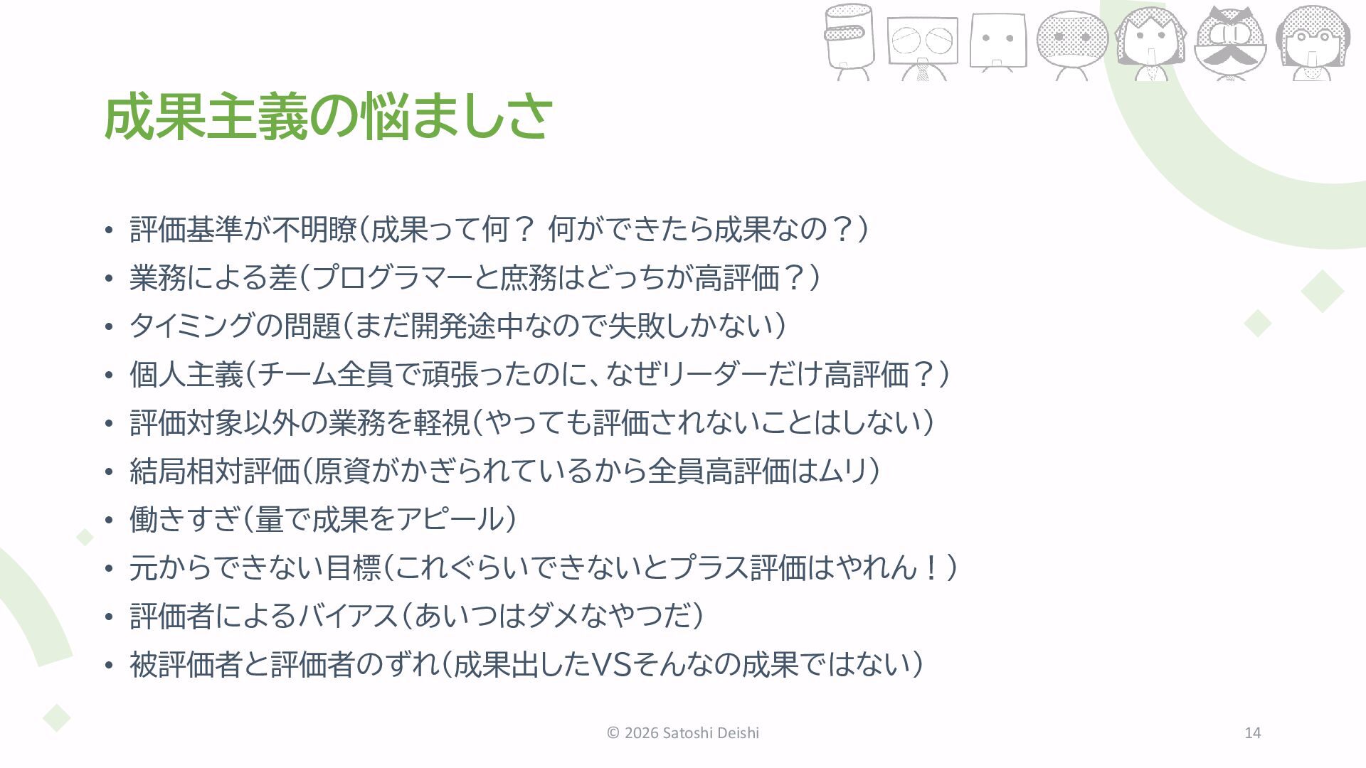 7. 成果がはっきりしない「ほんわか目標設定」 • リーダーにとって評価は最も憂鬱なイベント • 高い評価を付ければ、上司から根拠を尋問され • 低い評価を付ければ、部下が納得するまで面談バトル © 2026 Satoshi